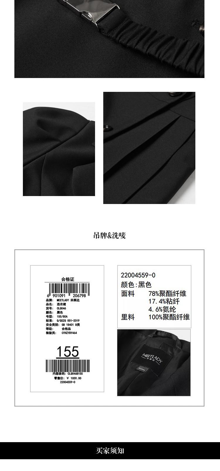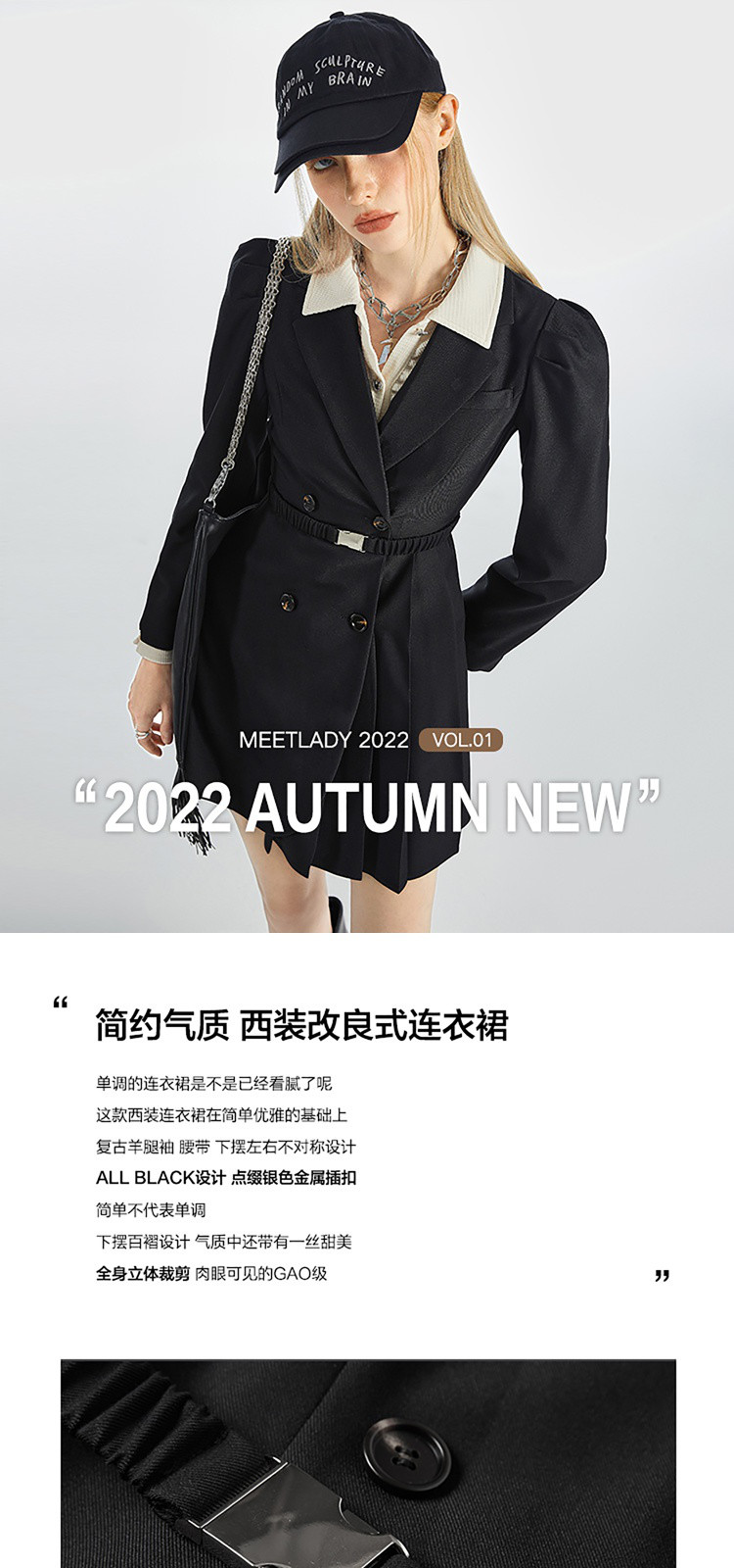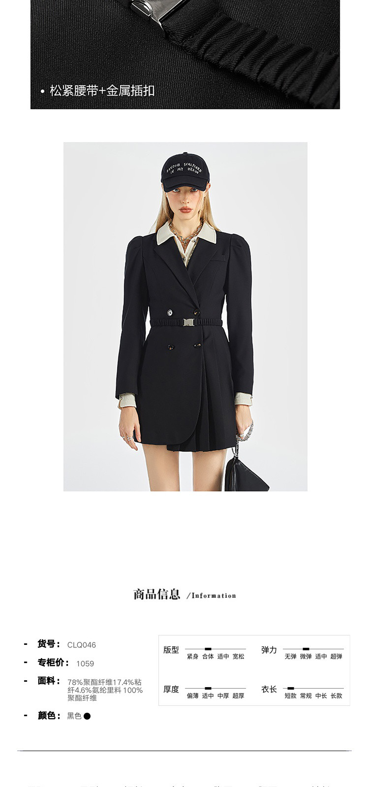 商品名称:显瘦腰带春秋黑色西装连衣裙女法式收腰长袖百褶裙 545940