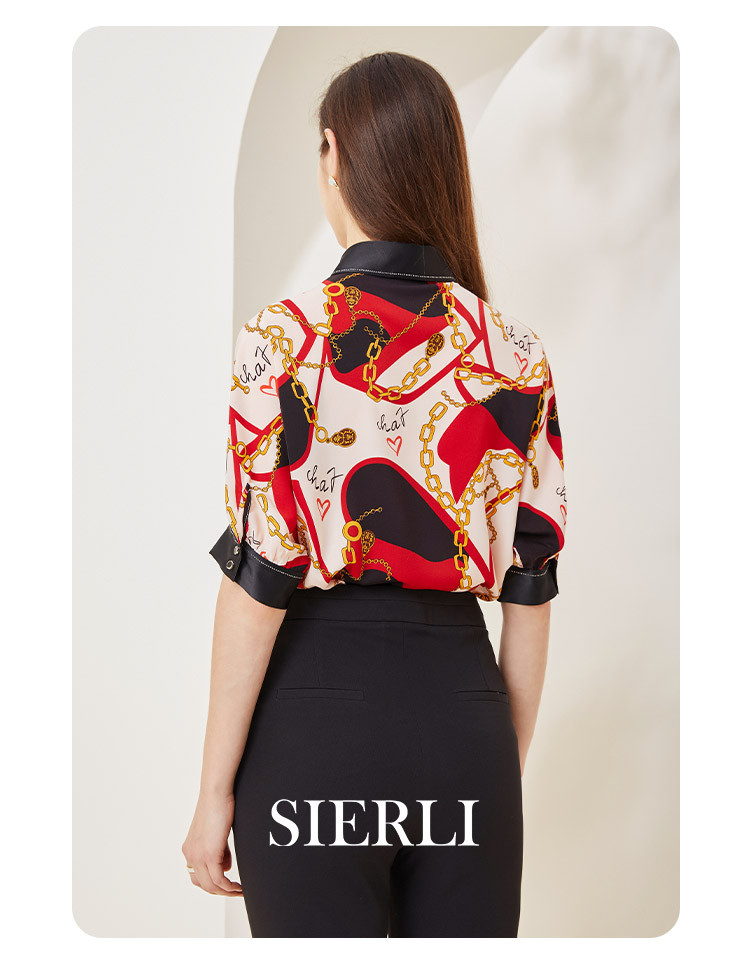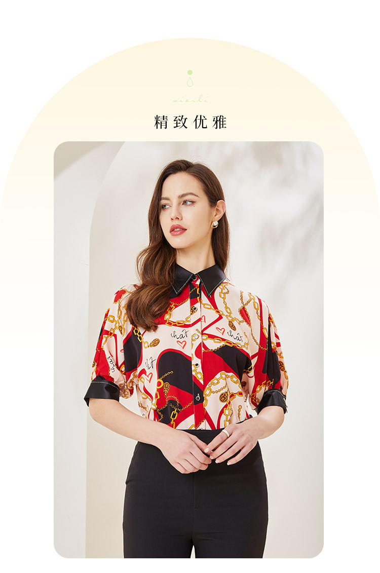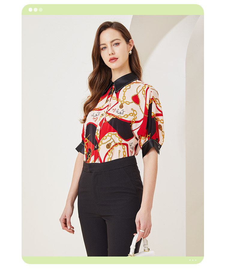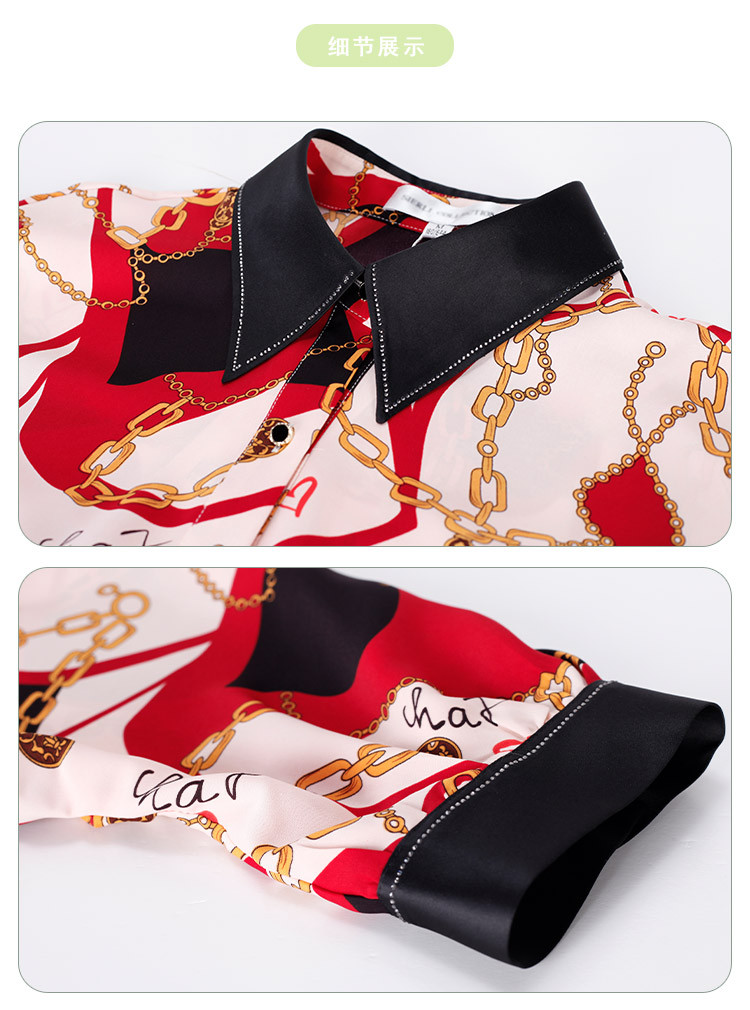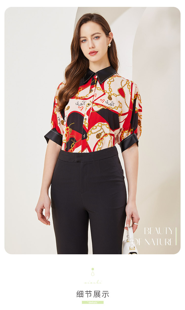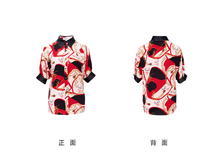 商品名称:商场同款秋季赫本风法式印花优雅撞色宽松烫钻5分袖衬衣 590303