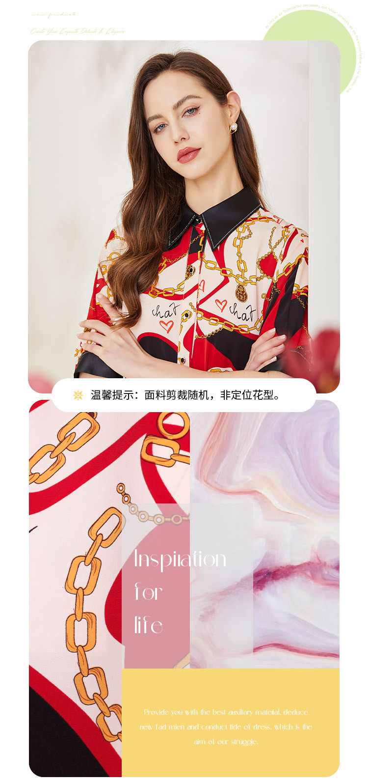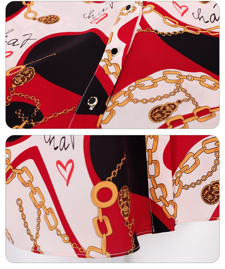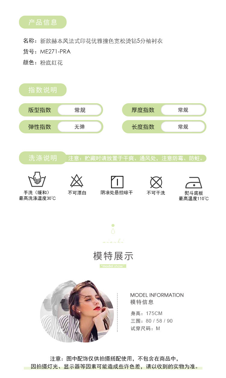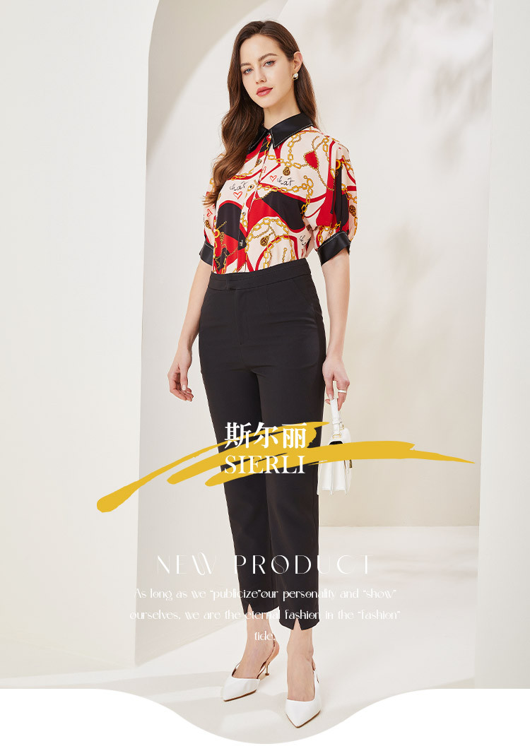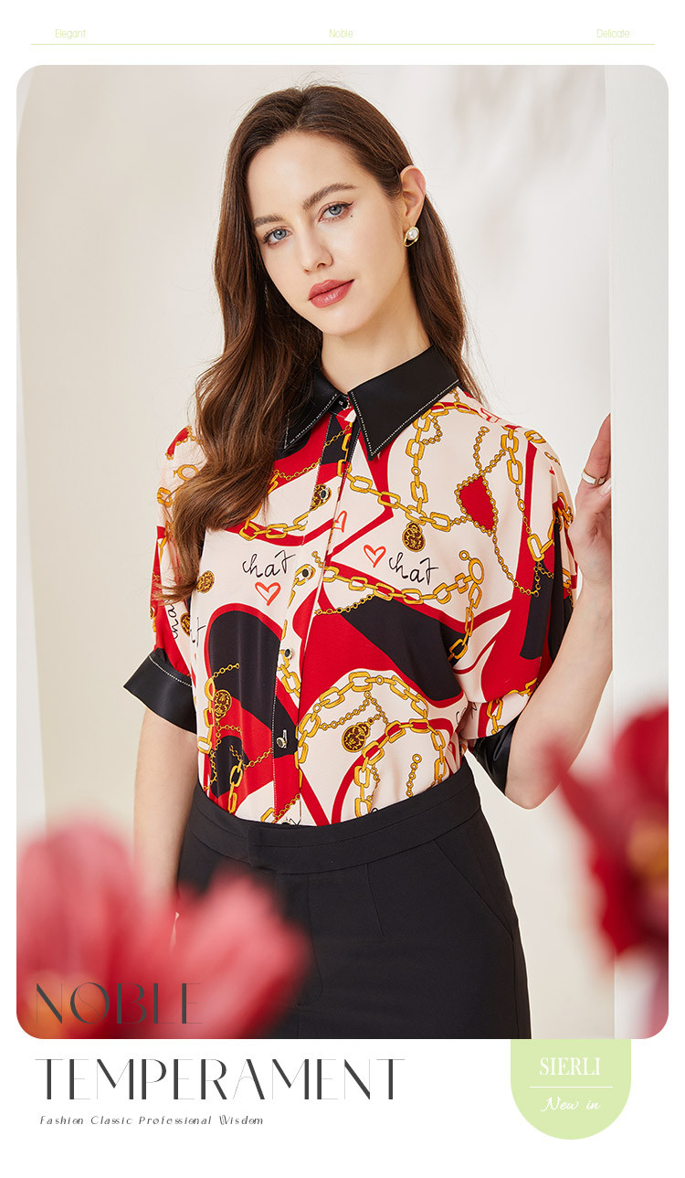 商品名称:商场同款秋季赫本风法式印花优雅撞色宽松烫钻5分袖衬衣 590303