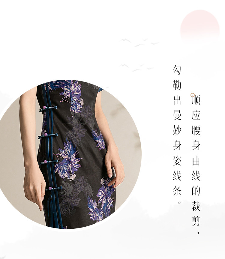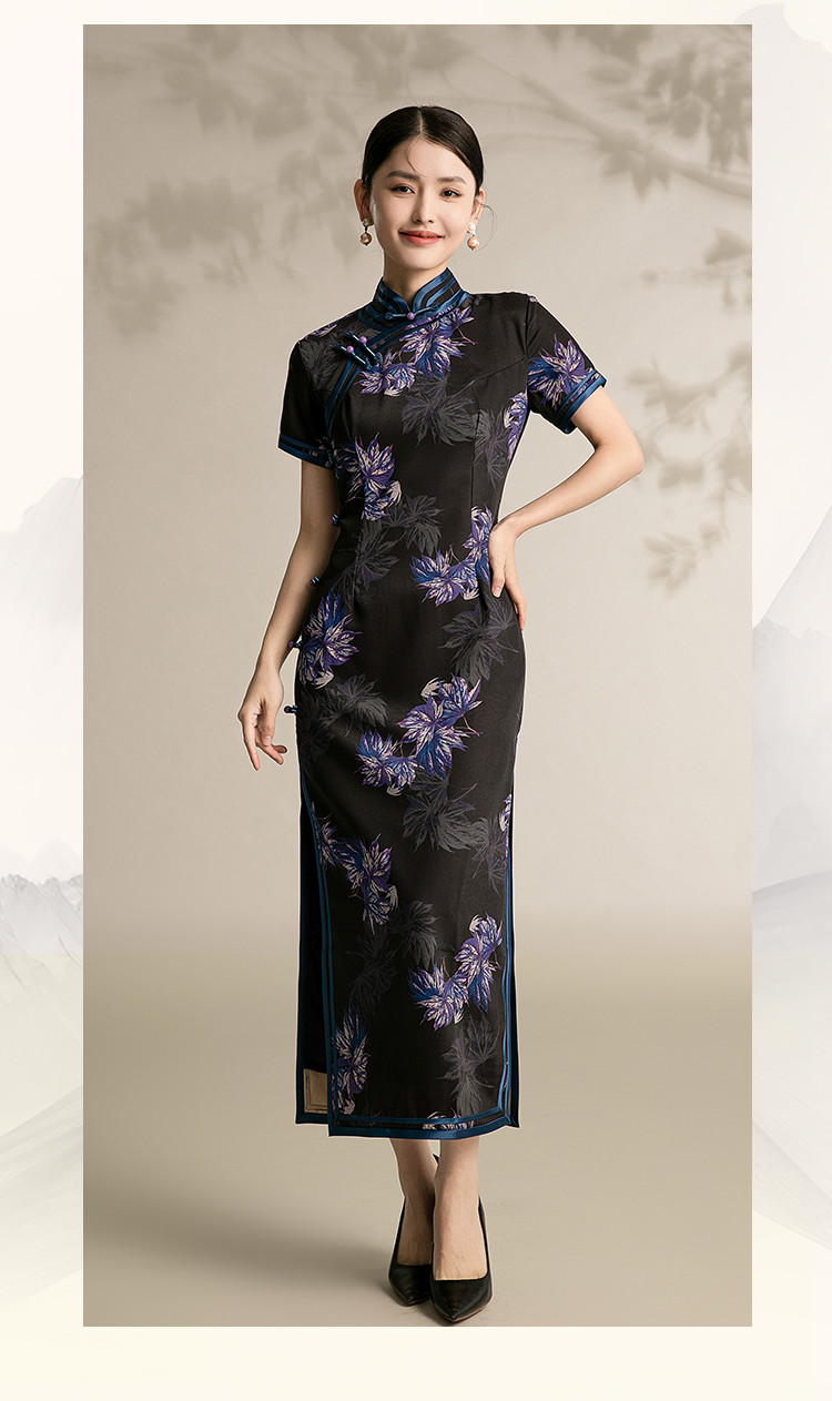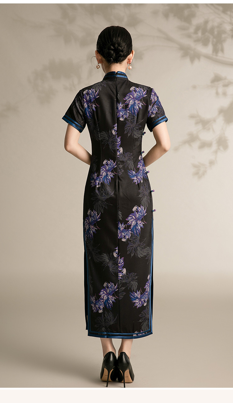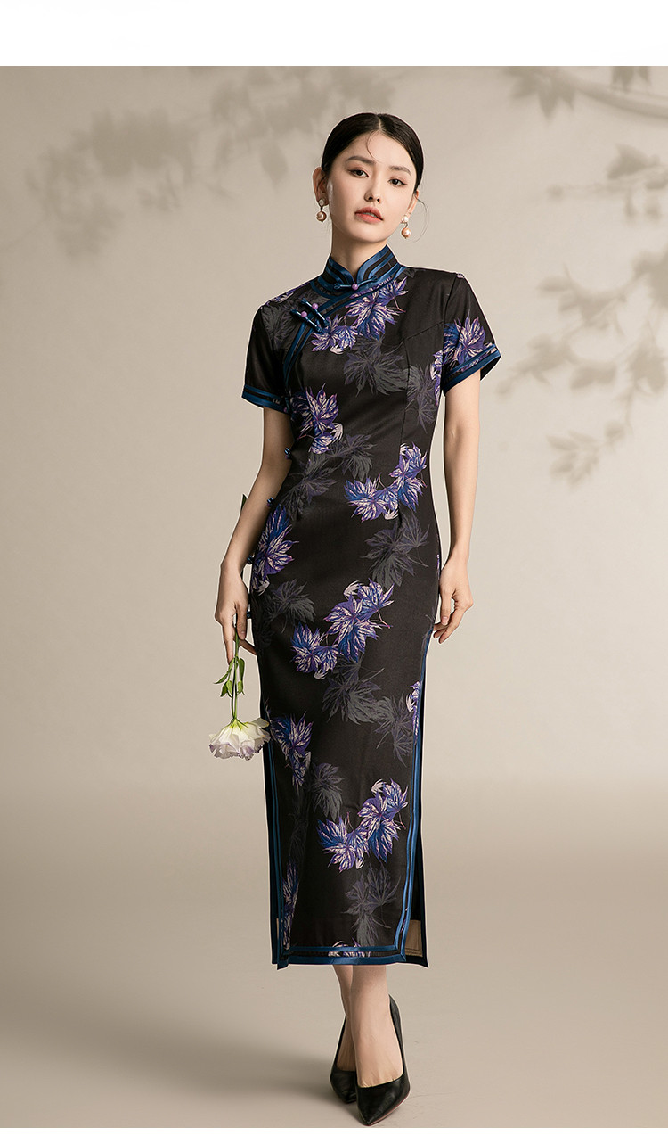 黑色高端碎花中国风旗袍中长裙改良复古气质旗袍 132511