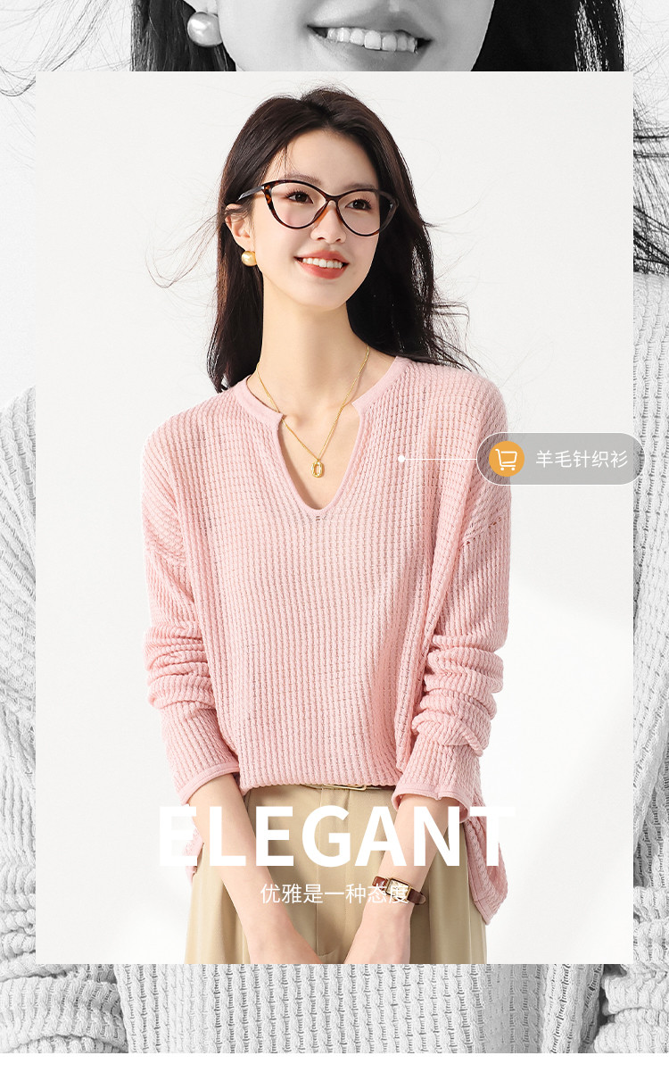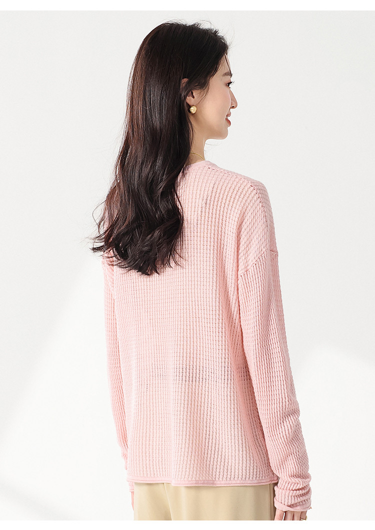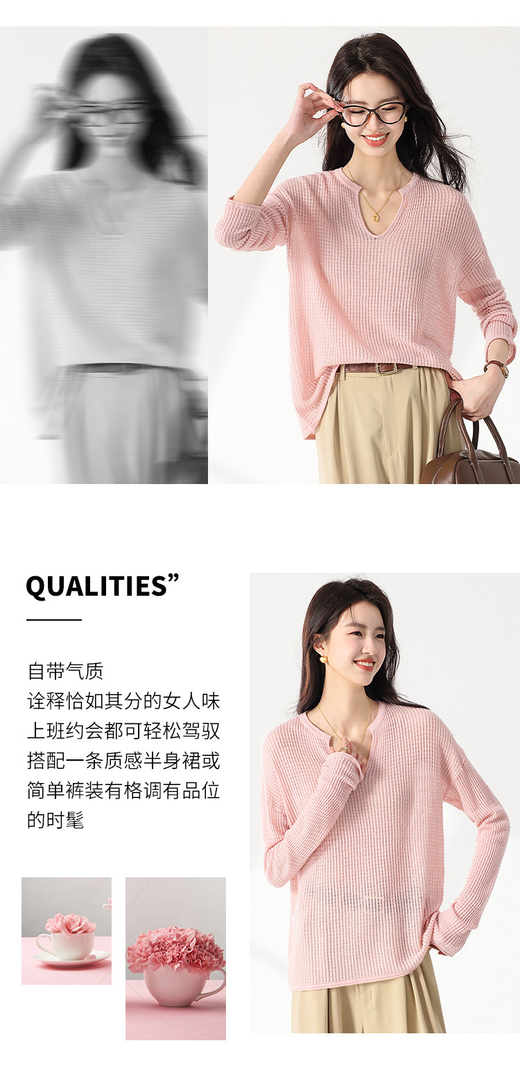 商品名称:轻薄透气网眼镂空纯色V领长袖羊毛针织衫毛衣罩衫空调衫夏款T恤 677523