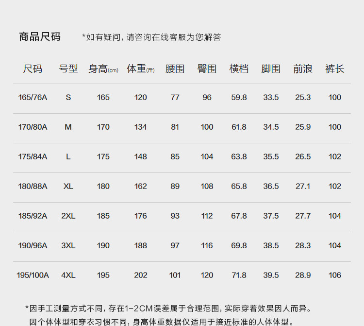 | 3XL(推荐89~94kg) | 97 | 104 | 28.3 | 116 | 190/96A |