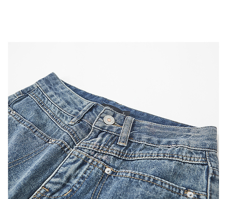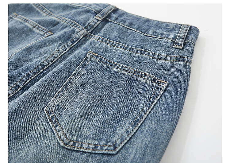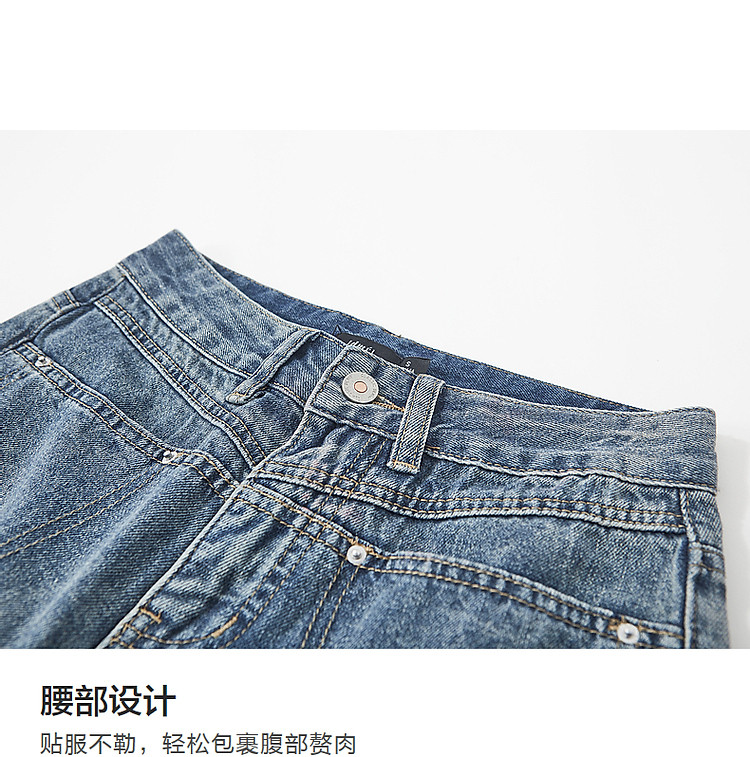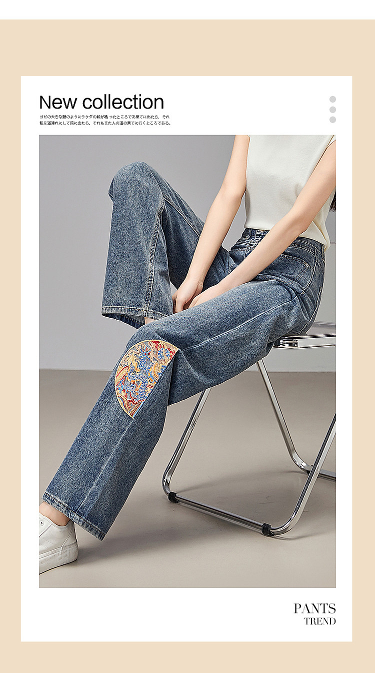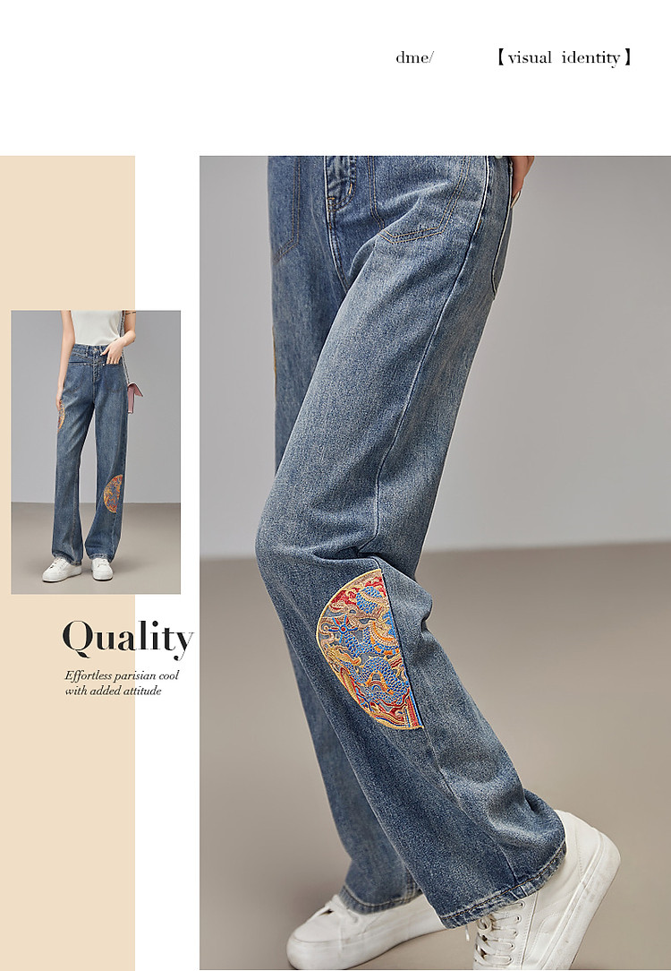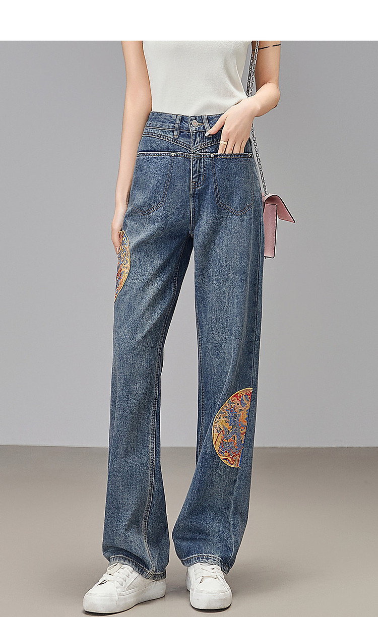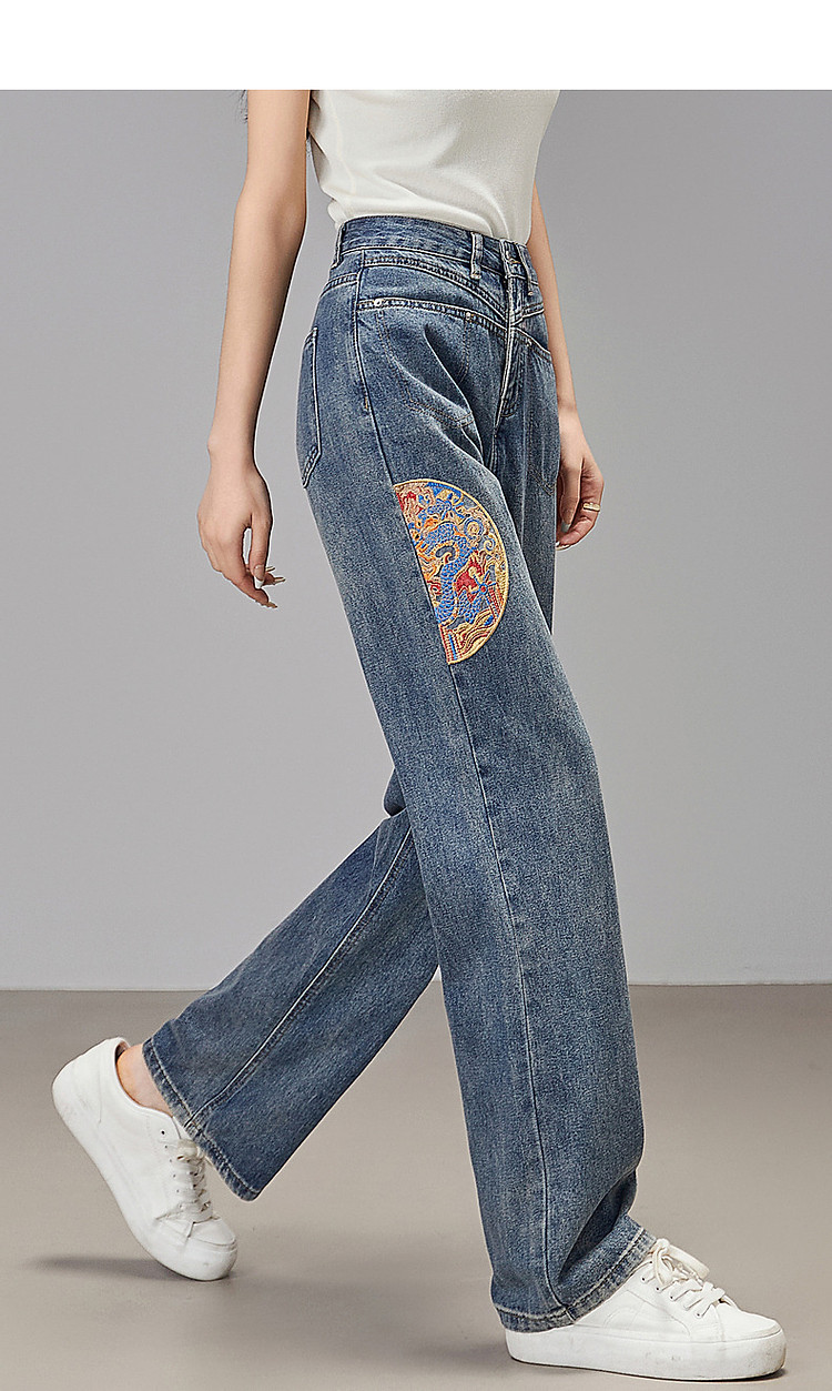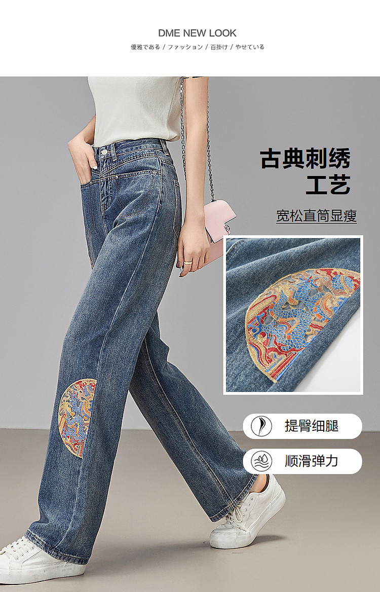 商品名称:【雾里看花】夏季国风新中式刺绣高腰直筒裤宽松舒适遮肉女牛仔裤 749505