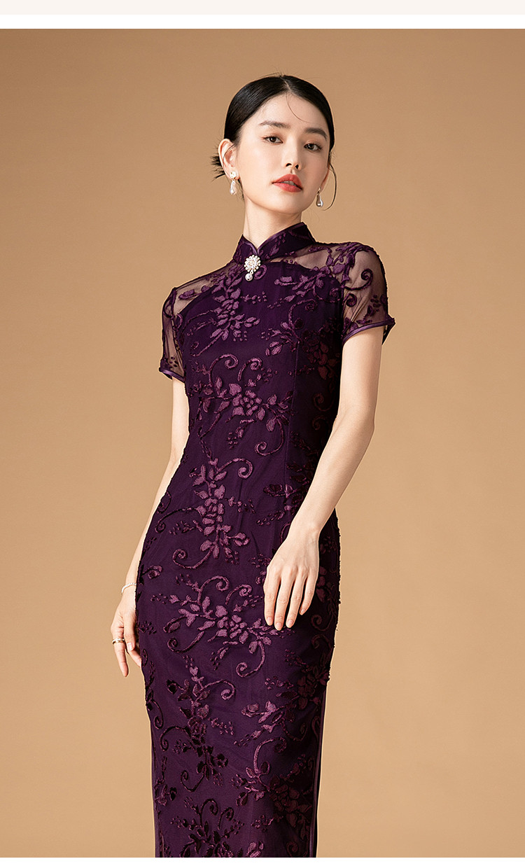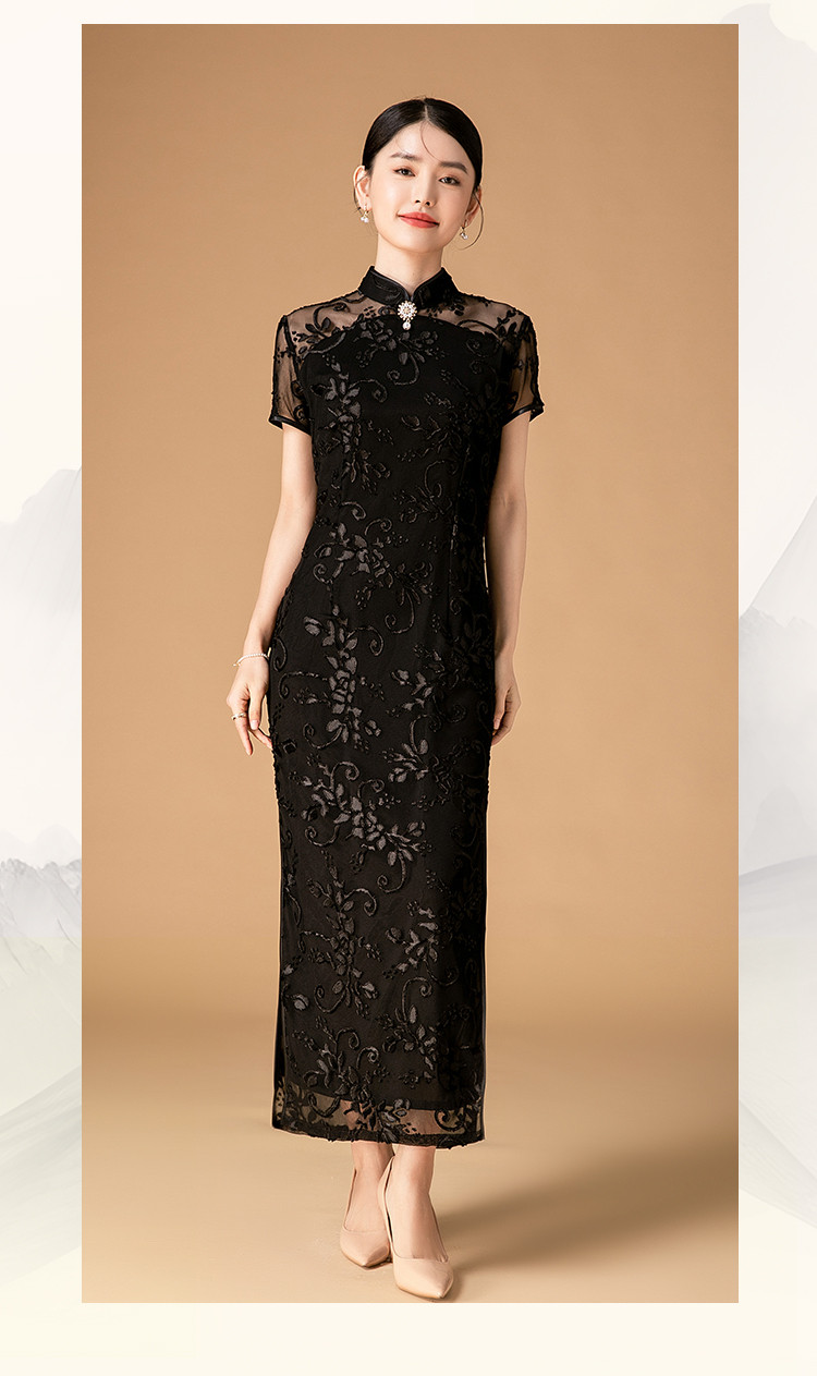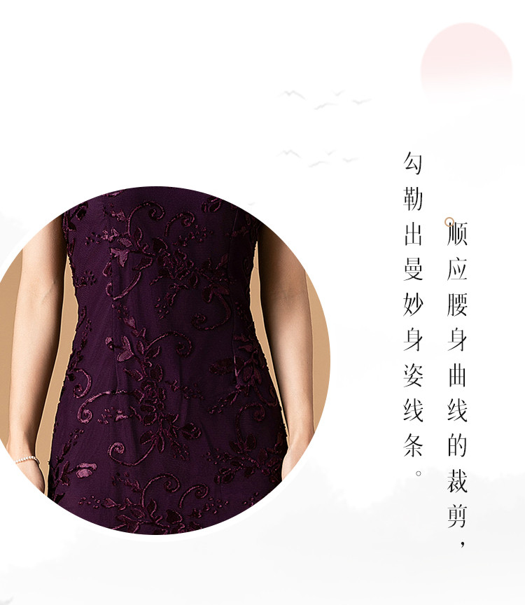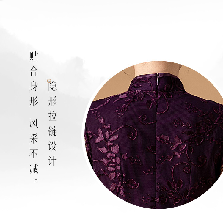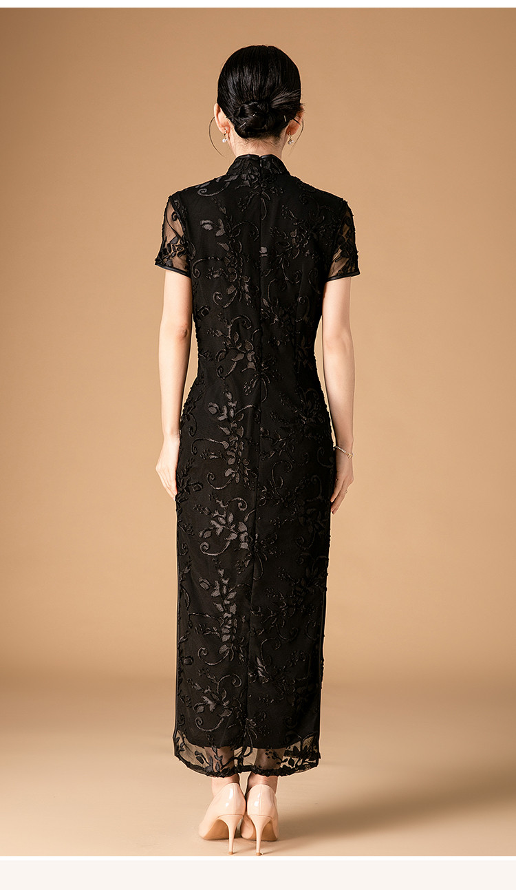 中长款双层花绒中国风轻奢短袖时尚改良旗袍连衣裙 272671