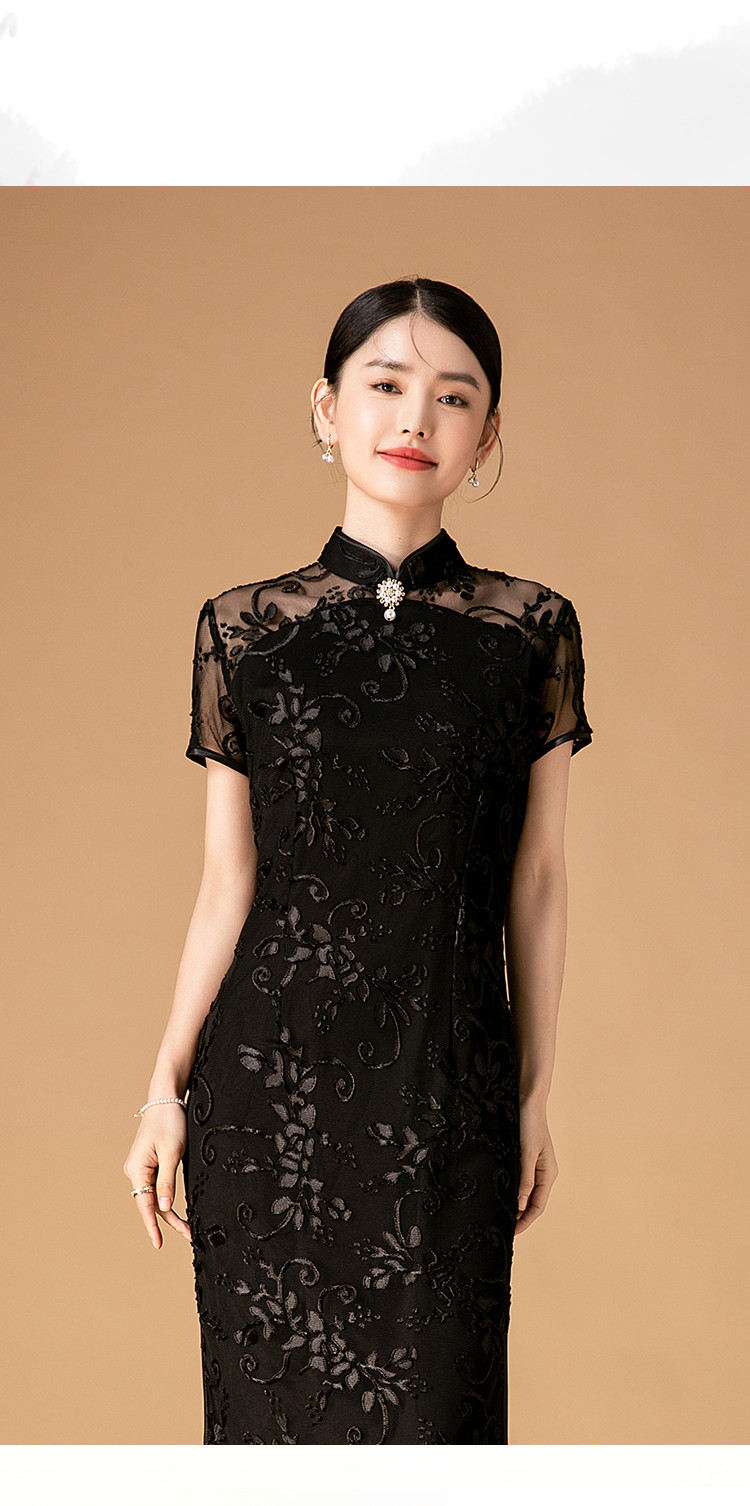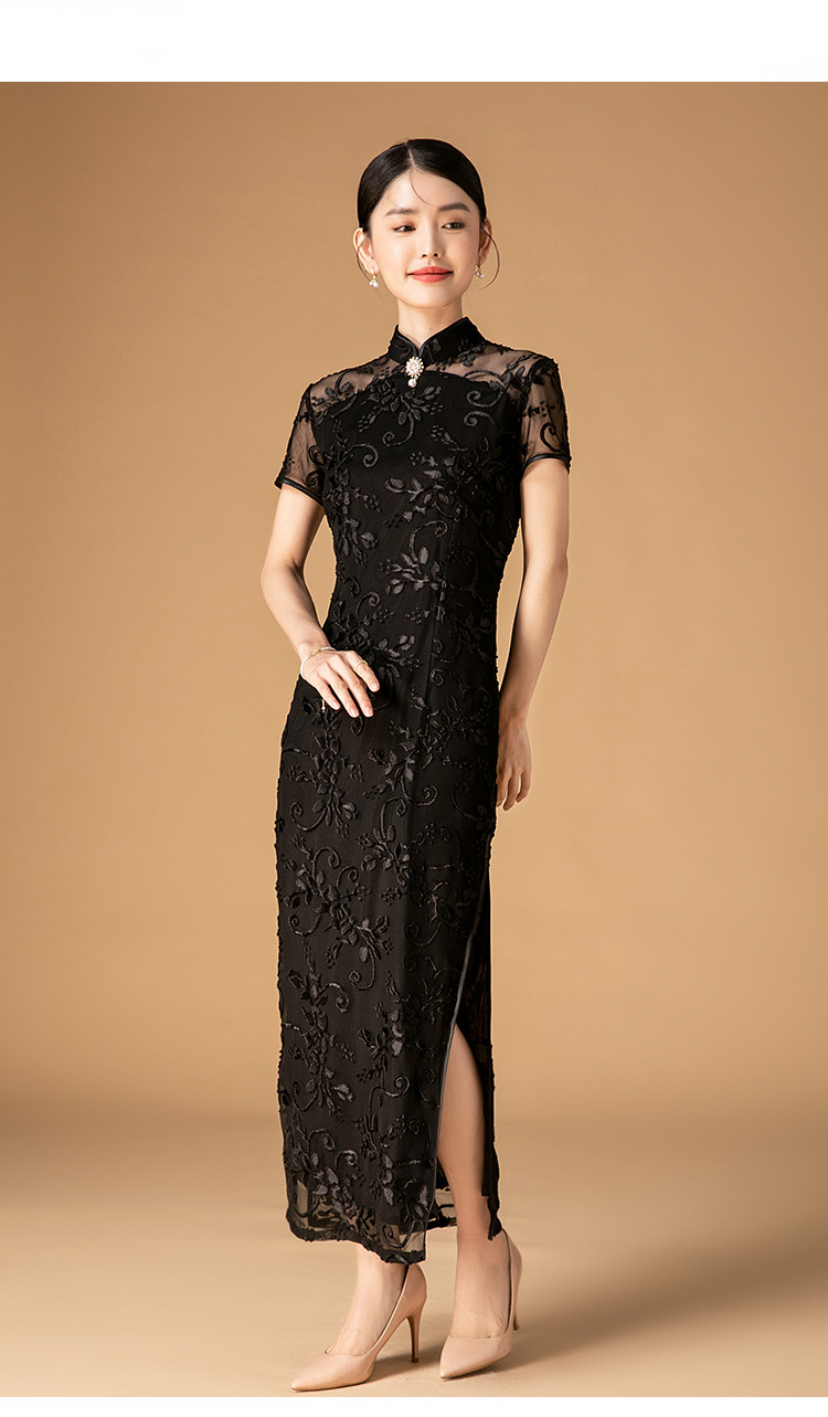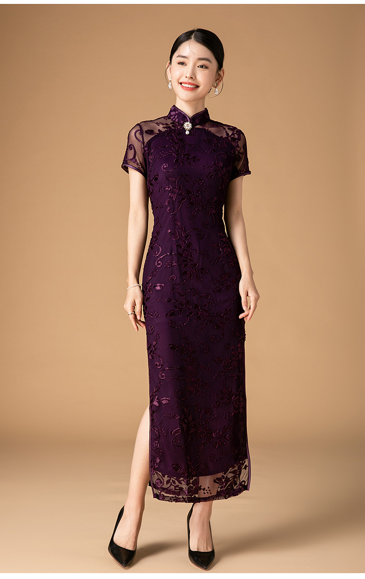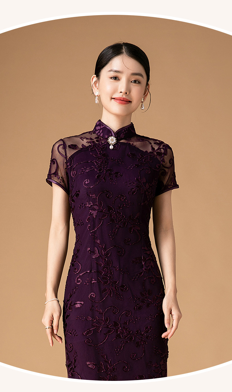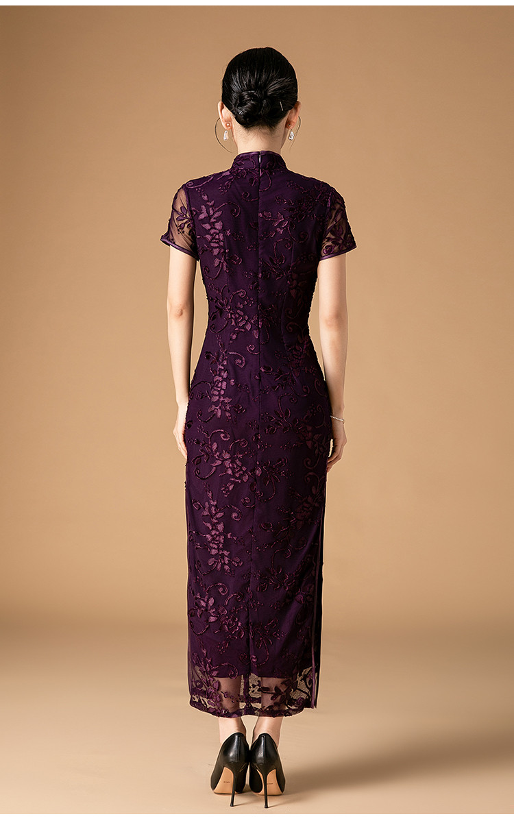 中长款双层花绒中国风轻奢短袖时尚改良旗袍连衣裙 272671