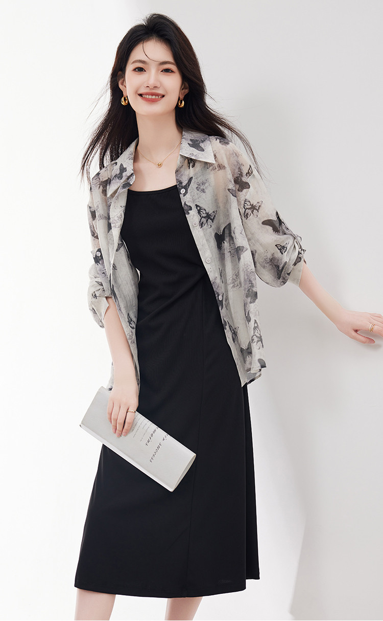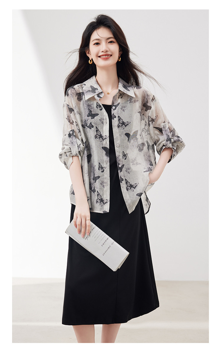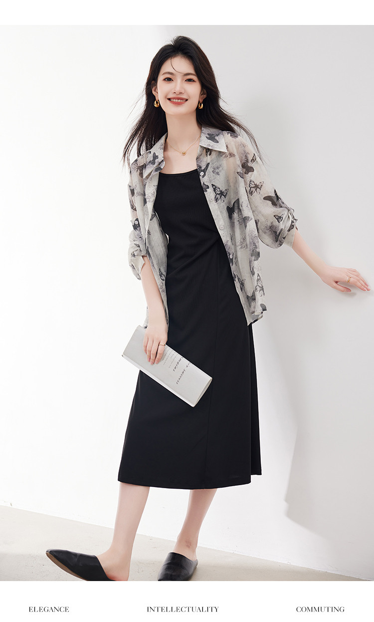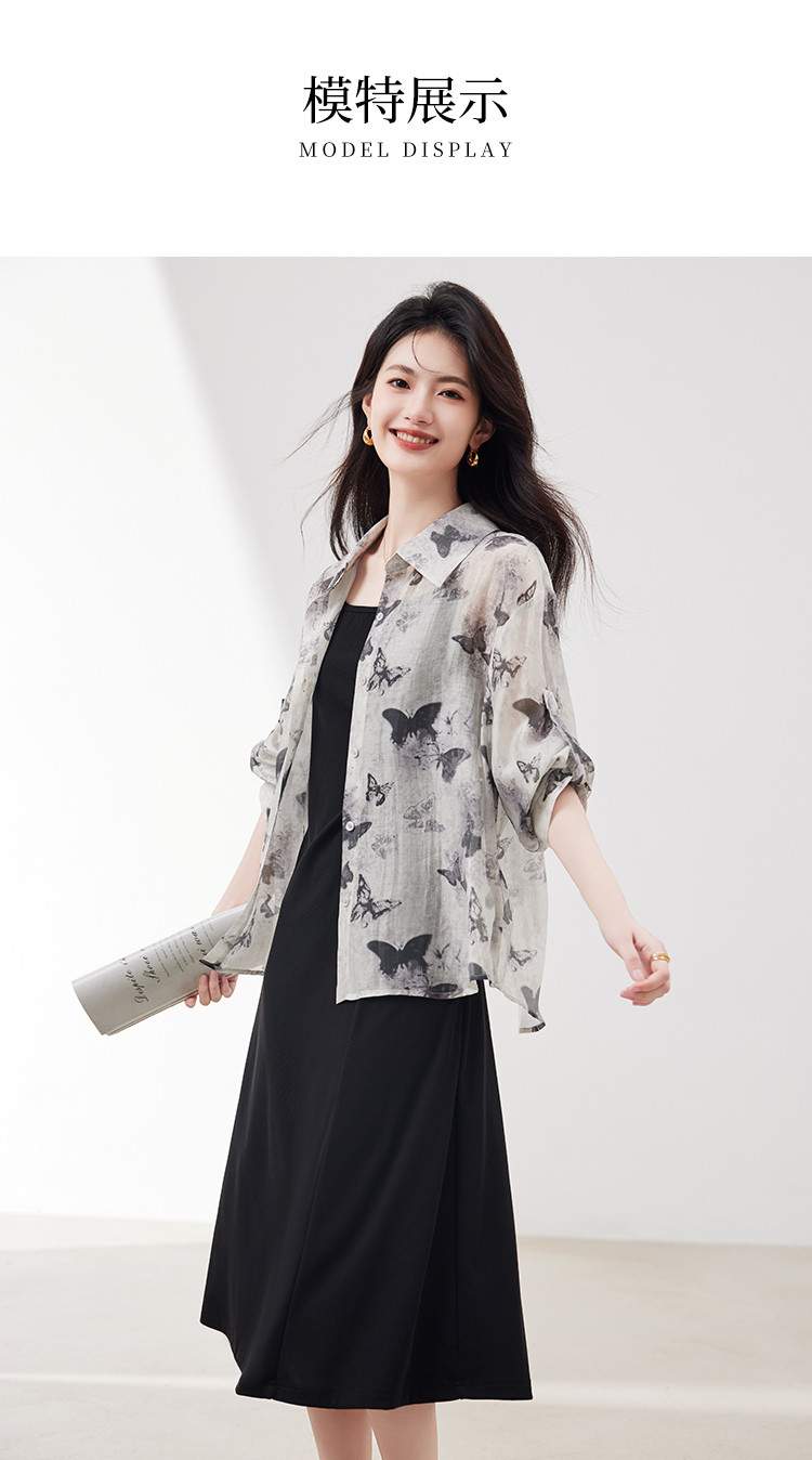 后背开叉莱赛尔薄衬衫套装女2025夏季遮肚子连衣裙两件套 069400