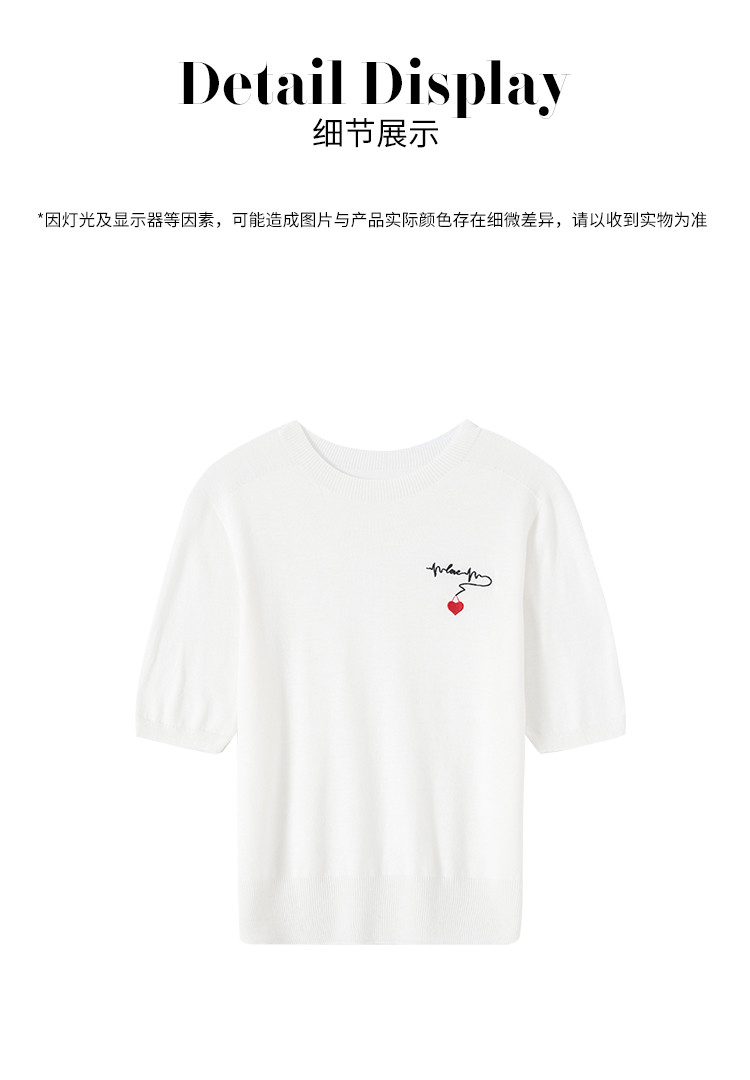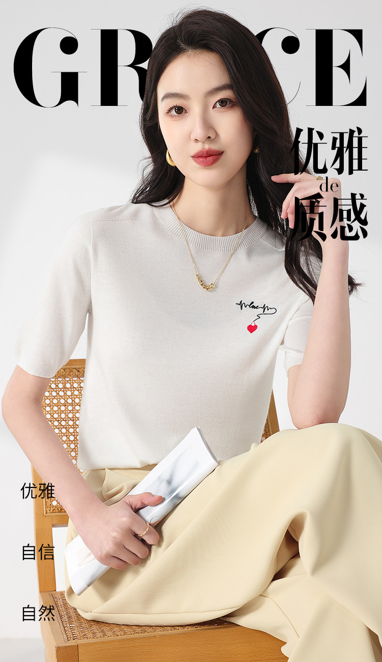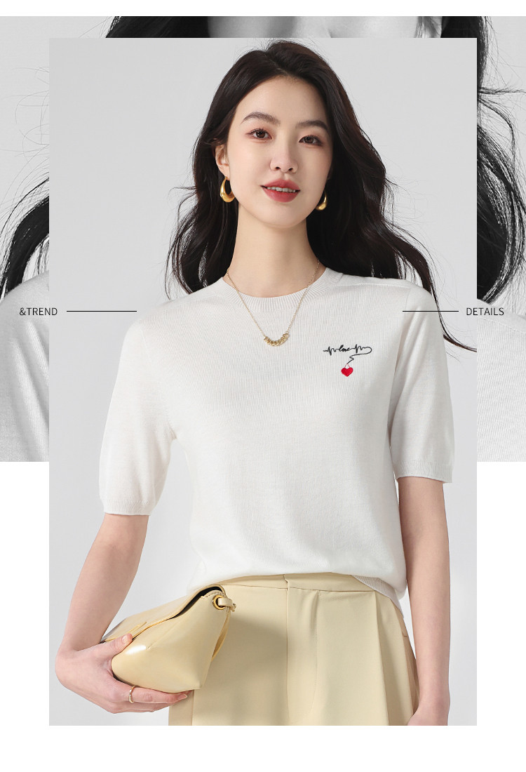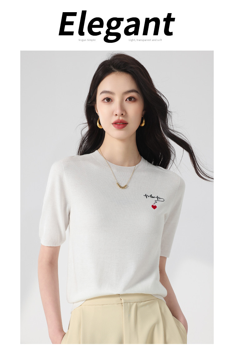 商品名称:【无缝 一线成衣】轻薄透气含桑蚕丝刺绣爱心针织打底衫短袖T恤 415059