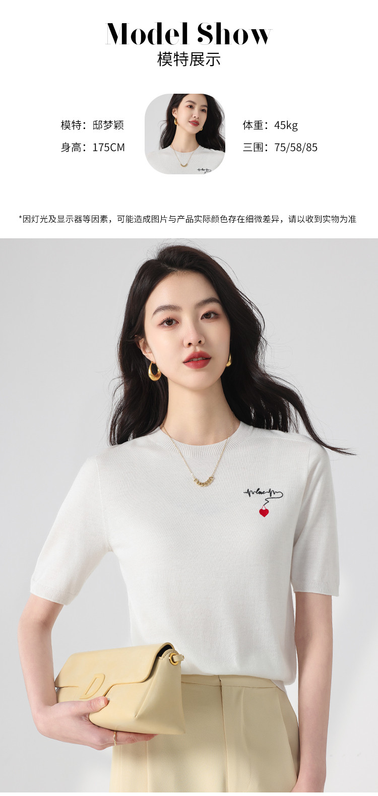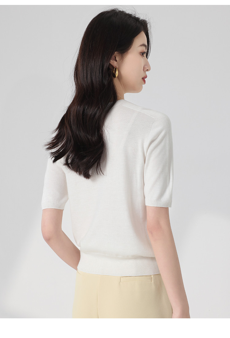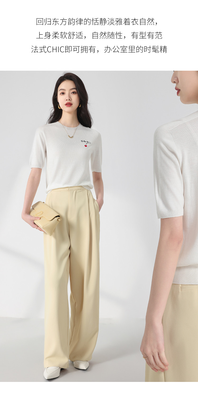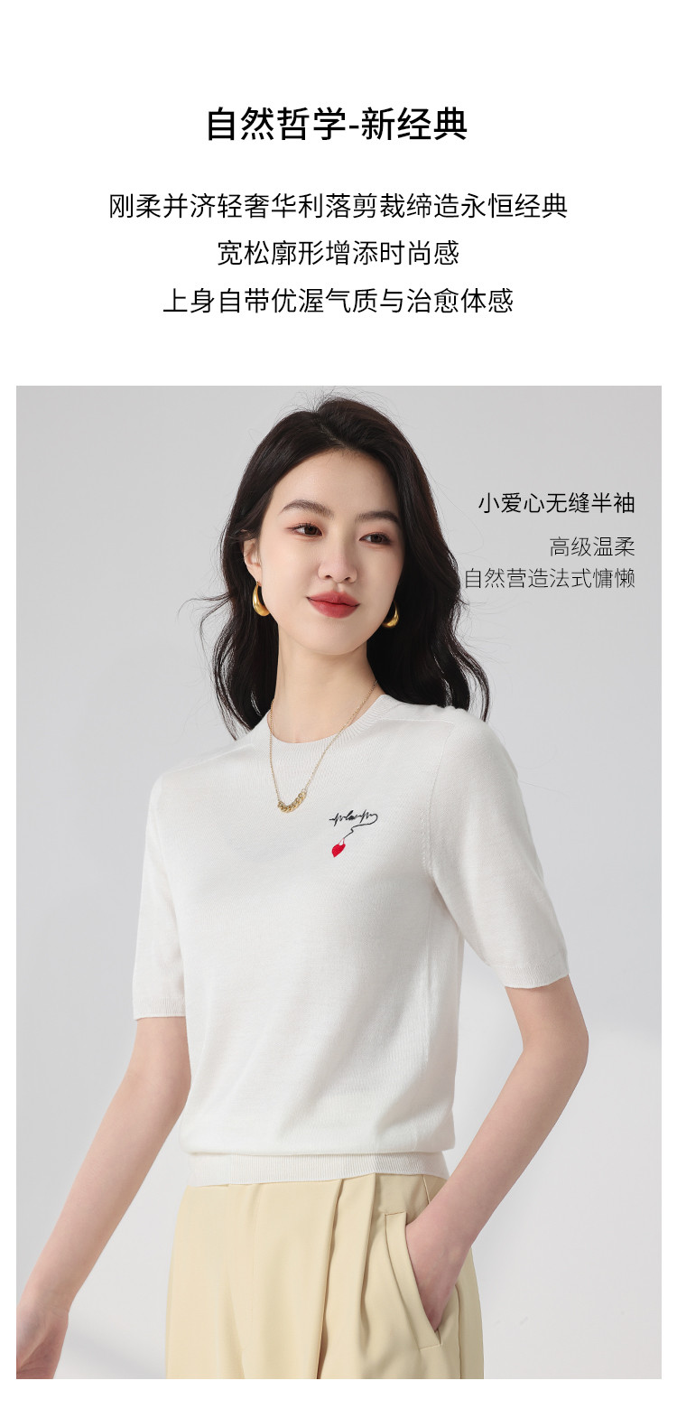 商品名称:【无缝 一线成衣】轻薄透气含桑蚕丝刺绣爱心针织打底衫短袖T恤 415059