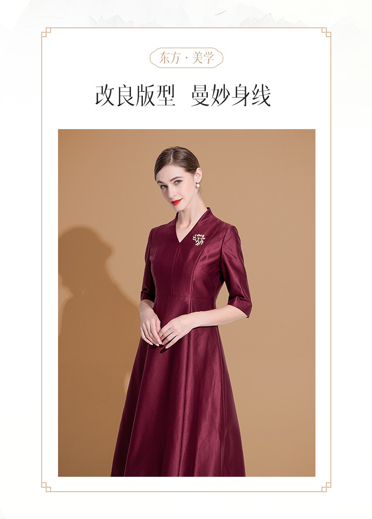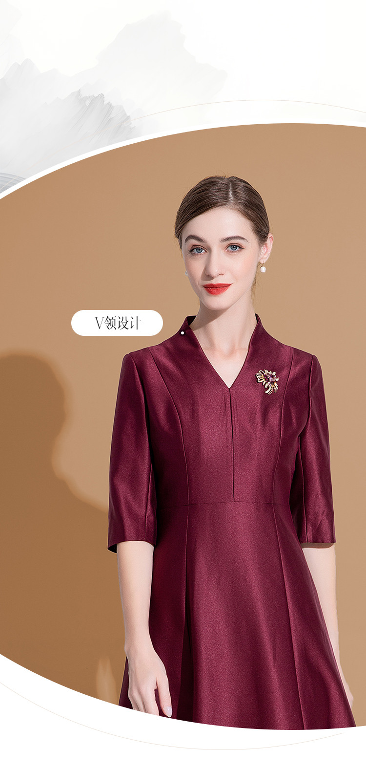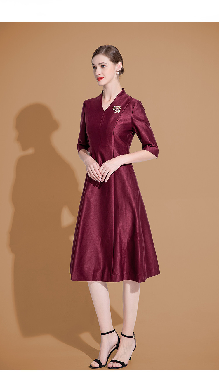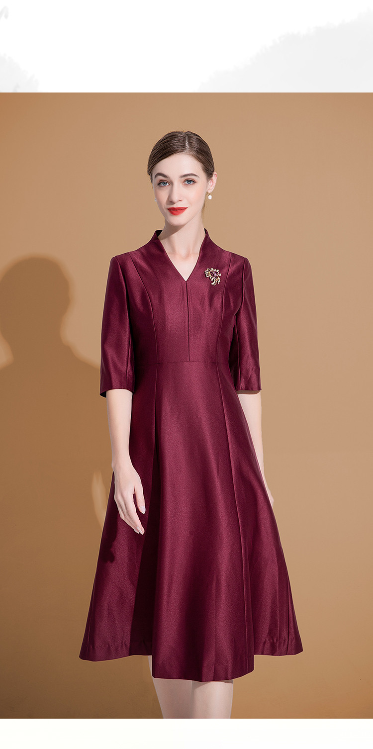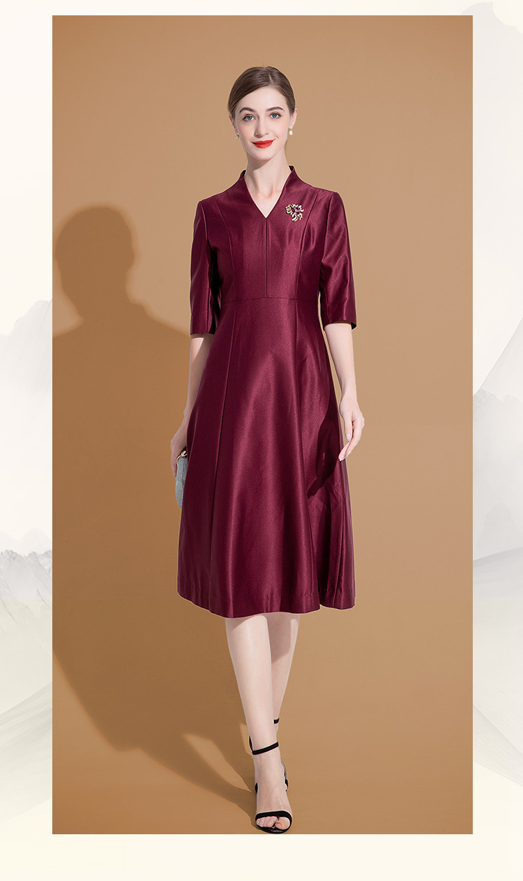 连衣裙女春季V领时尚简约气质中长款收腰合体连衣裙 625759