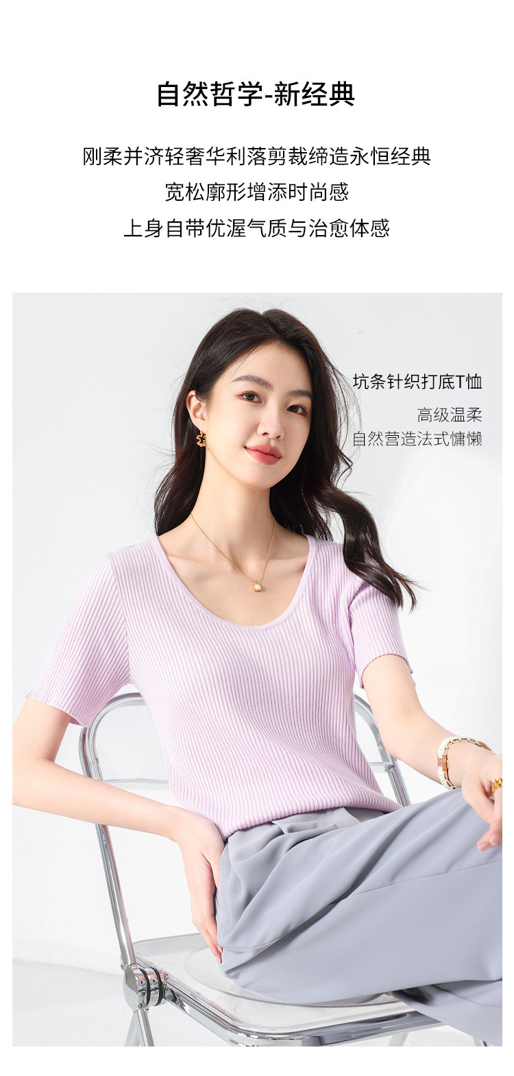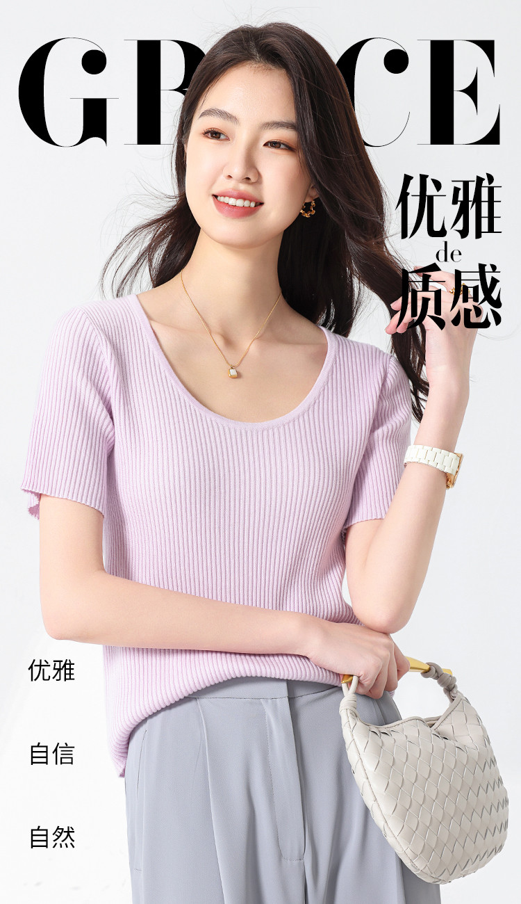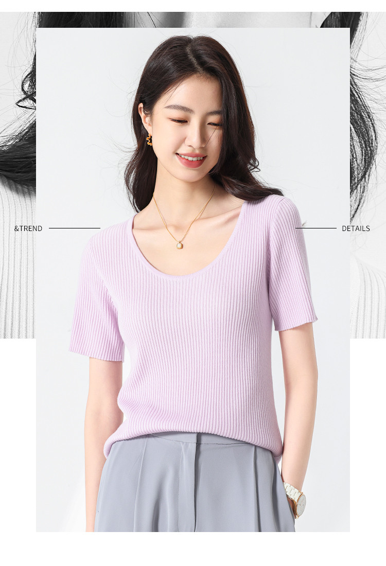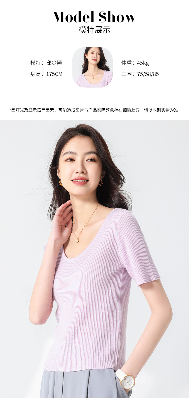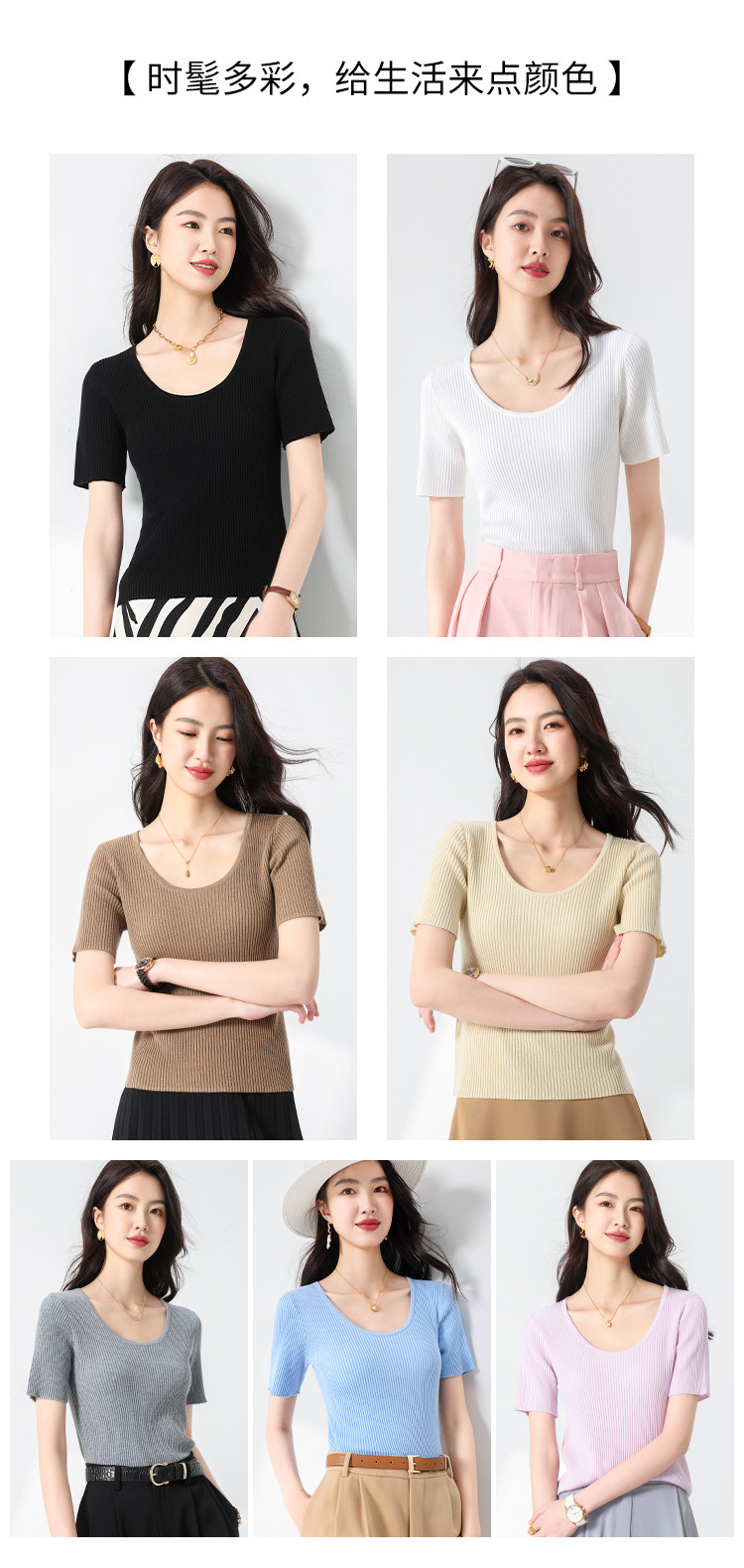 简约百搭纯色U领羊毛针织短袖T恤打底衫轻薄透气净色 669715