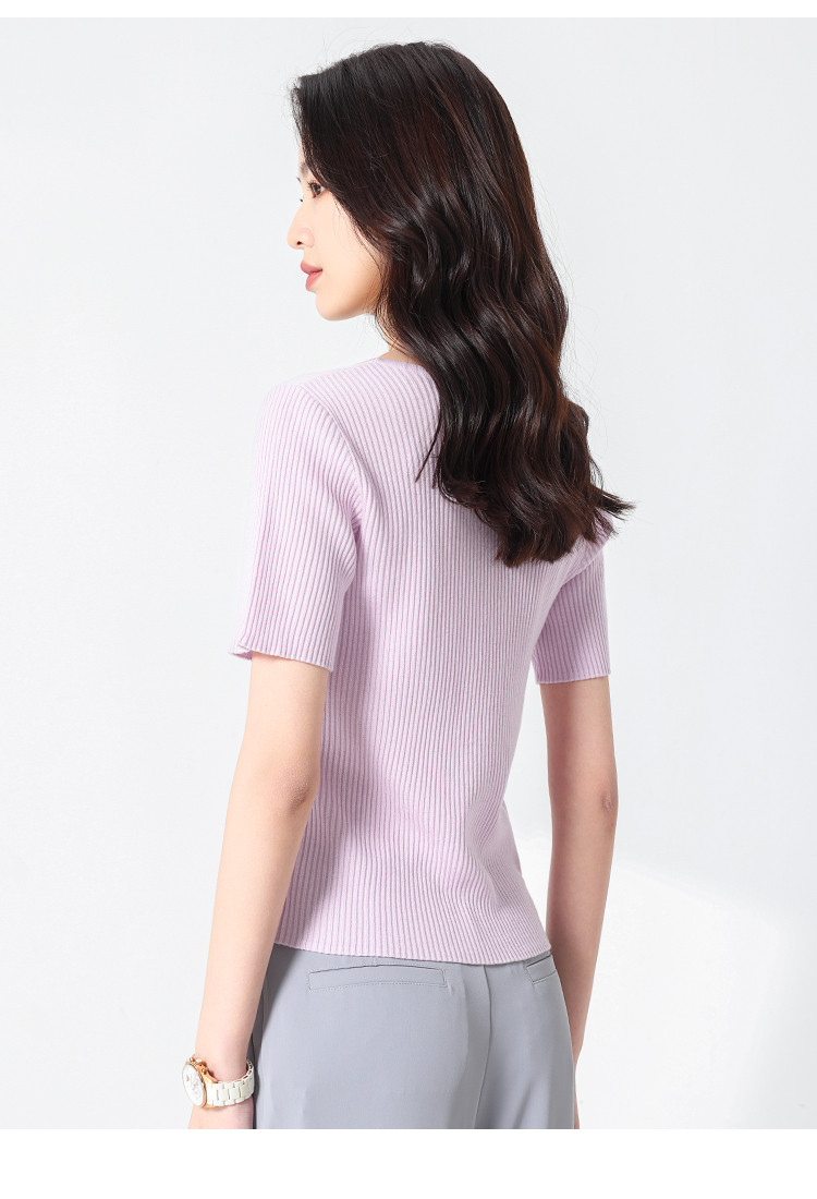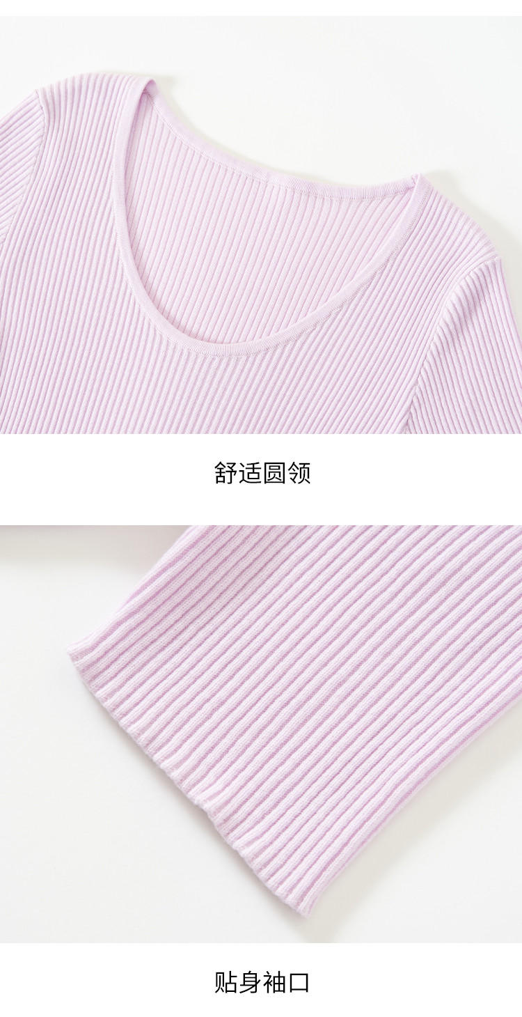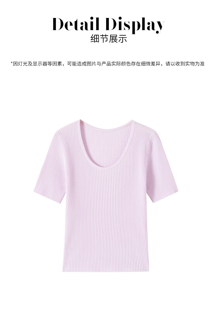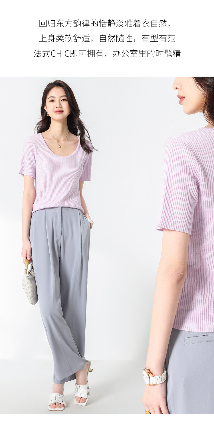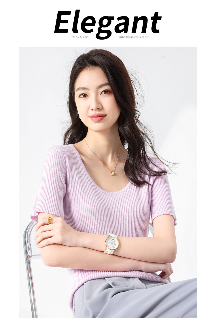 简约百搭纯色U领羊毛针织短袖T恤打底衫轻薄透气净色 669715