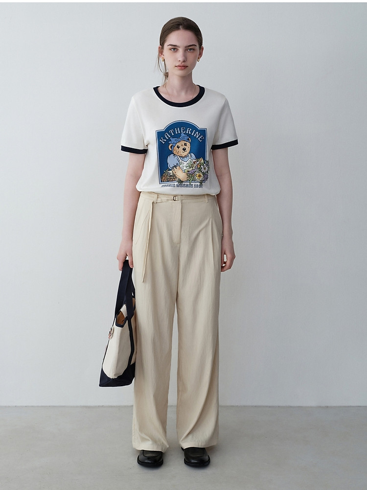 小熊高腰宽松直筒裤可调节腰带休闲裤女士 893313