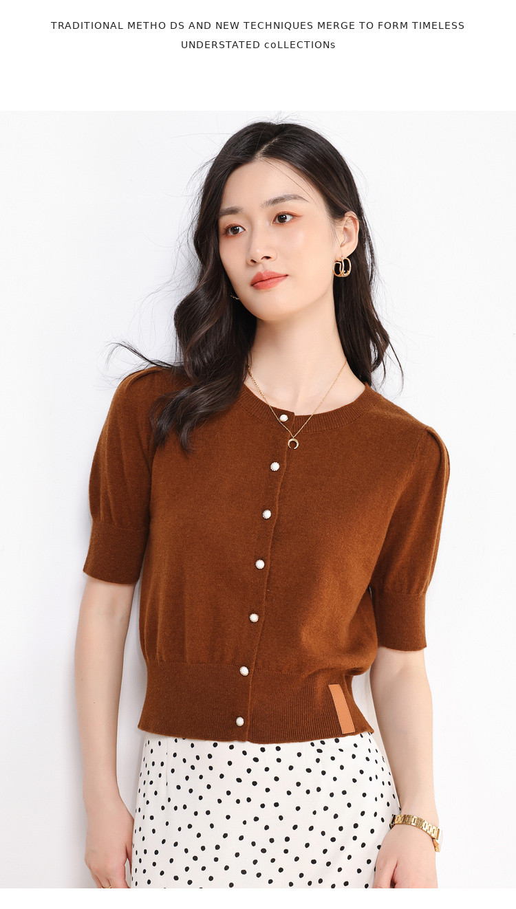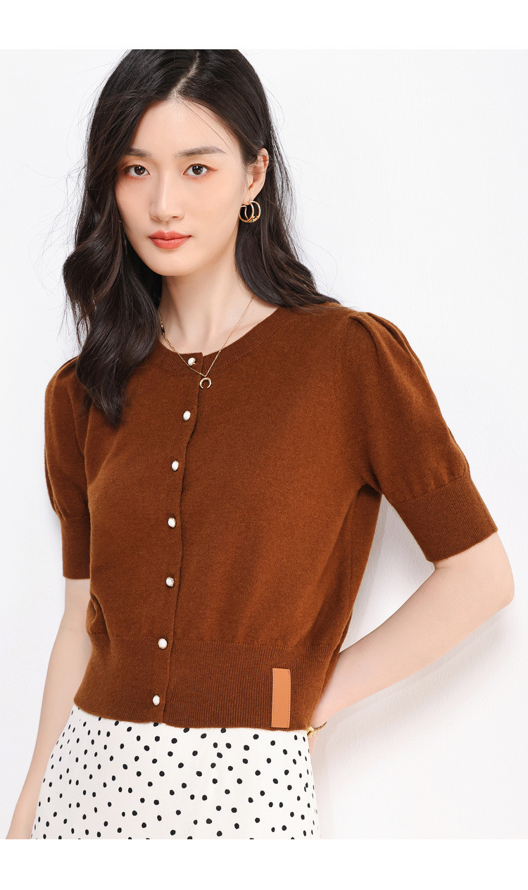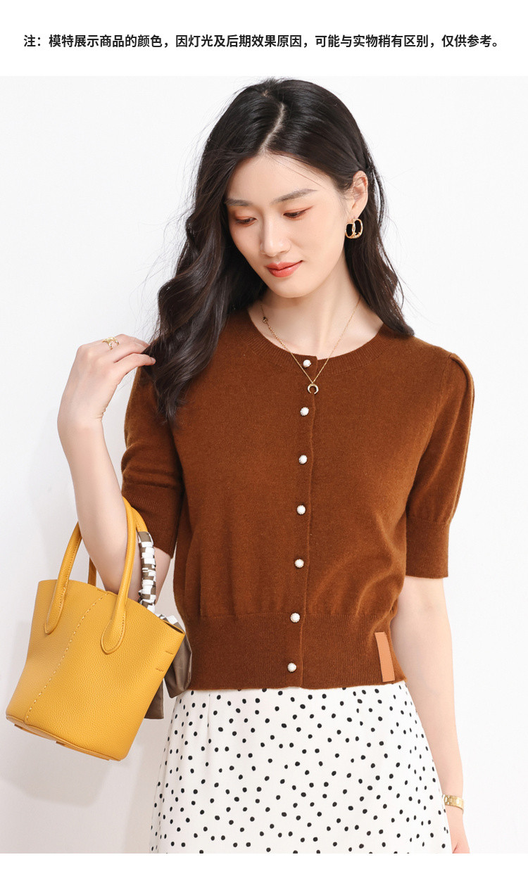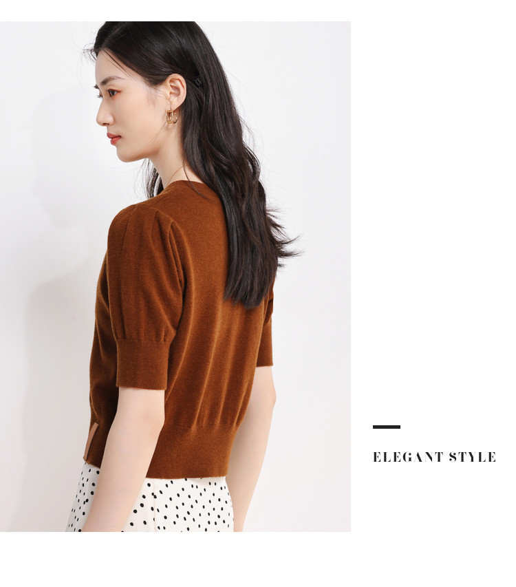 【100%绵羊毛】纯色泡泡袖圆领短袖羊毛开衫针织T恤毛衣外套 489619