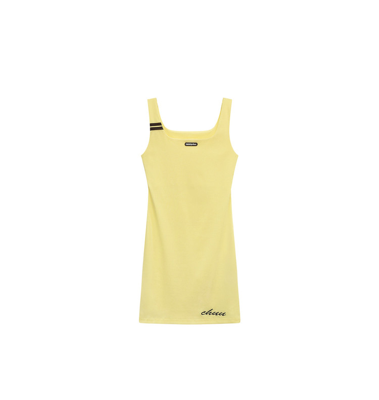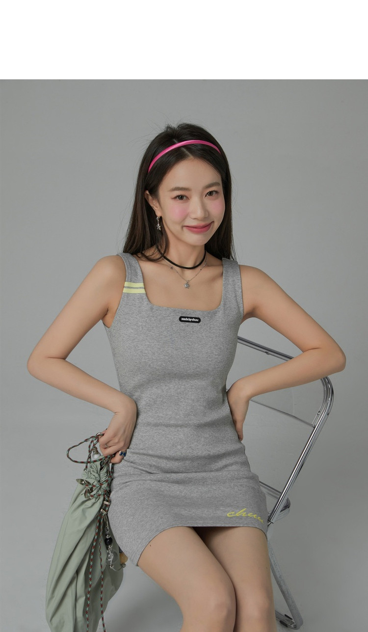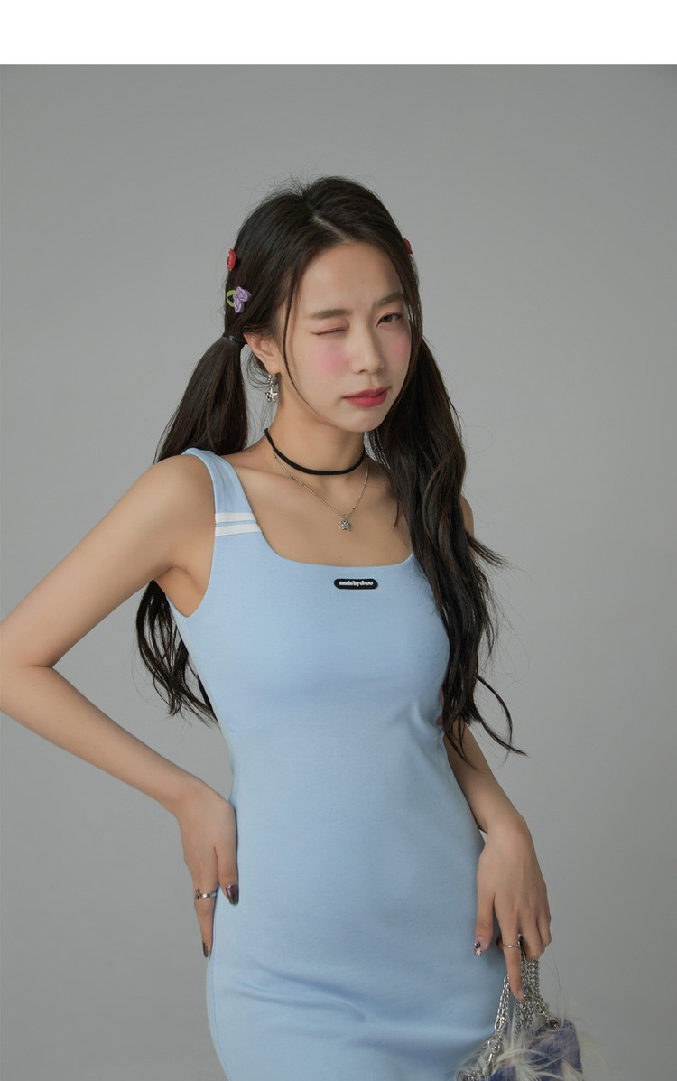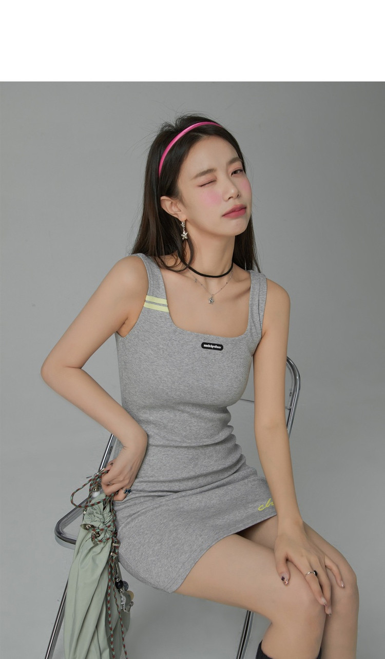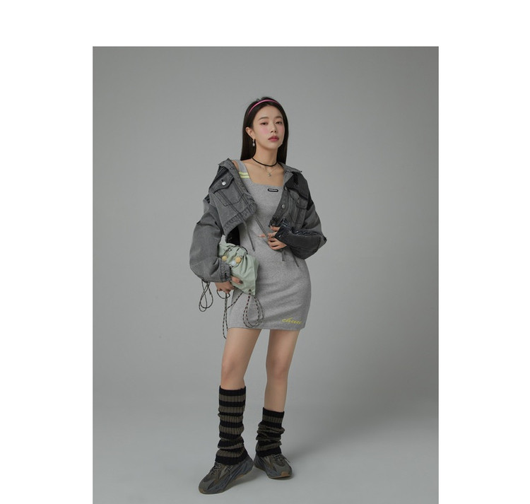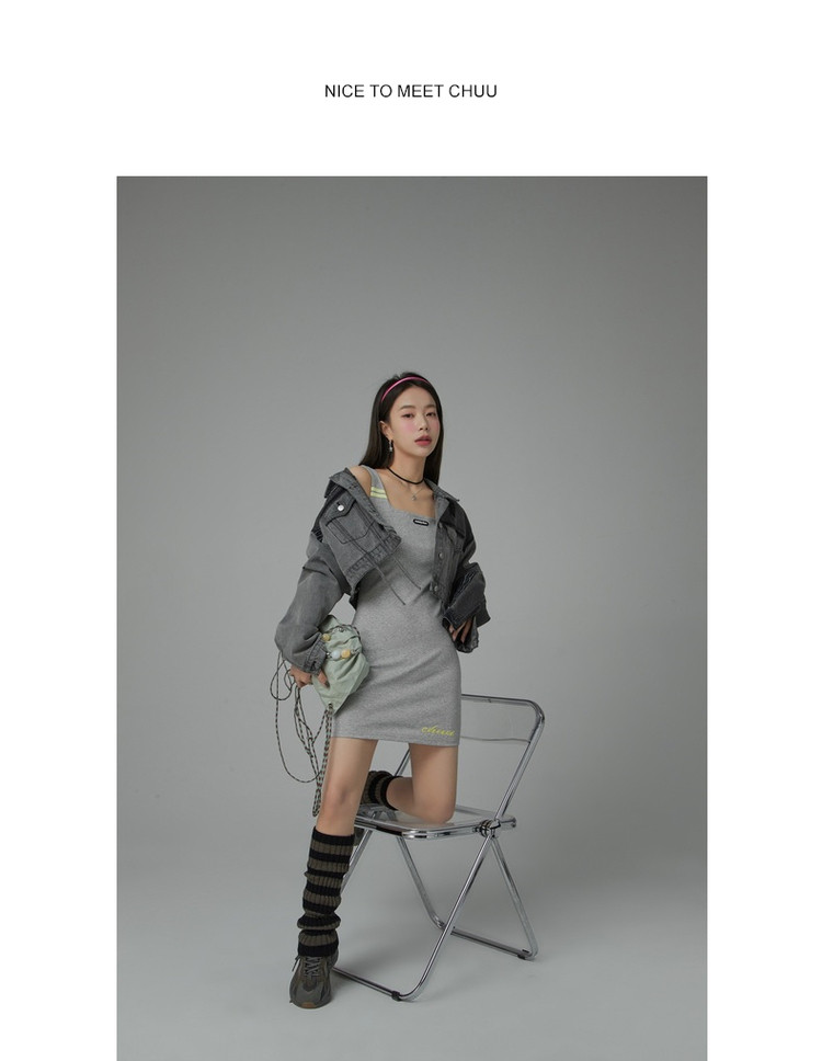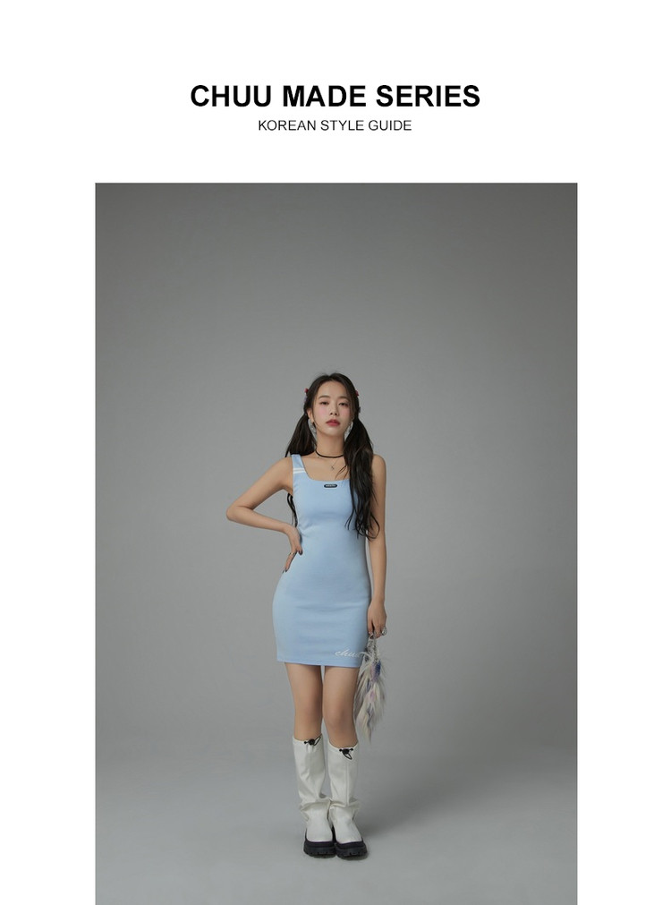 商品名称:纯色绣花连衣裙女秋修身显瘦U型领针织吊带短裙子 001875