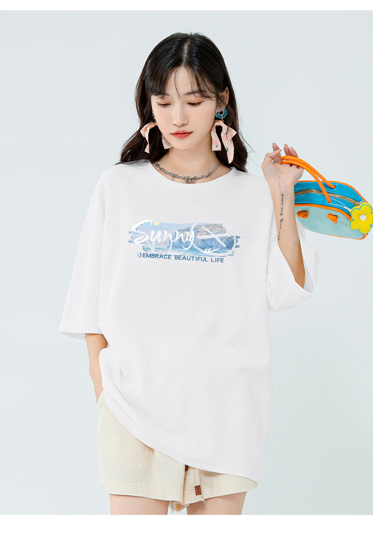 【女装华夫格】中长款下衣失踪T恤女夏季宽松休闲运动慵懒风上衣 476179