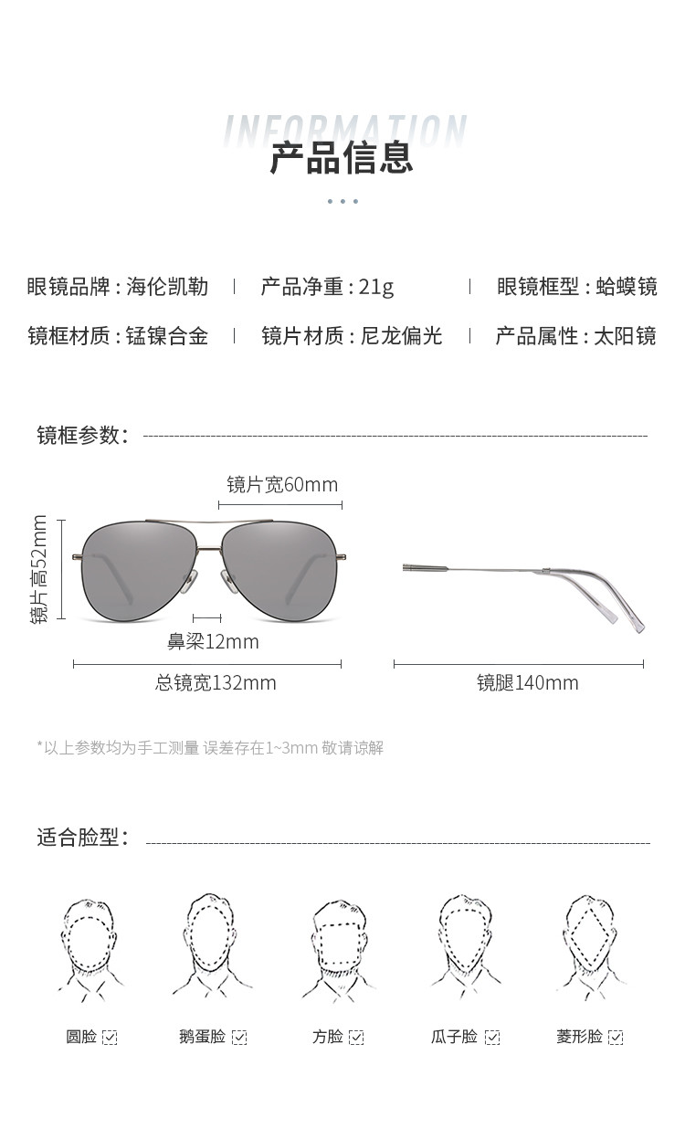 镜面宽度:132mm;镜片高度:52mm;鼻距:12mm;