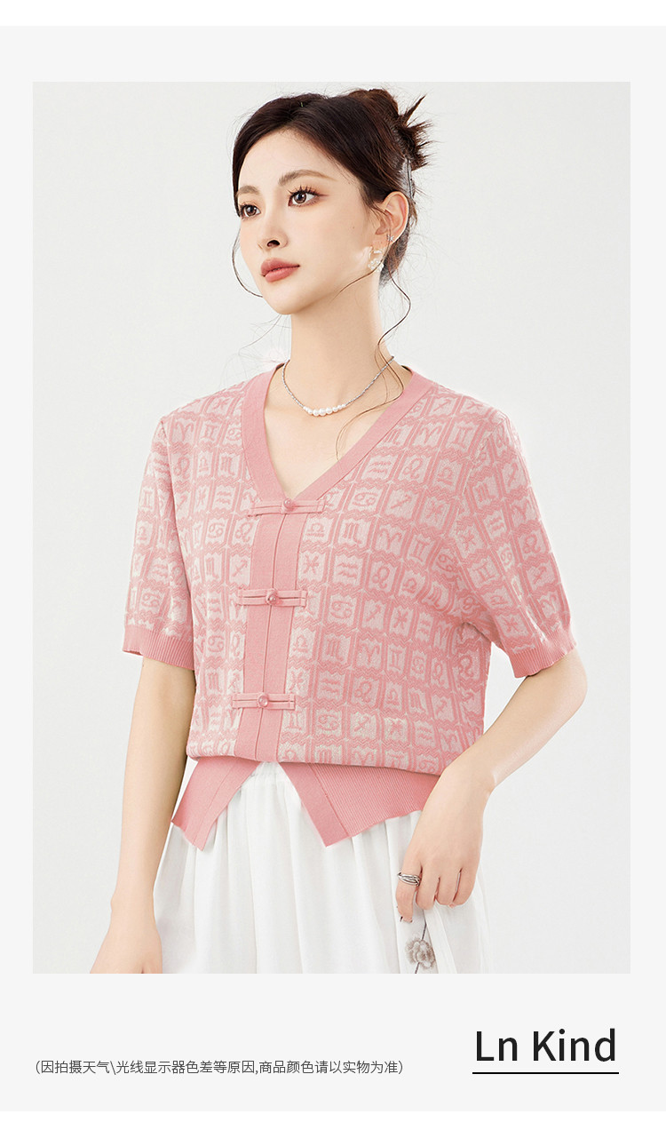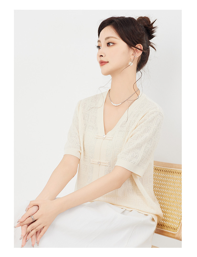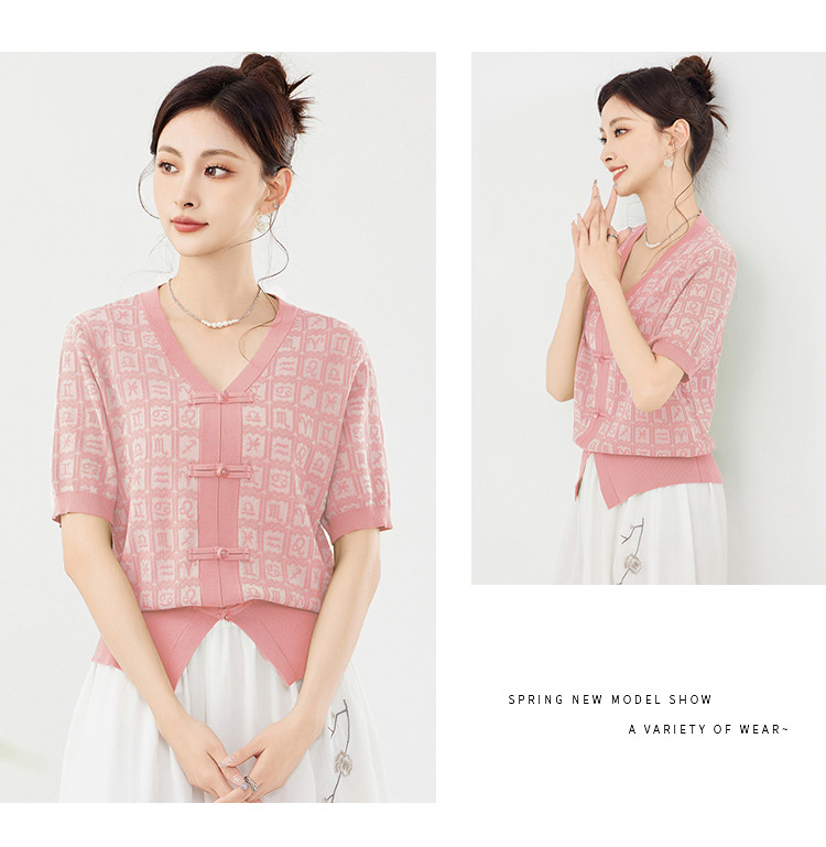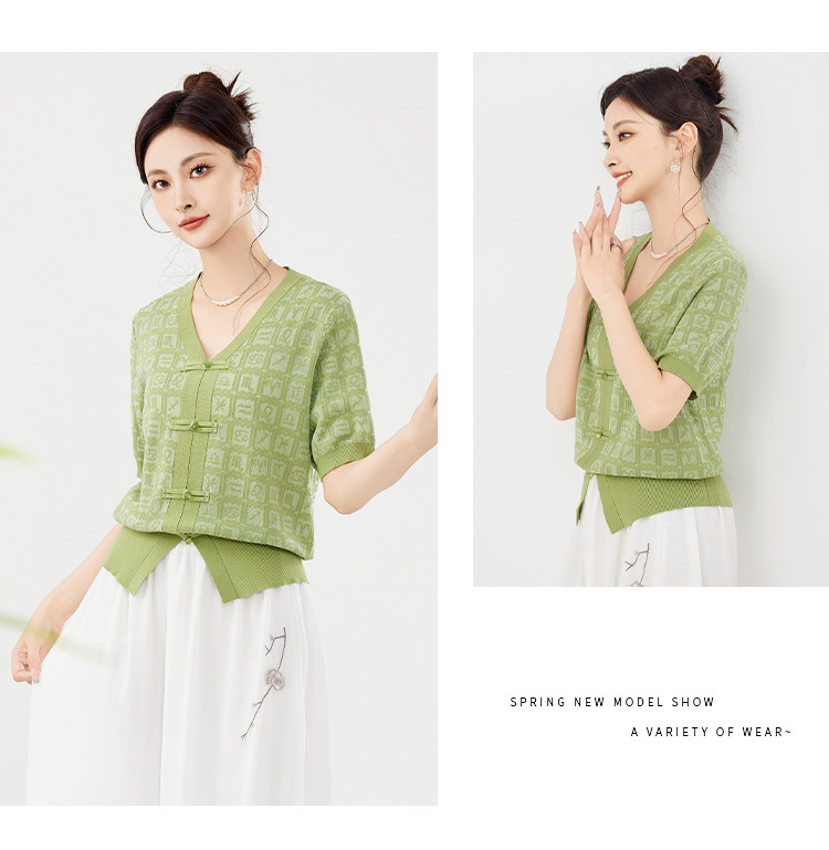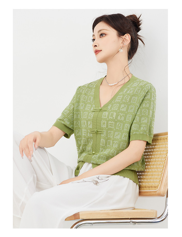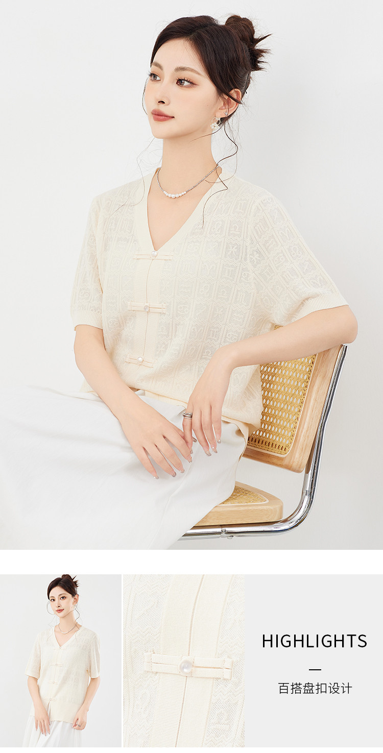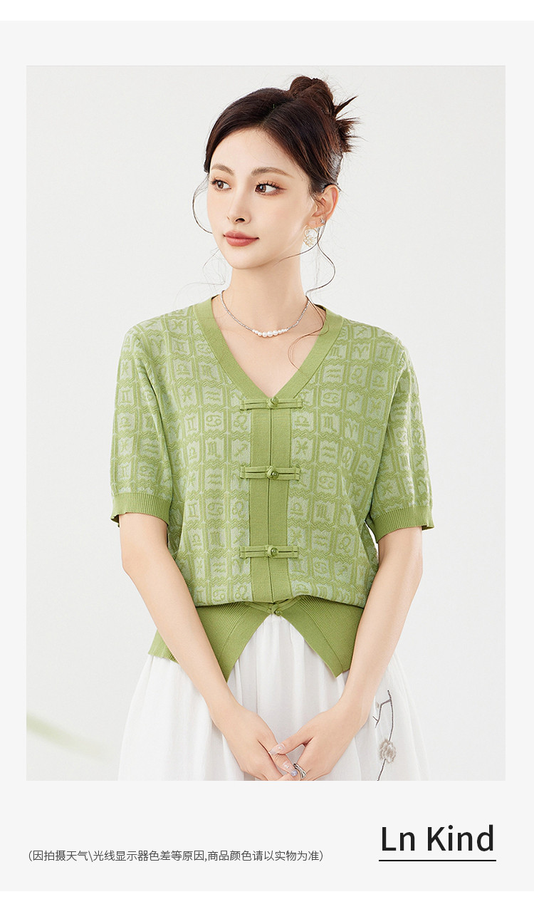 商品名称:【新中式国风含莱赛尔短袖】气质V领盘扣针织衫女国潮高级感上衣 404127