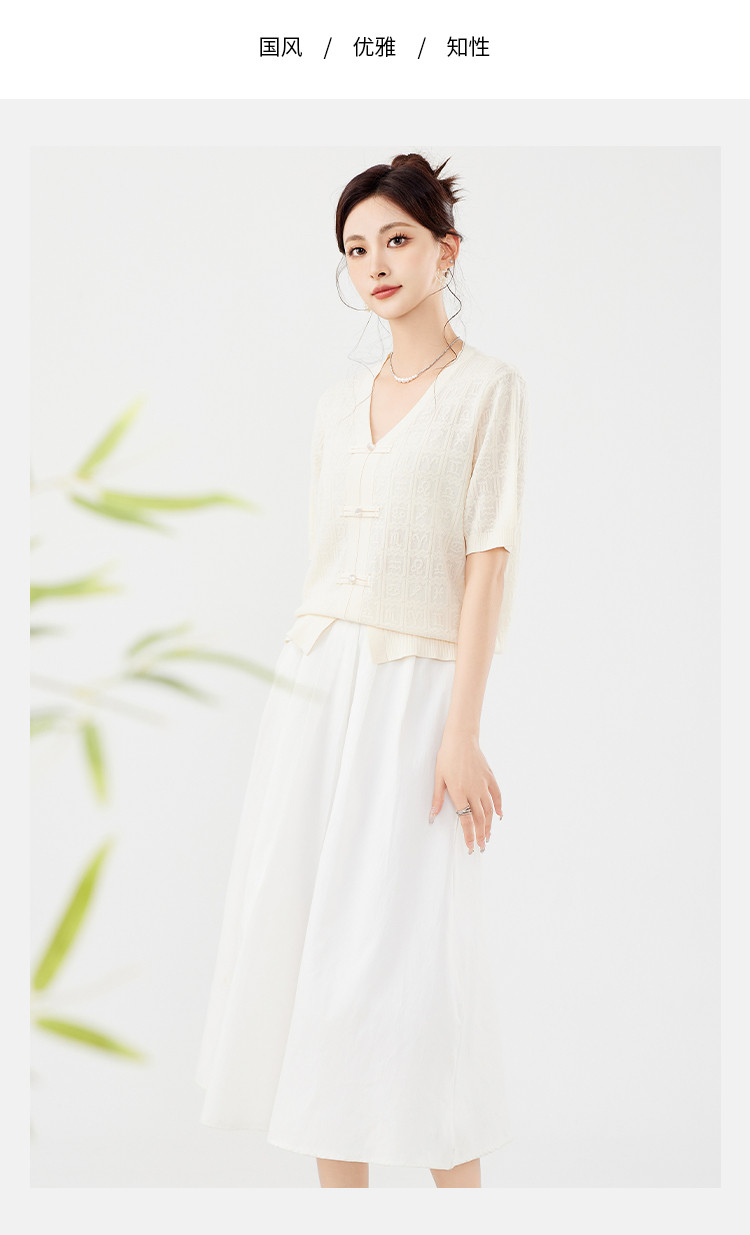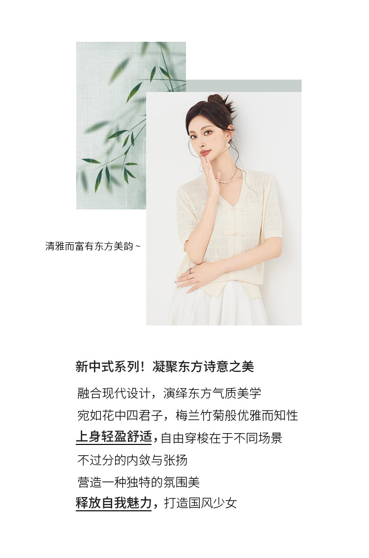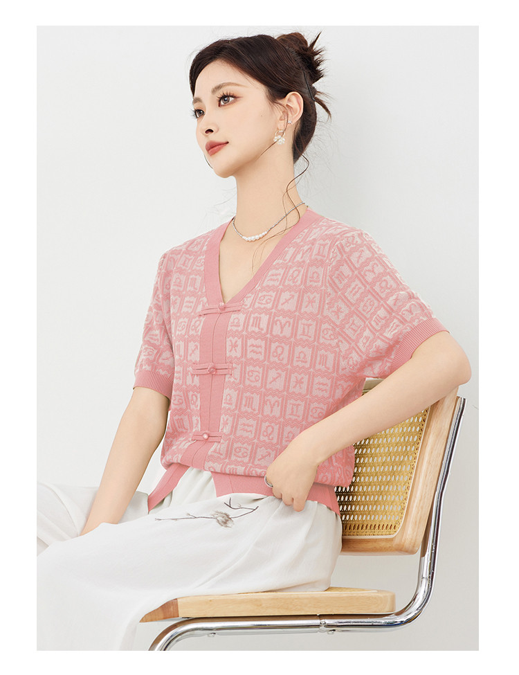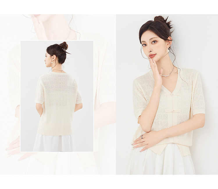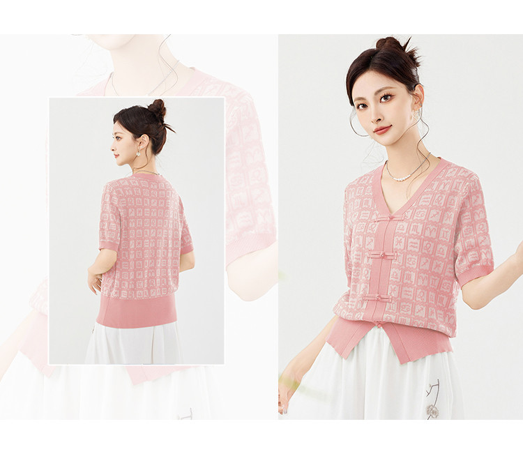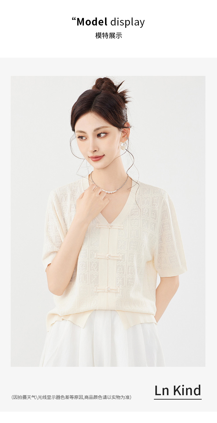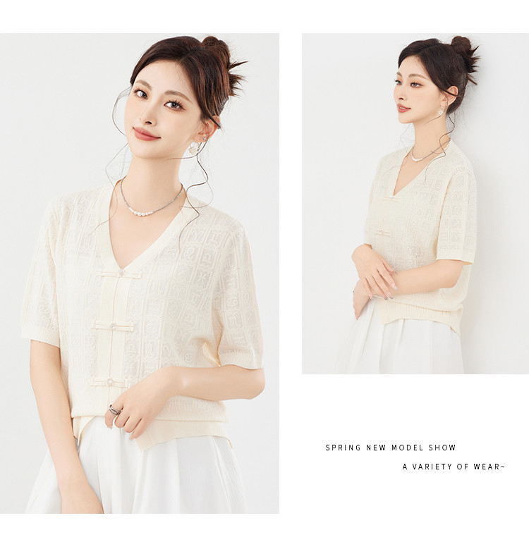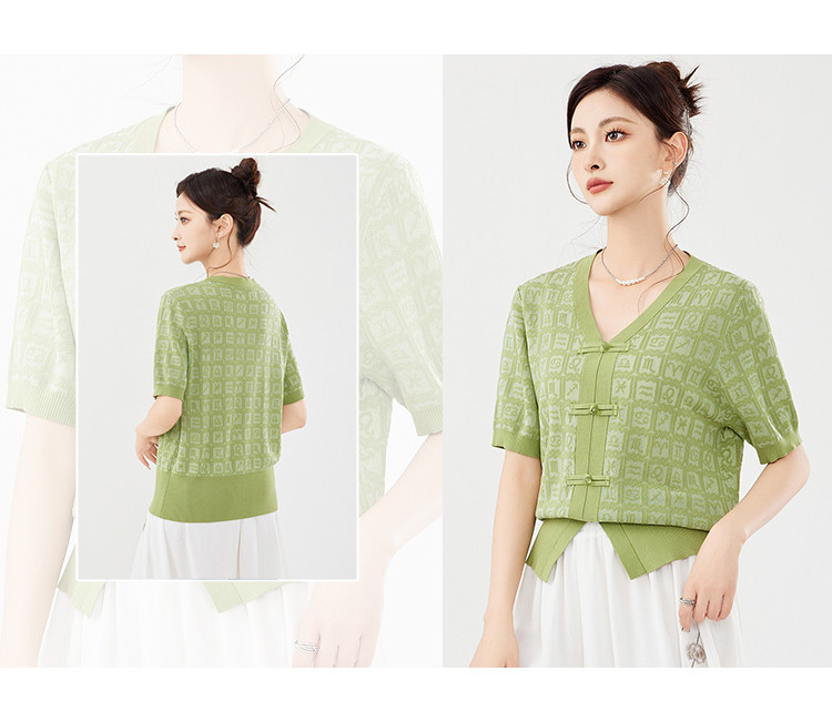 商品名称:【新中式国风含莱赛尔短袖】气质V领盘扣针织衫女国潮高级感上衣 404127