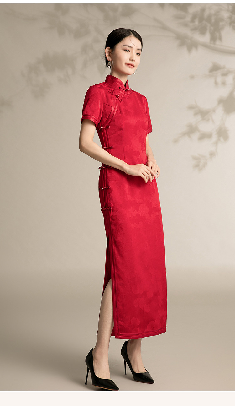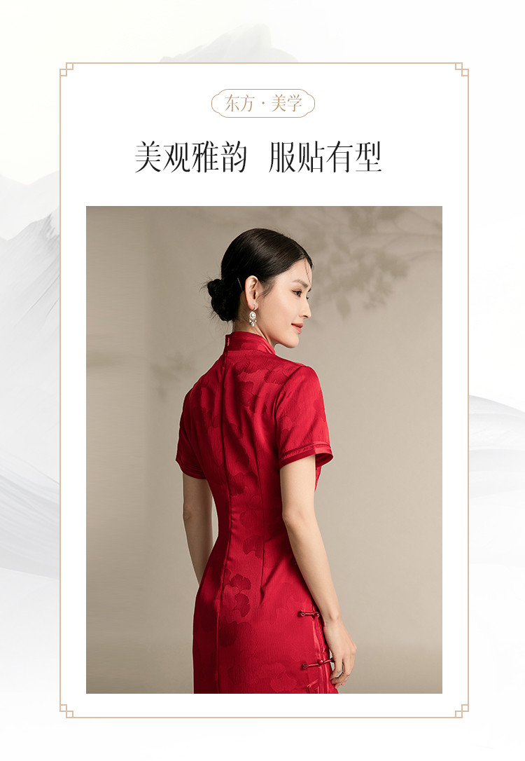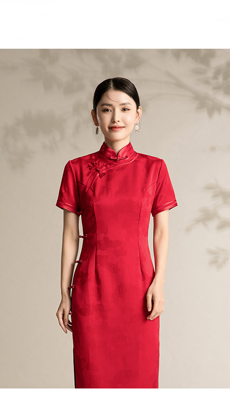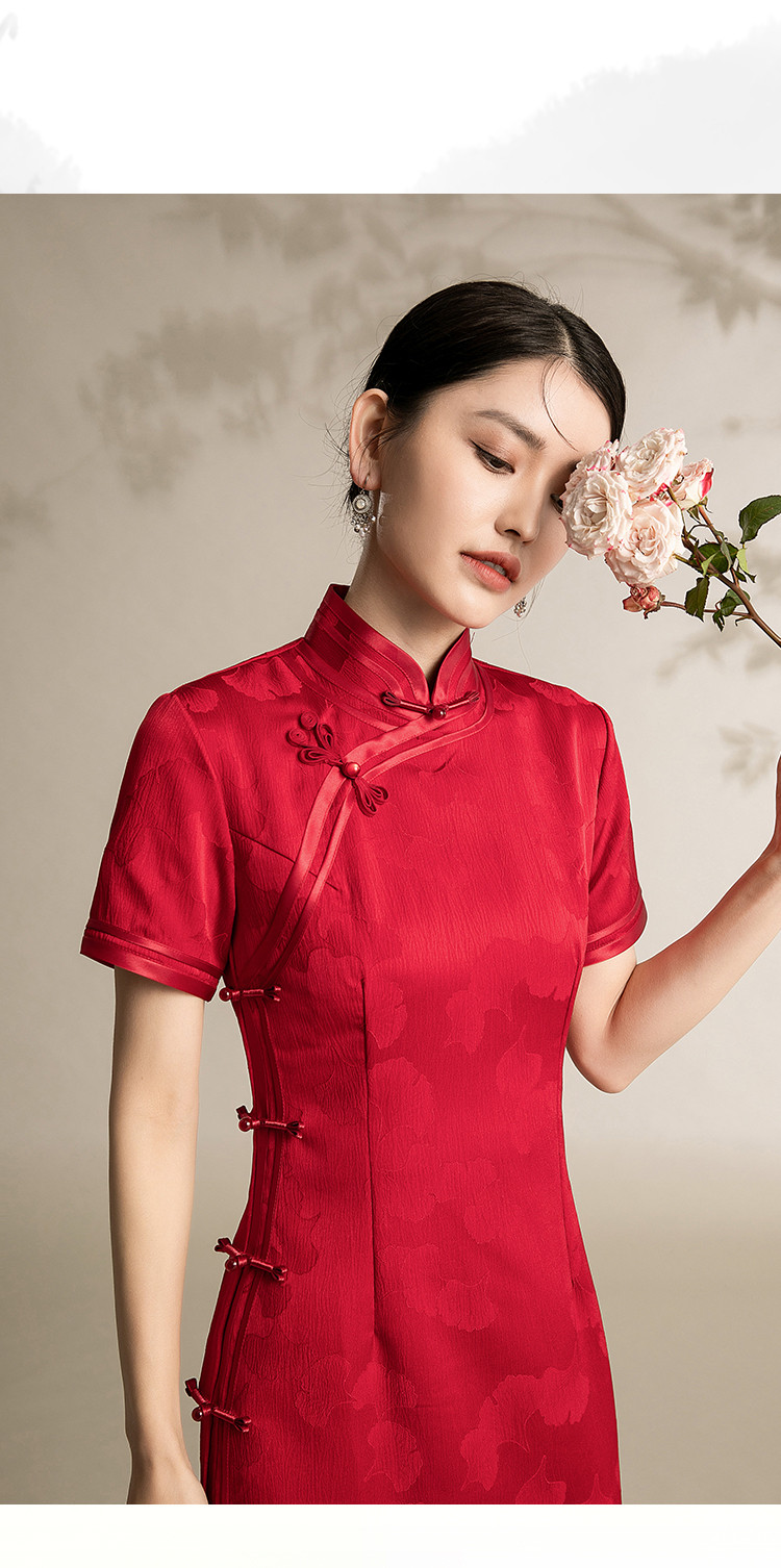 商品名称:新中式改良旗袍复古一片式显瘦中长款红色提花连衣裙 099743