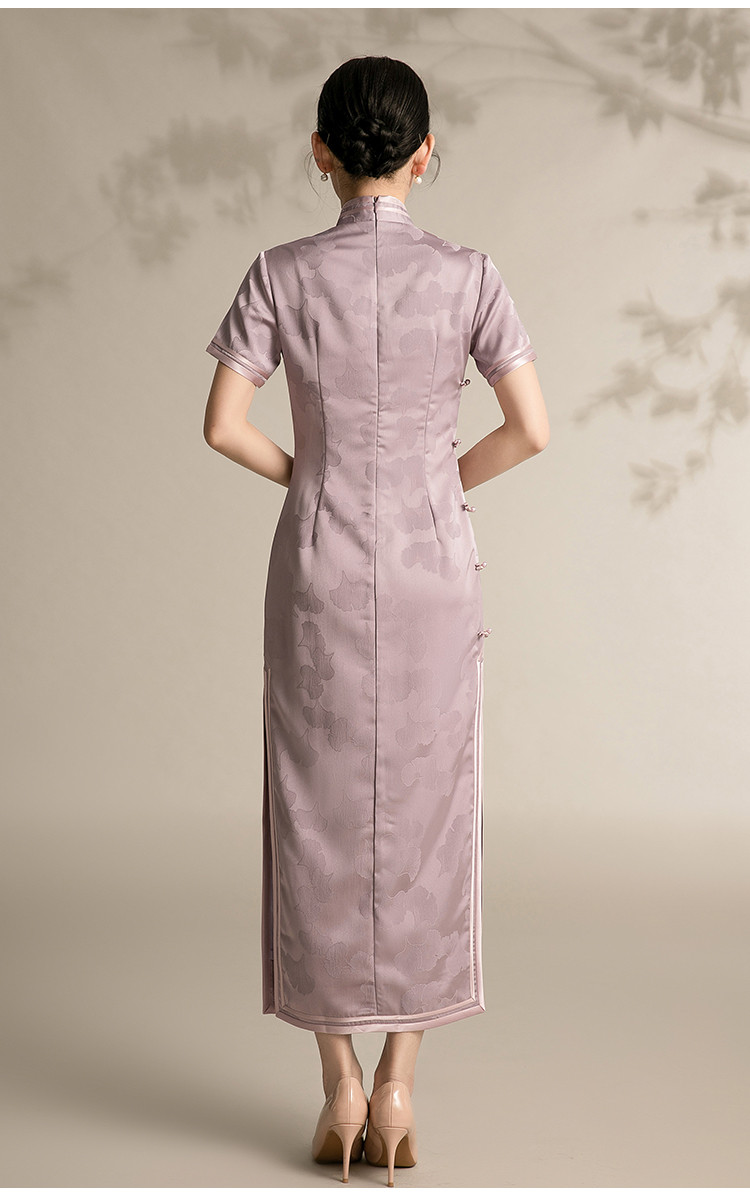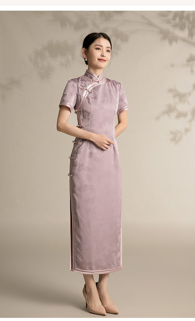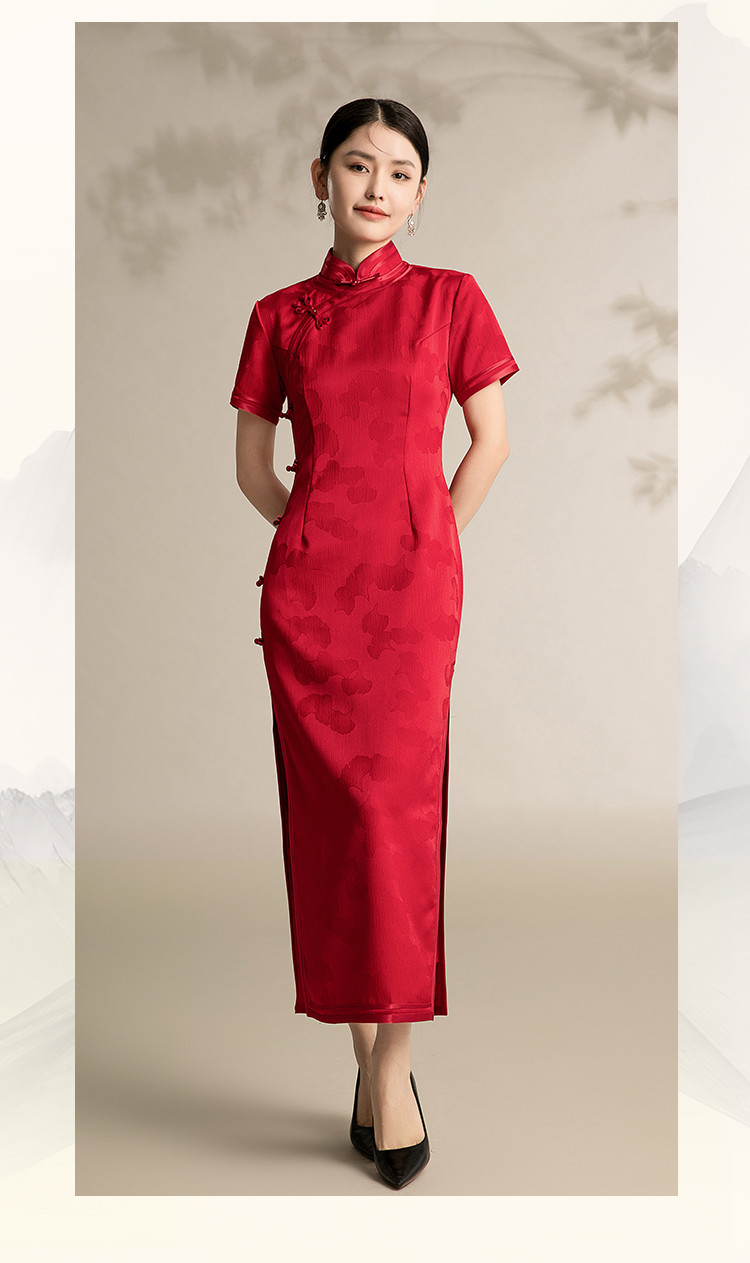 新中式改良旗袍复古一片式显瘦中长款红色提花连衣裙 099743
