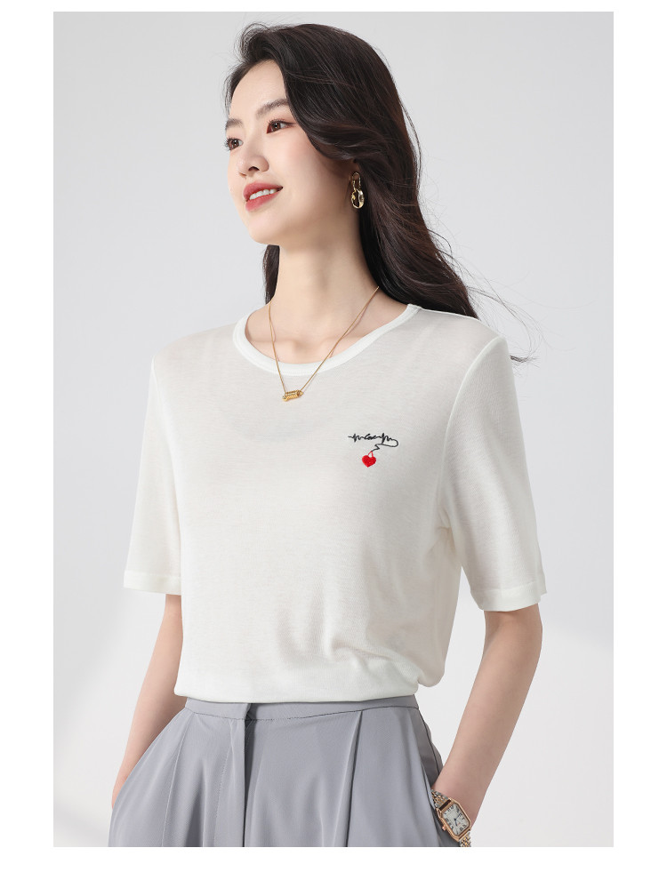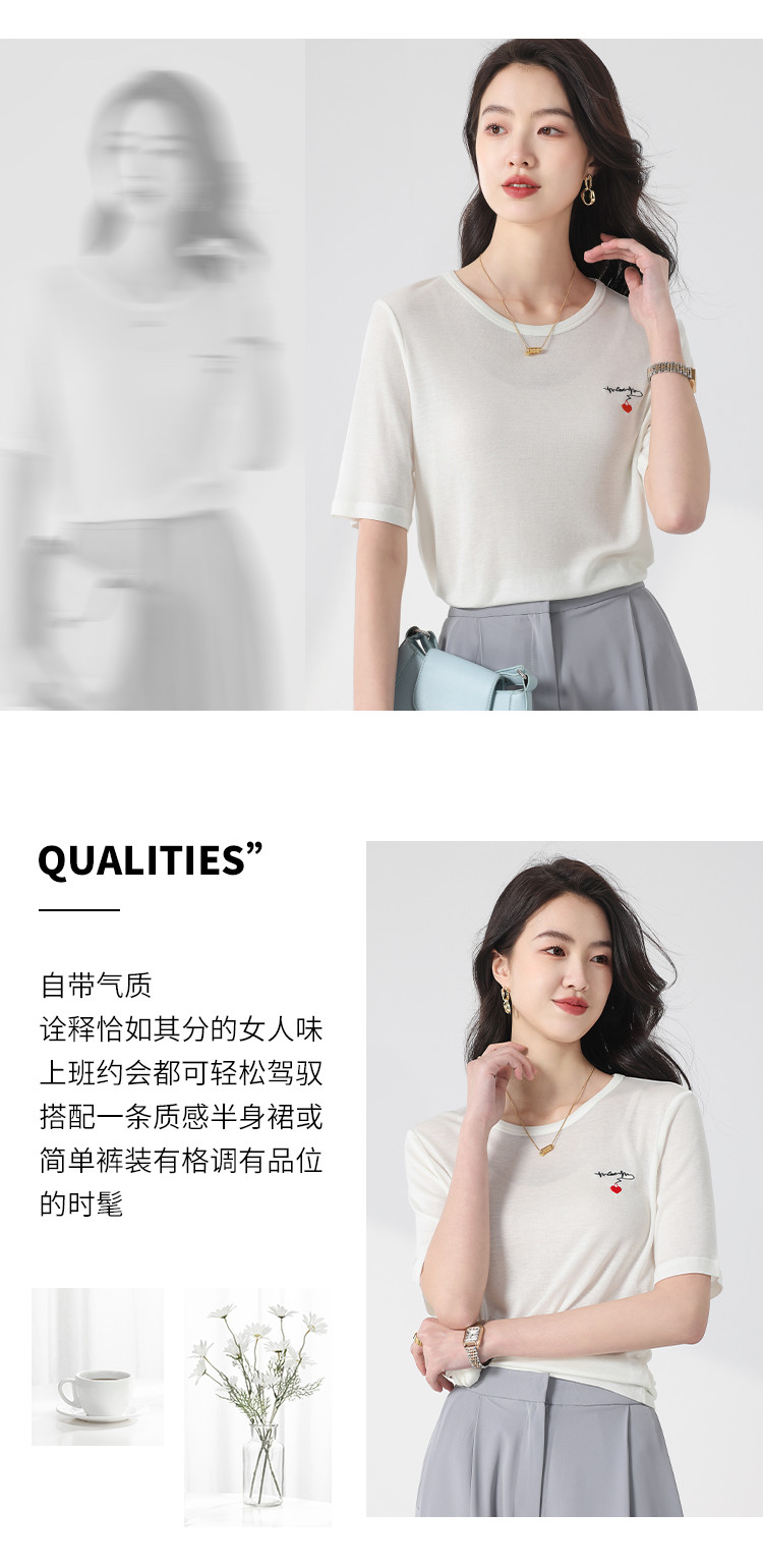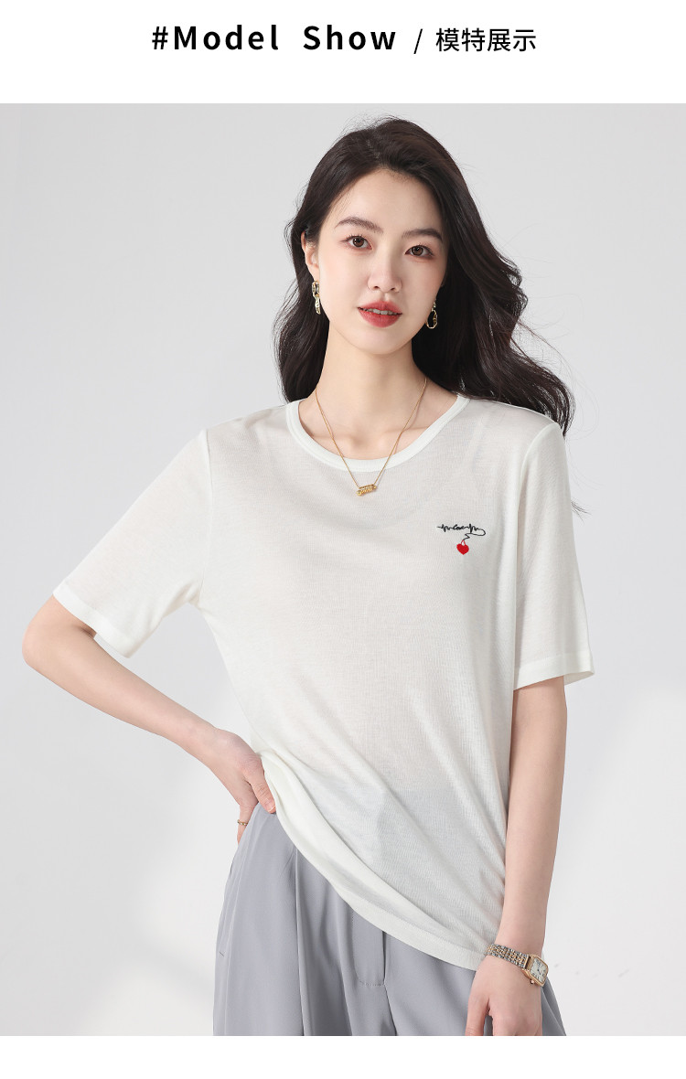 商品名称:简约百搭纯色刺绣爱心圆领含绵羊毛针织打底短袖T恤轻薄透气 265427