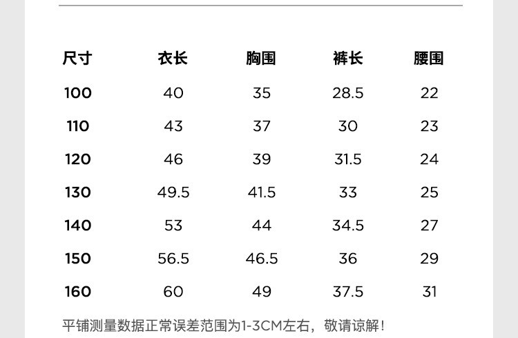 | 尺码 | 上装号型 | 适合年龄 | 下装号型 | 衣长(cm) | 身高(cm) | 腰围(cm) | 裤长(cm) | 胸围(cm) | 号型 |