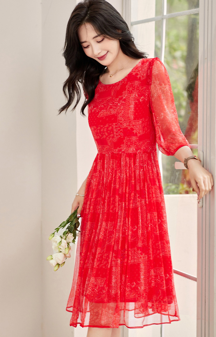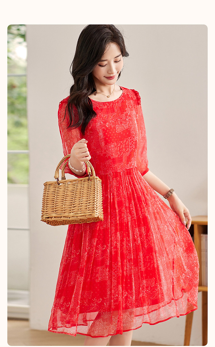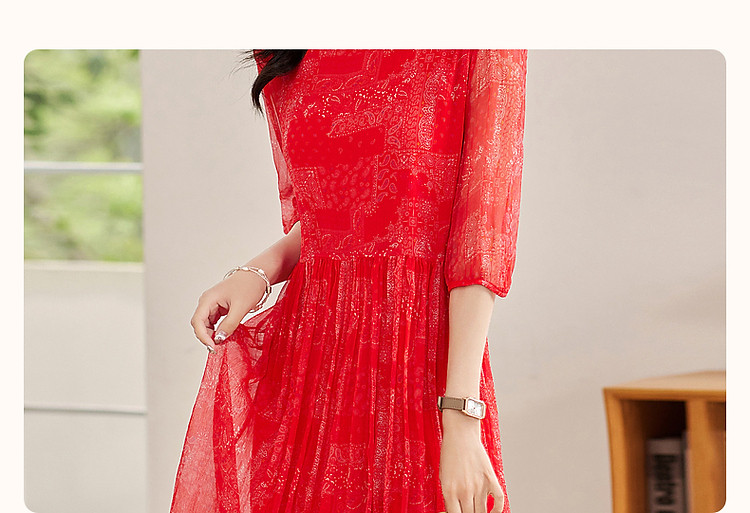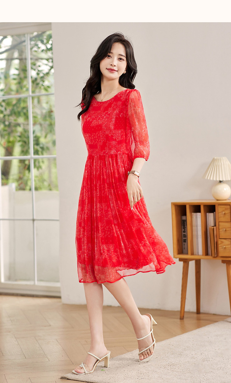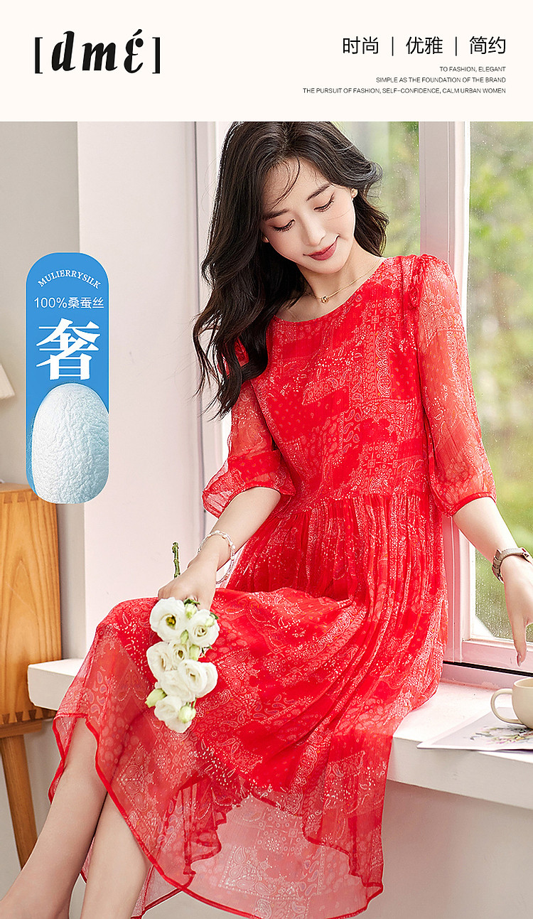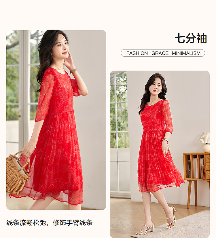 商品名称:【薄荷曼波】夏度假风桑蚕丝真丝抽褶七分袖遮肉连衣裙女 801025