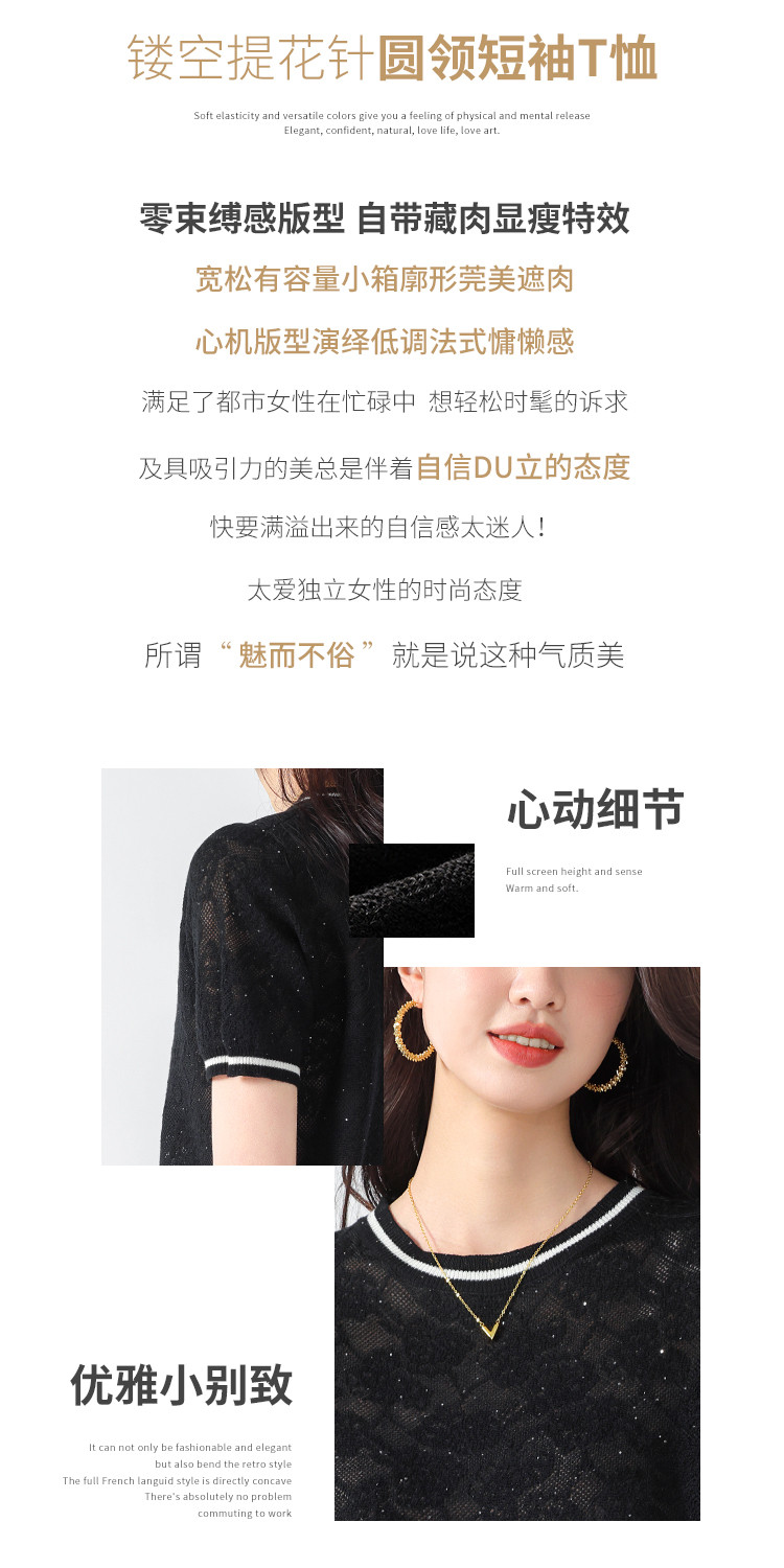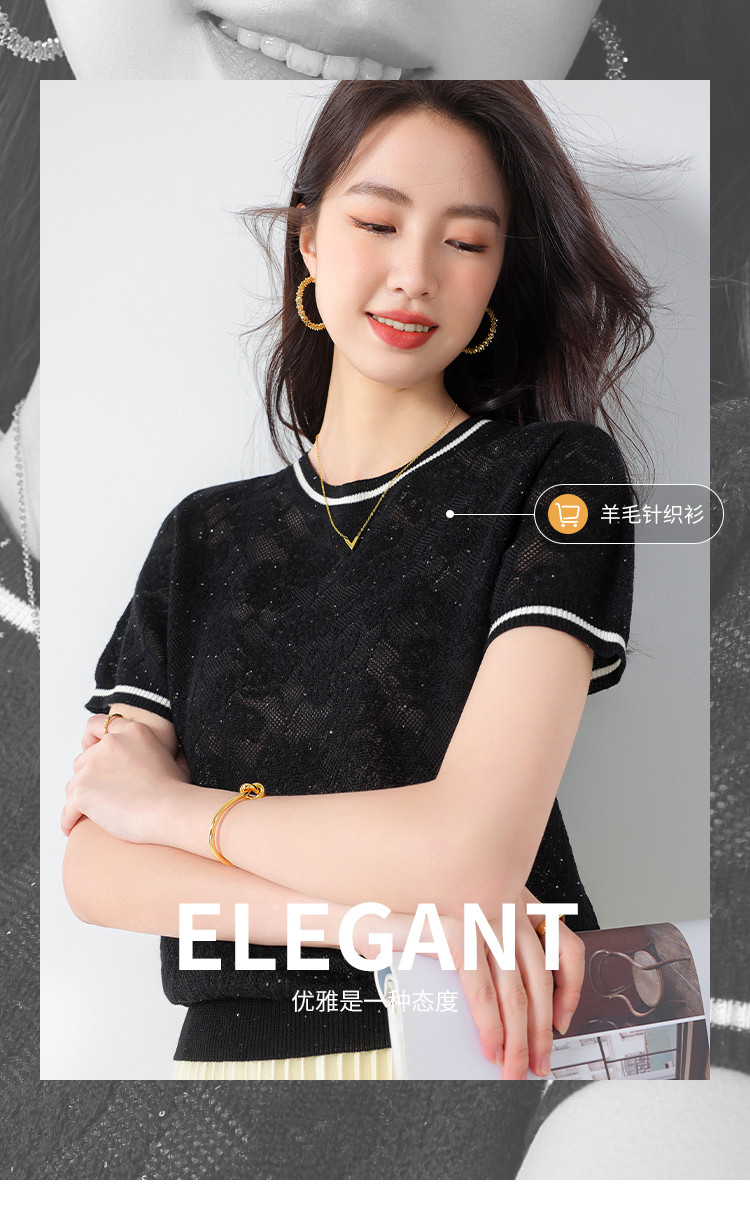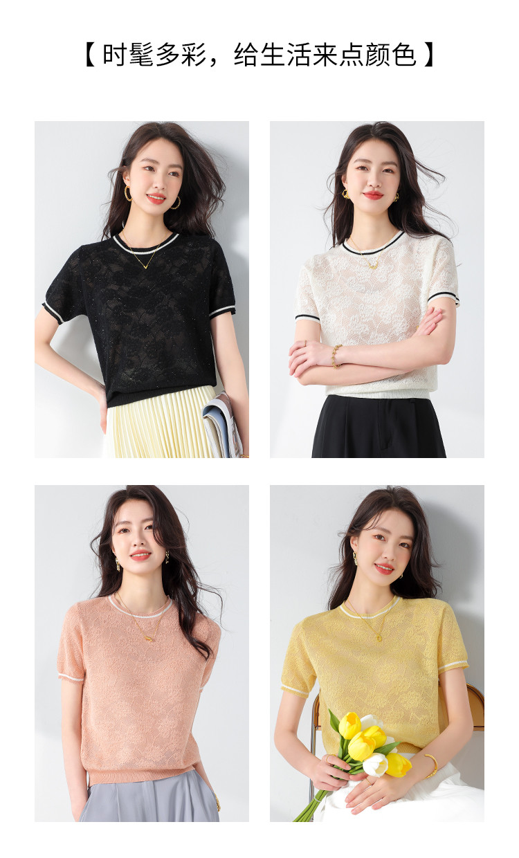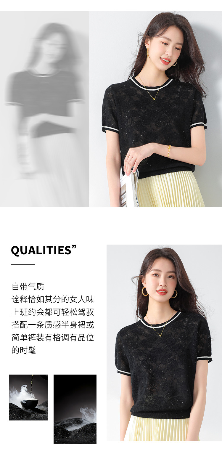 商品名称:夏季纯色圆领镂空提花含羊毛短袖T恤女针织打底衫 095635
