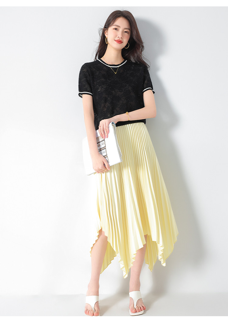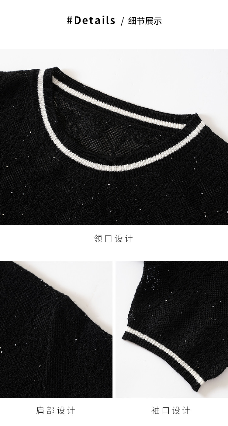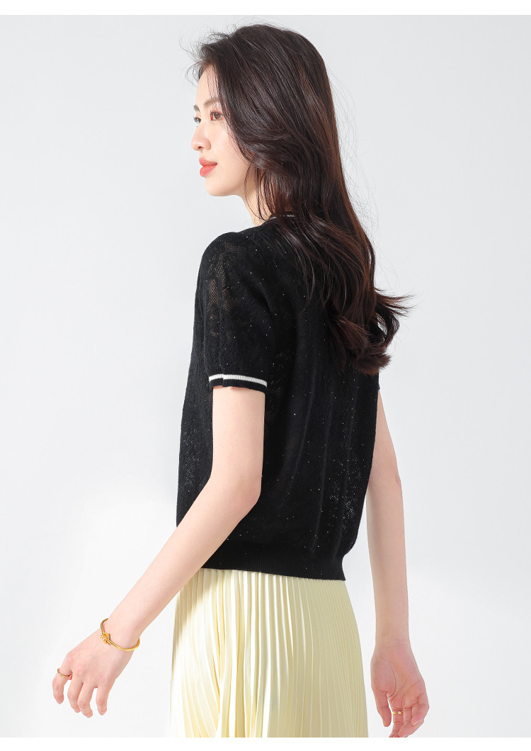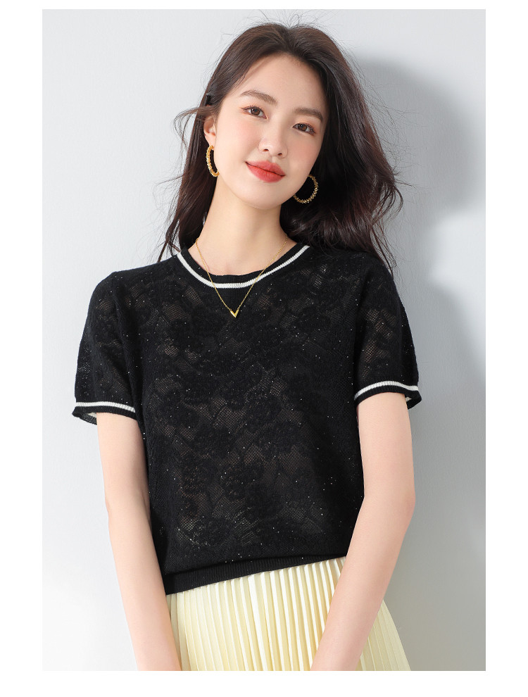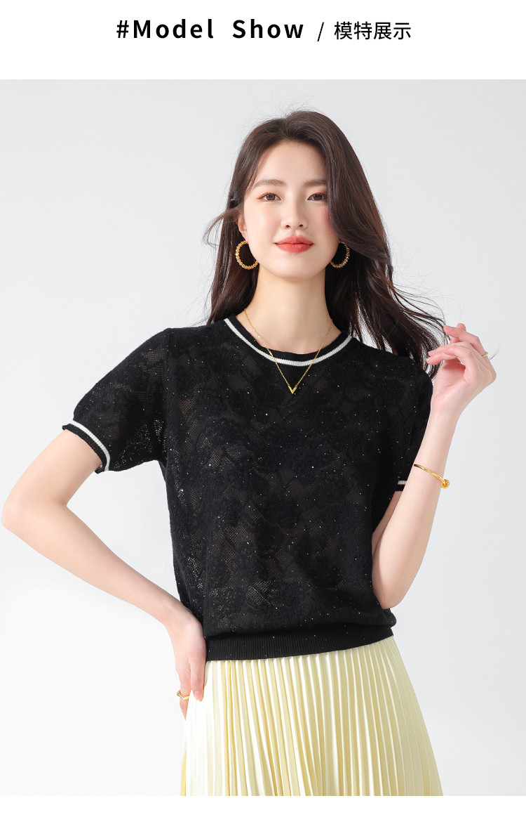 商品名称:夏季纯色圆领镂空提花含羊毛短袖T恤女针织打底衫 095635