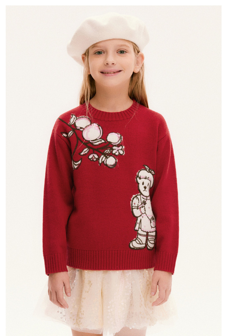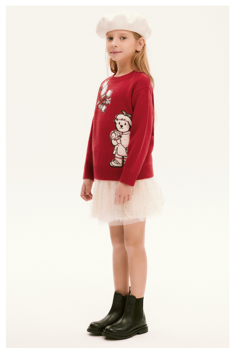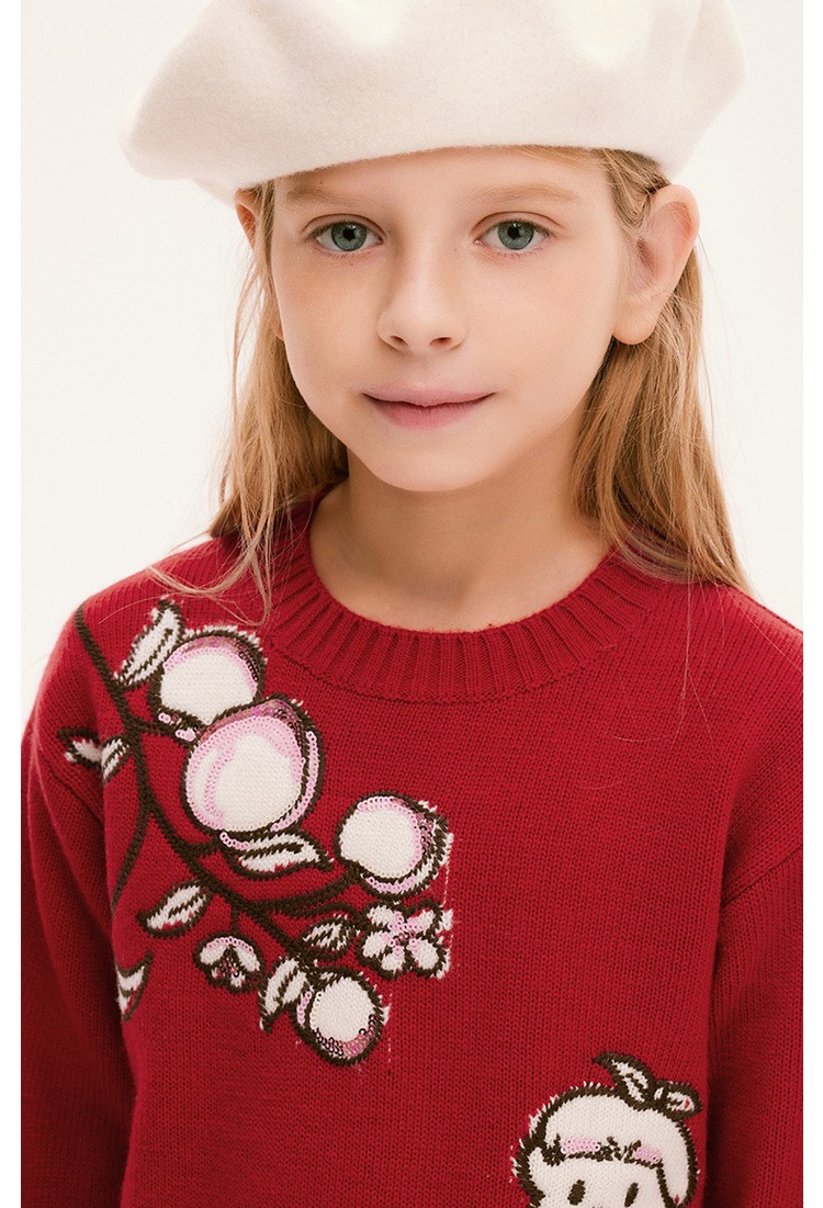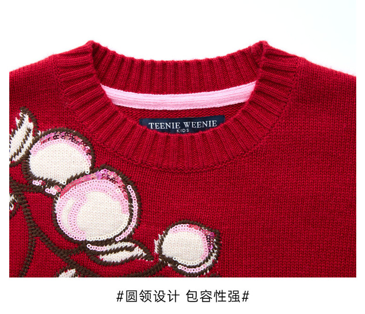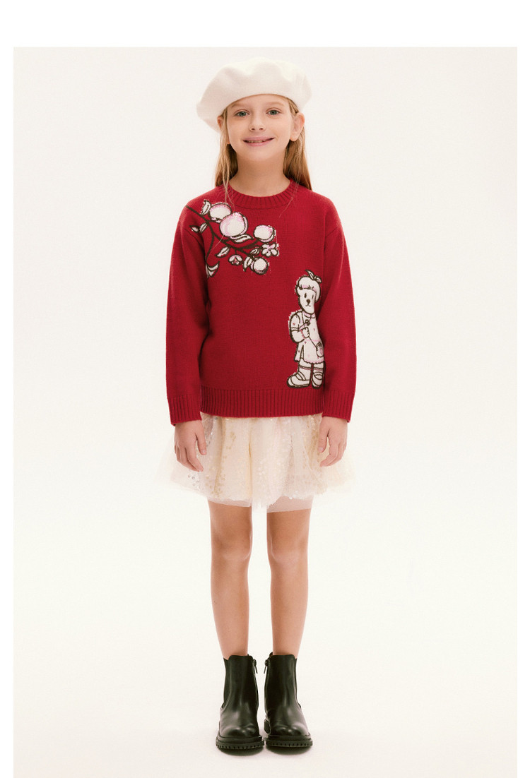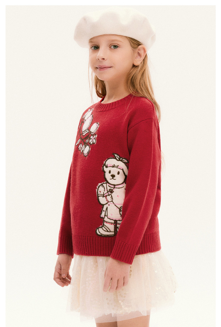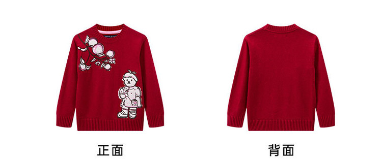 商品名称:小熊童装红色春季款女童提花圆领套头针织毛衣 519745