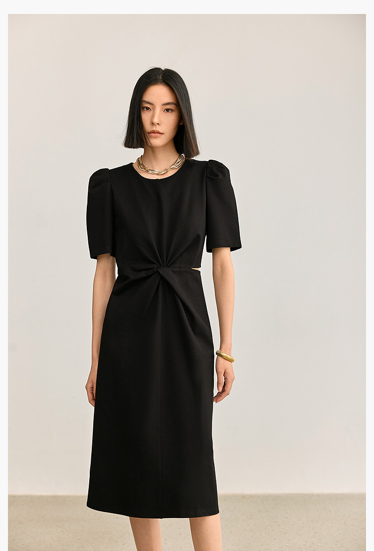 夏季别致镂空气质通勤百搭复古泡泡袖连衣裙小黑裙 426011
