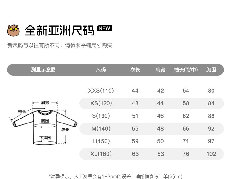 | 110cm(XXS) | 44 | 42 | 110 | 54 | 4-5岁 | 80 | 110/56 |