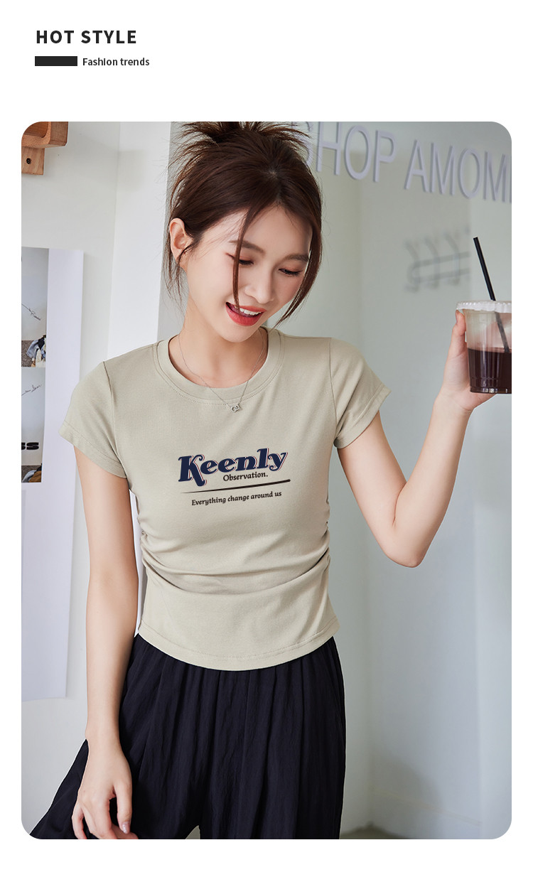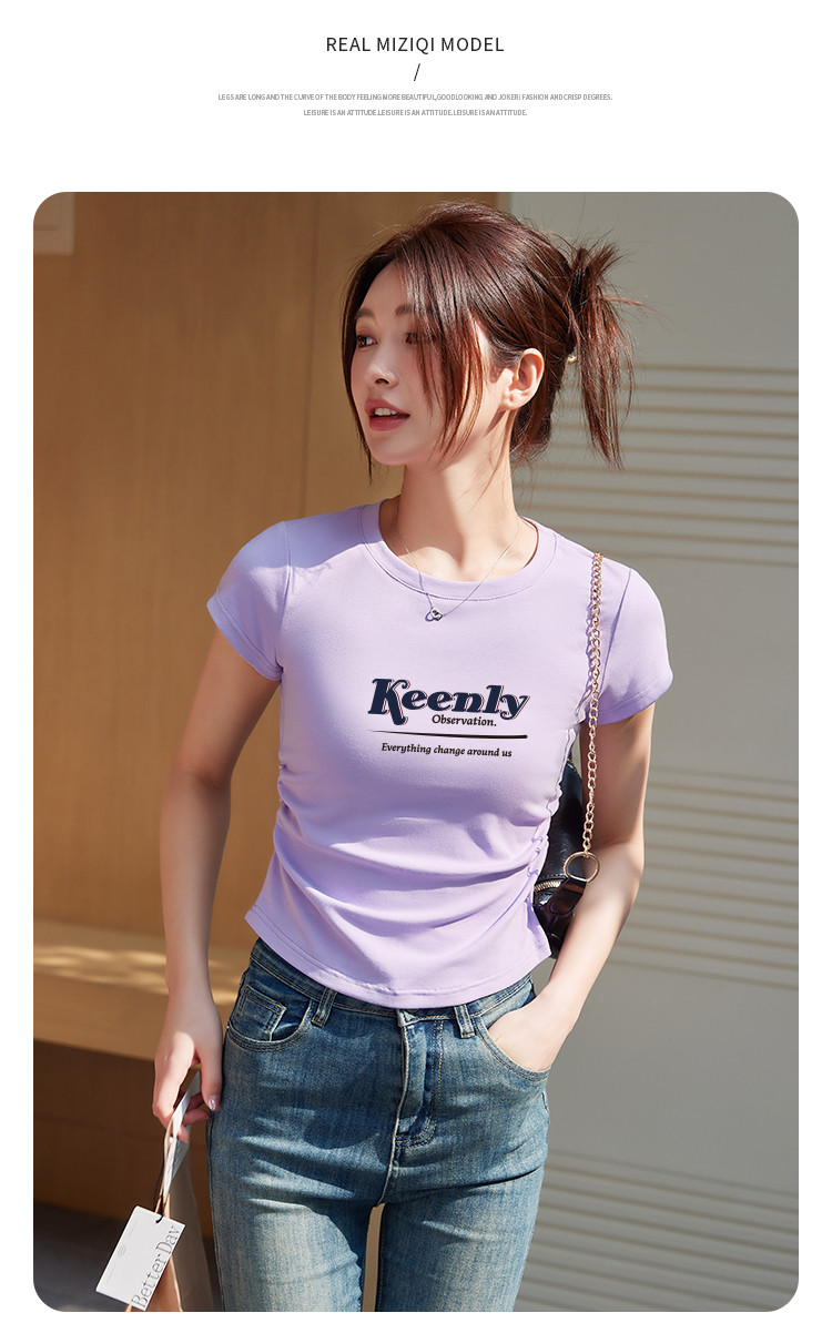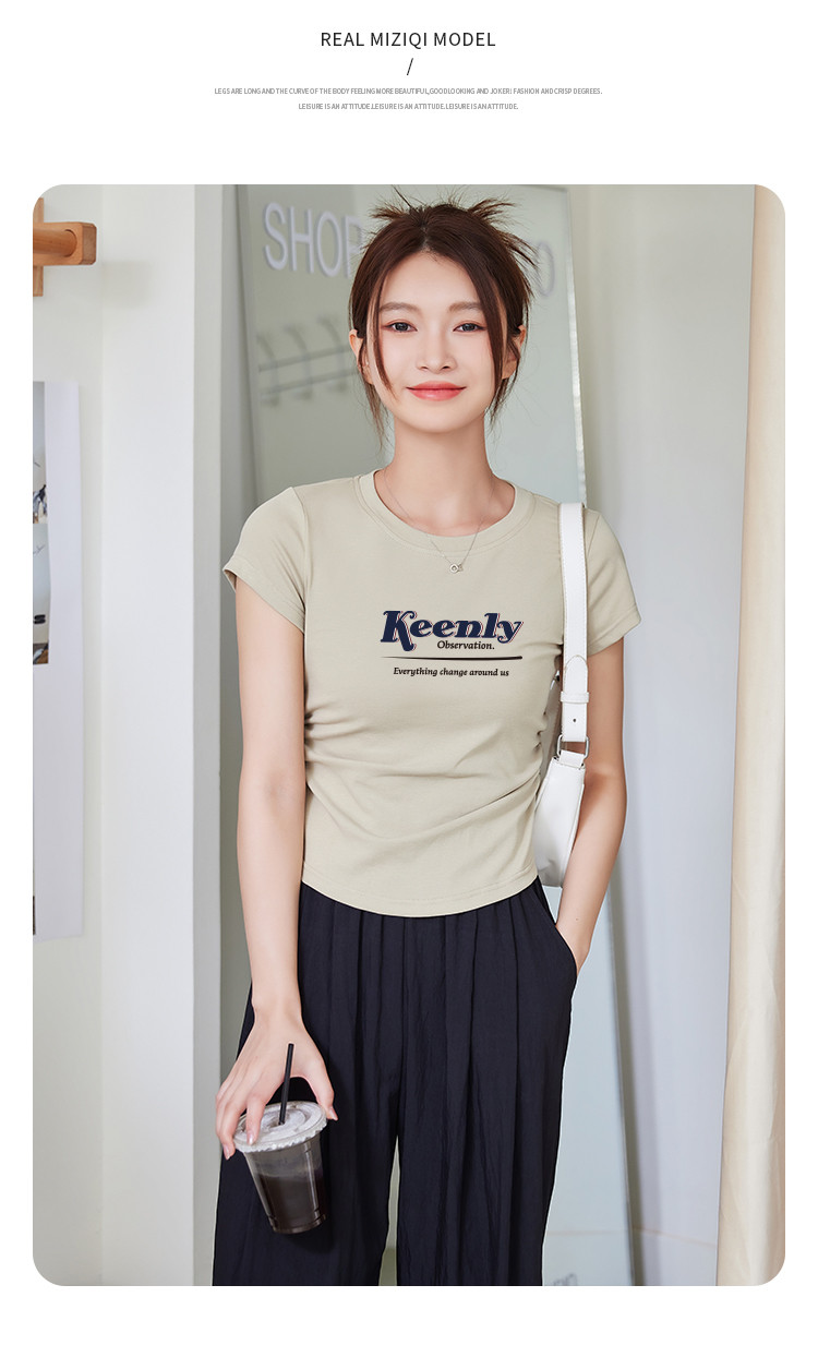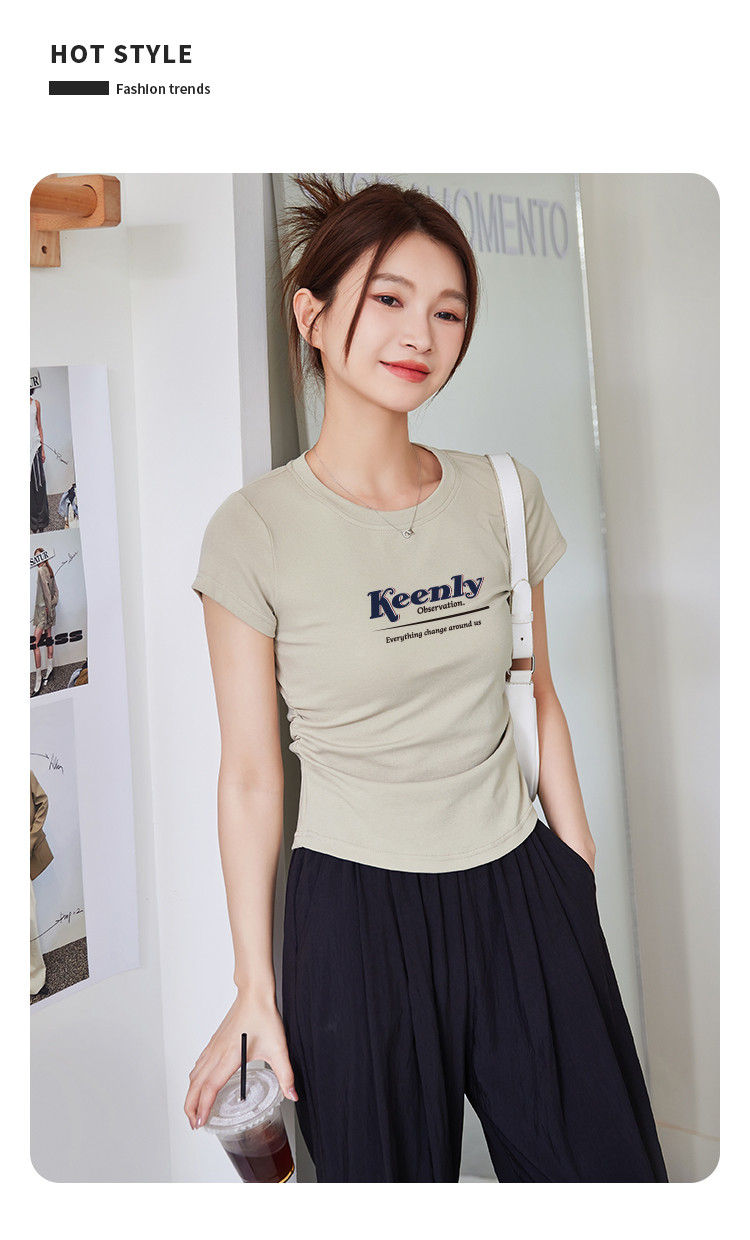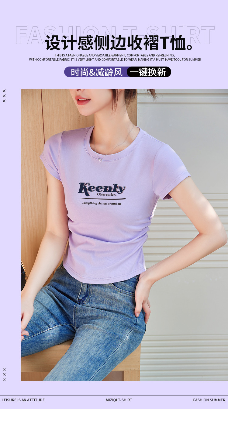 商品名称:米子旗夏装款圆领印花T恤女侧边褶皱修身短袖上衣 311066