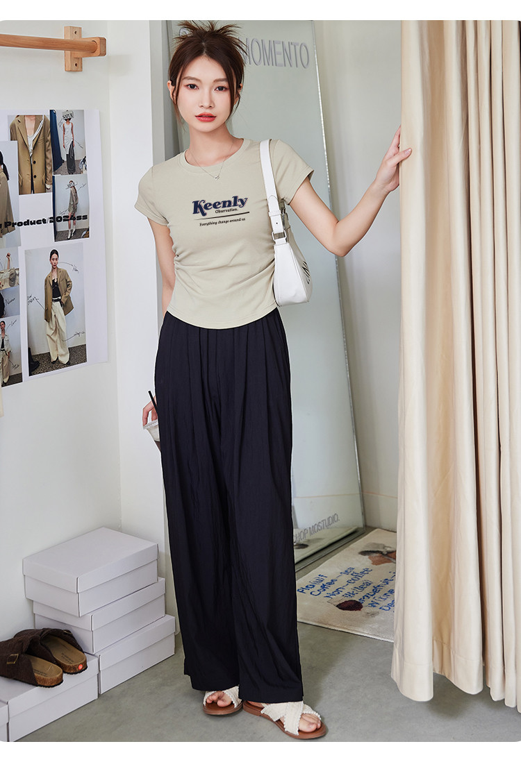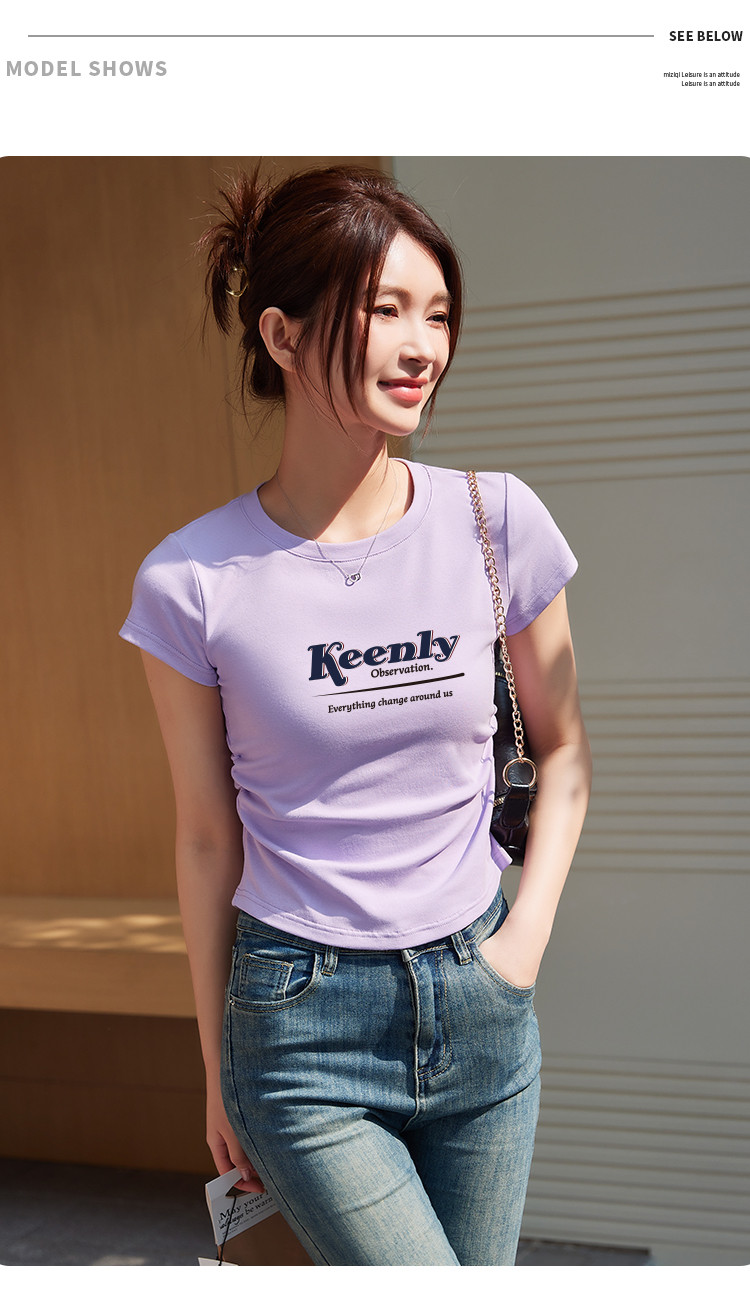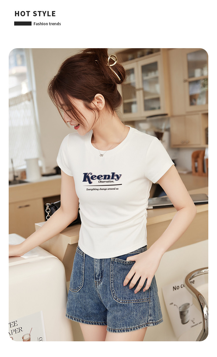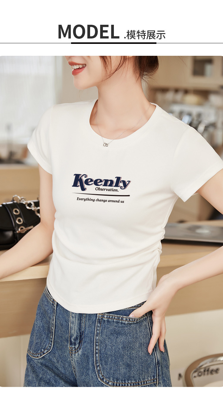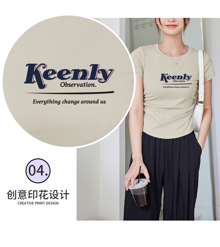 商品名称:米子旗夏装款圆领印花T恤女侧边褶皱修身短袖上衣 311066