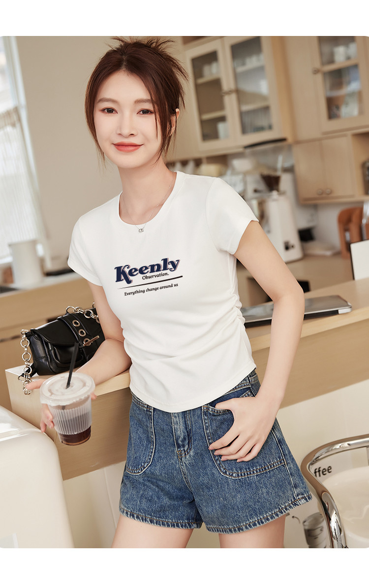 米子旗夏装款圆领印花T恤女侧边褶皱修身短袖上衣 311066