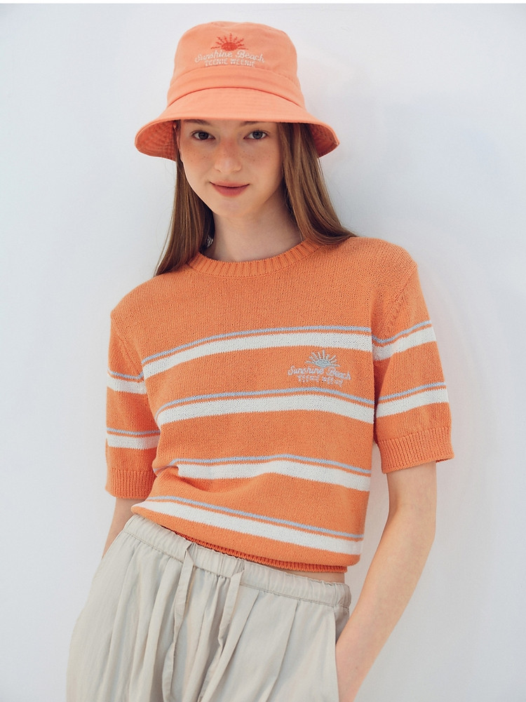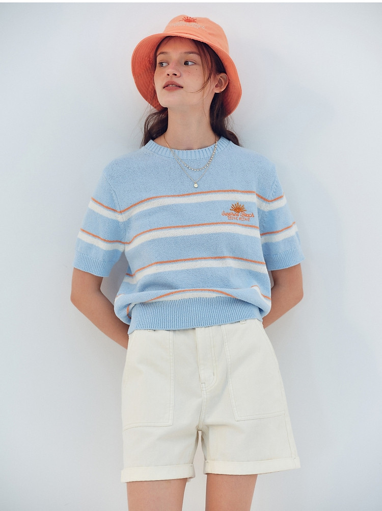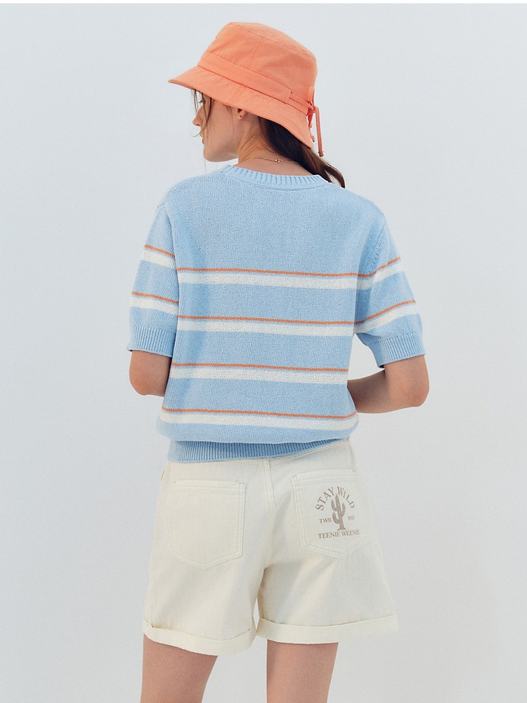 小熊针织T恤夏季度假风撞色条纹短袖针织薄款多巴胺套头毛衫上衣 345345