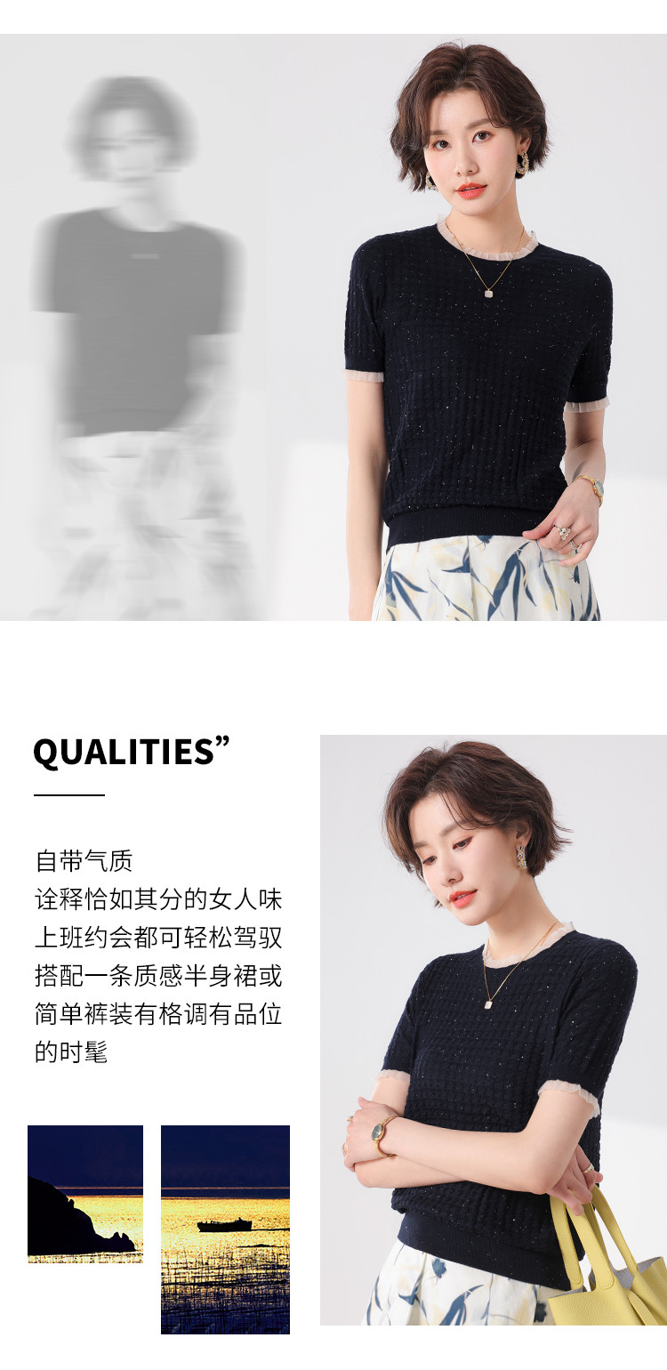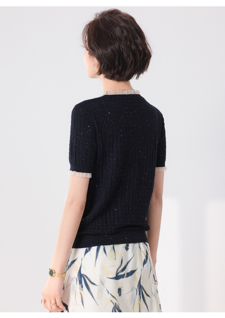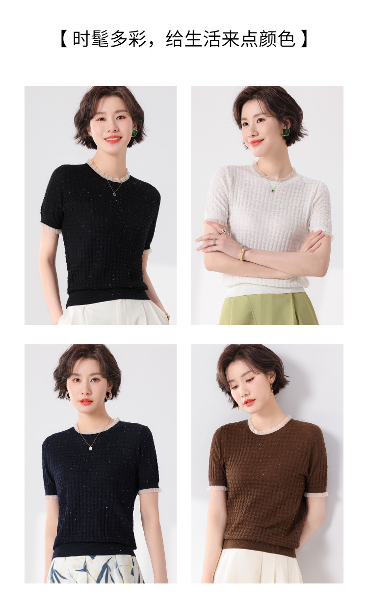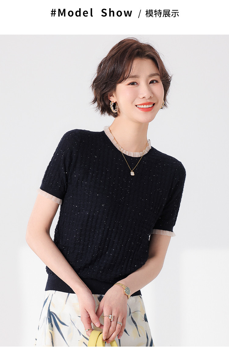 商品名称:优雅淑女荷叶领含绵羊毛短袖T恤针织打底衫毛衣线衫 219091