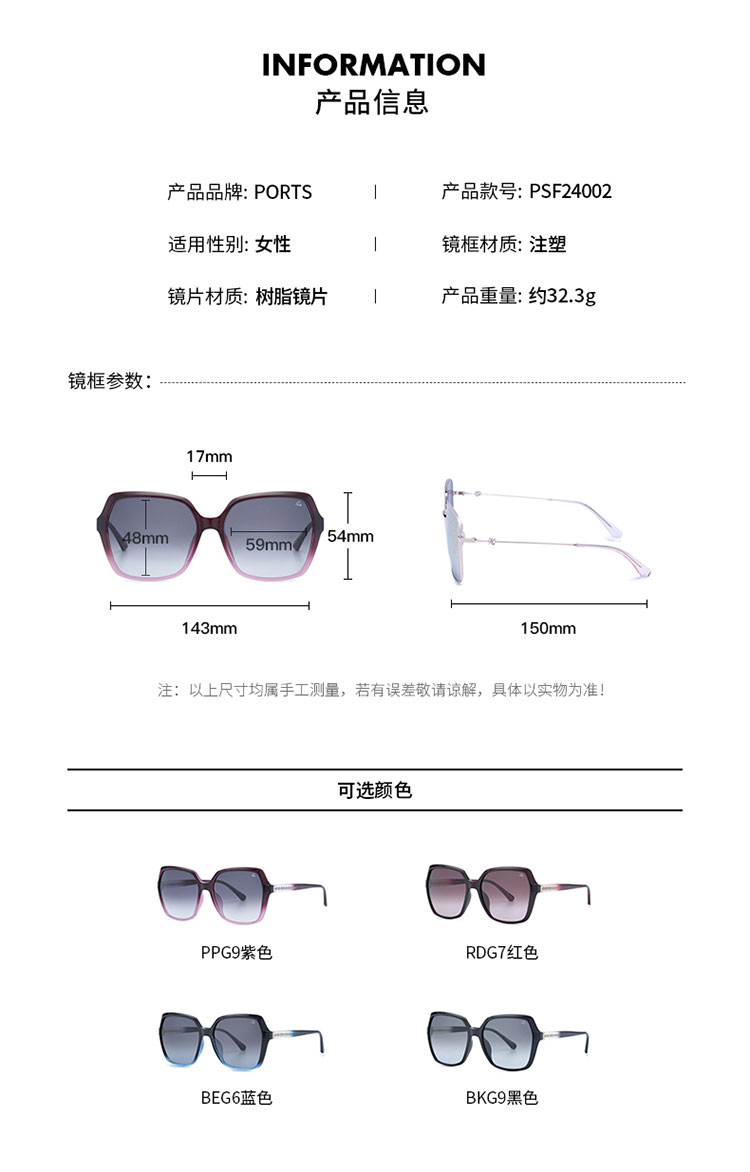 商品名称:PORTS女款休闲百搭大气注塑太阳镜PSF24002 533386