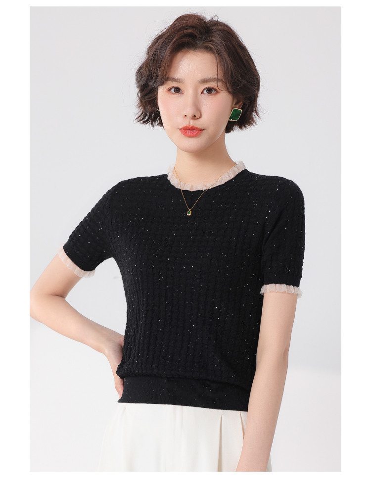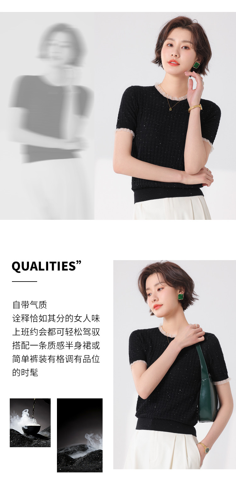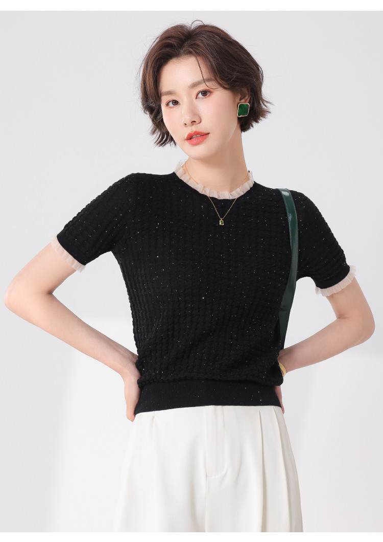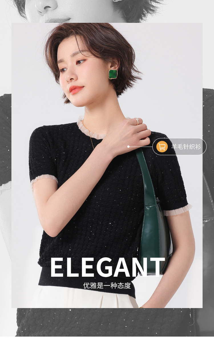 商品名称:优雅淑女荷叶领含绵羊毛短袖T恤针织打底衫毛衣线衫 204307