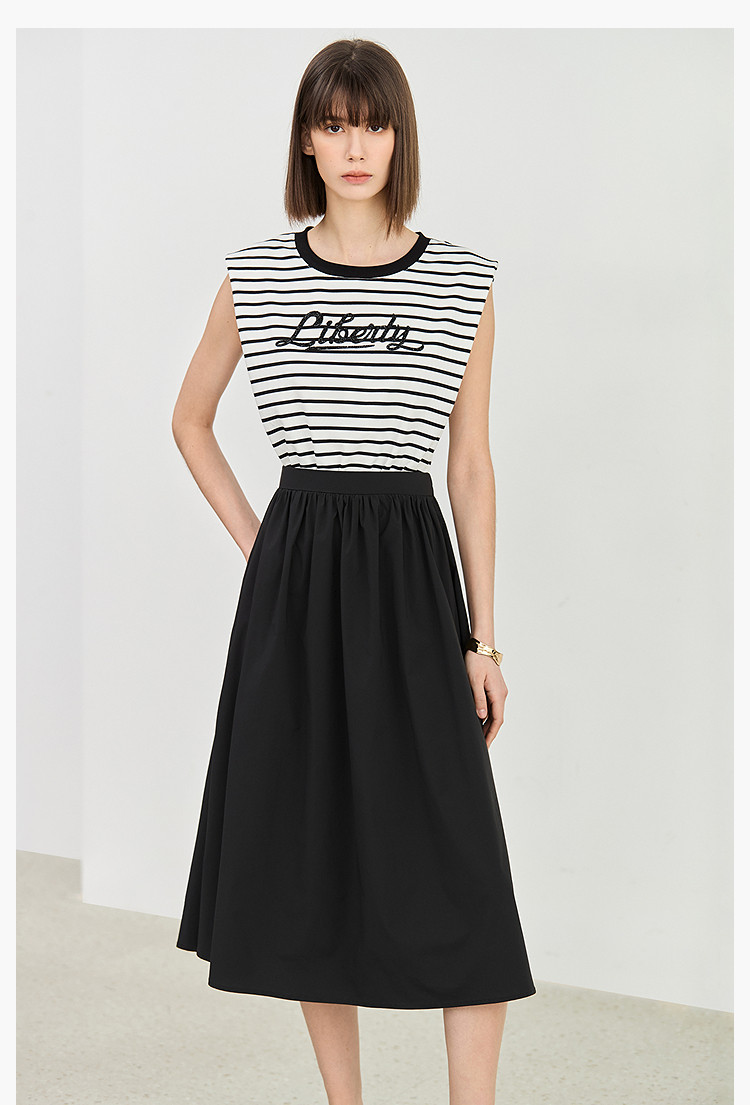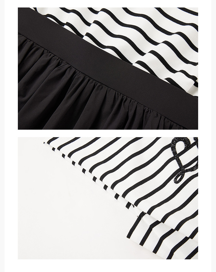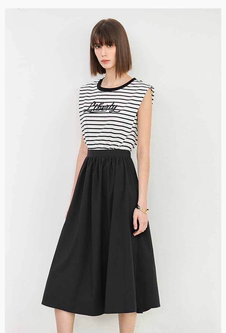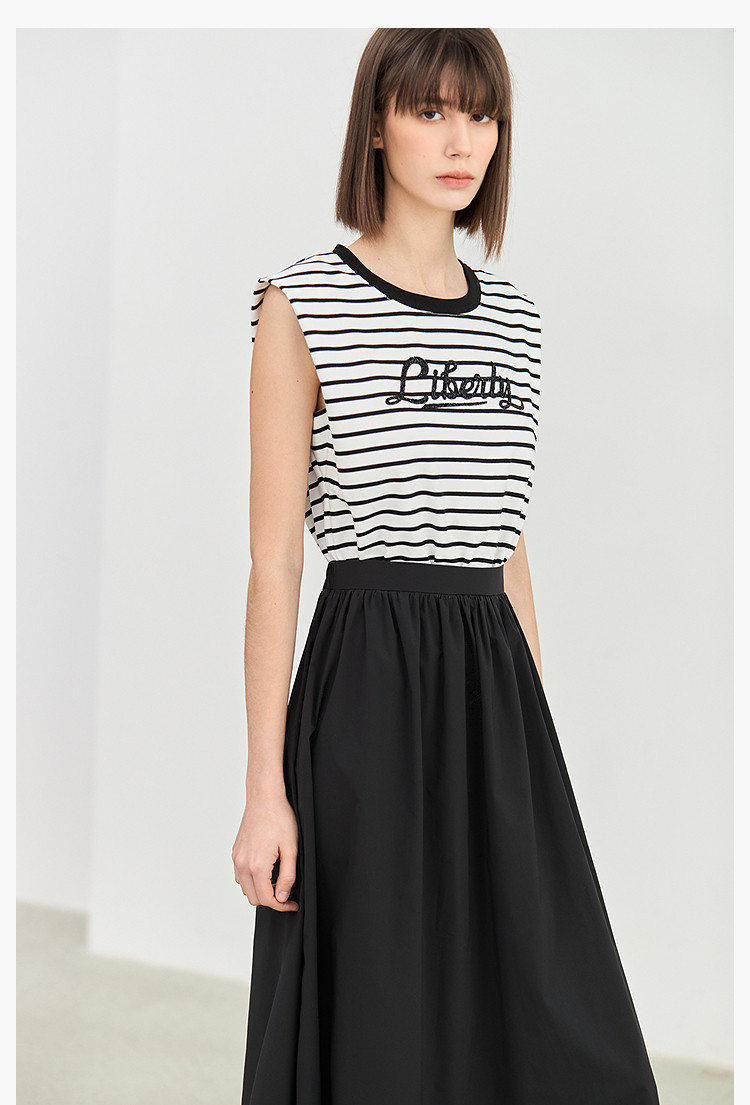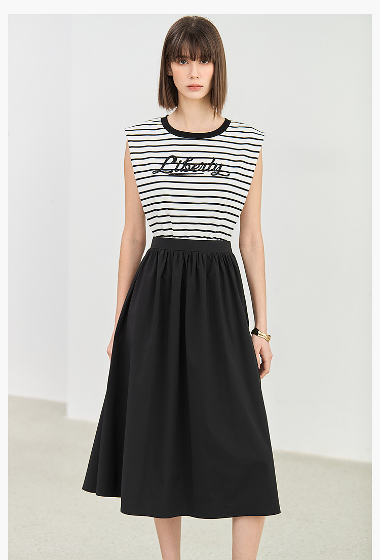 复古条纹设计感宽肩时尚拼接假两件高腰连衣裙 565915