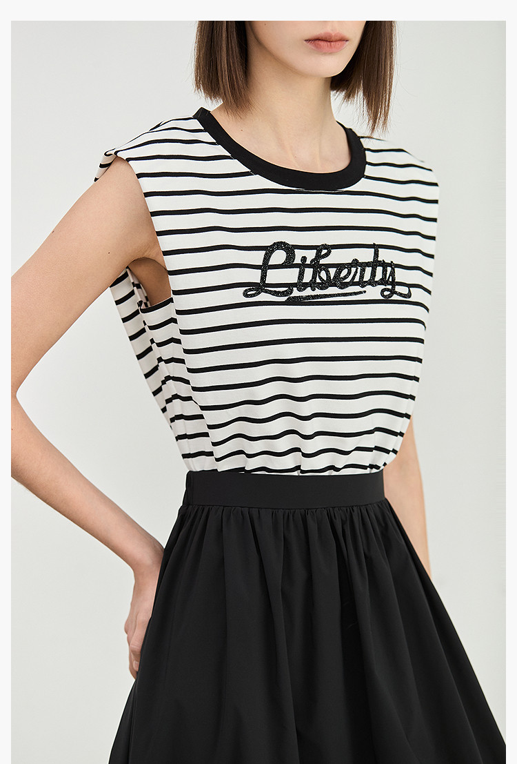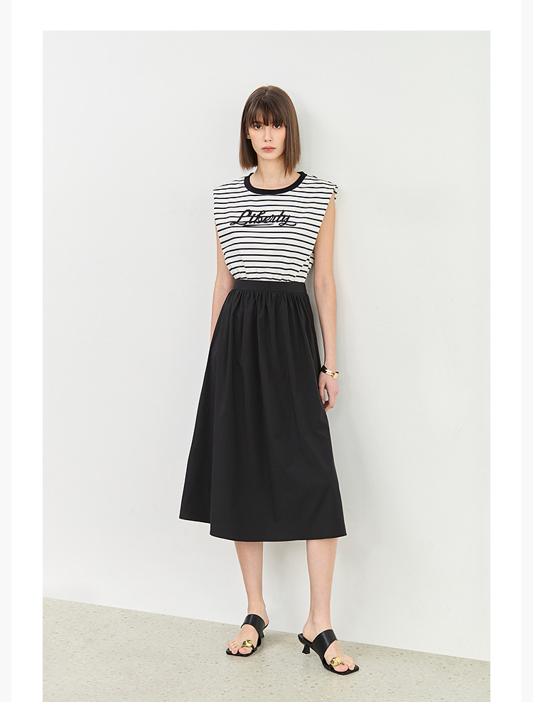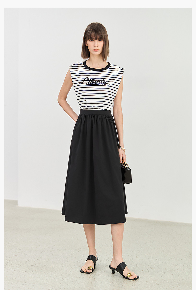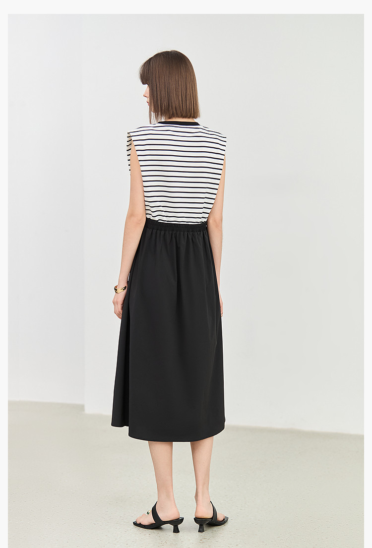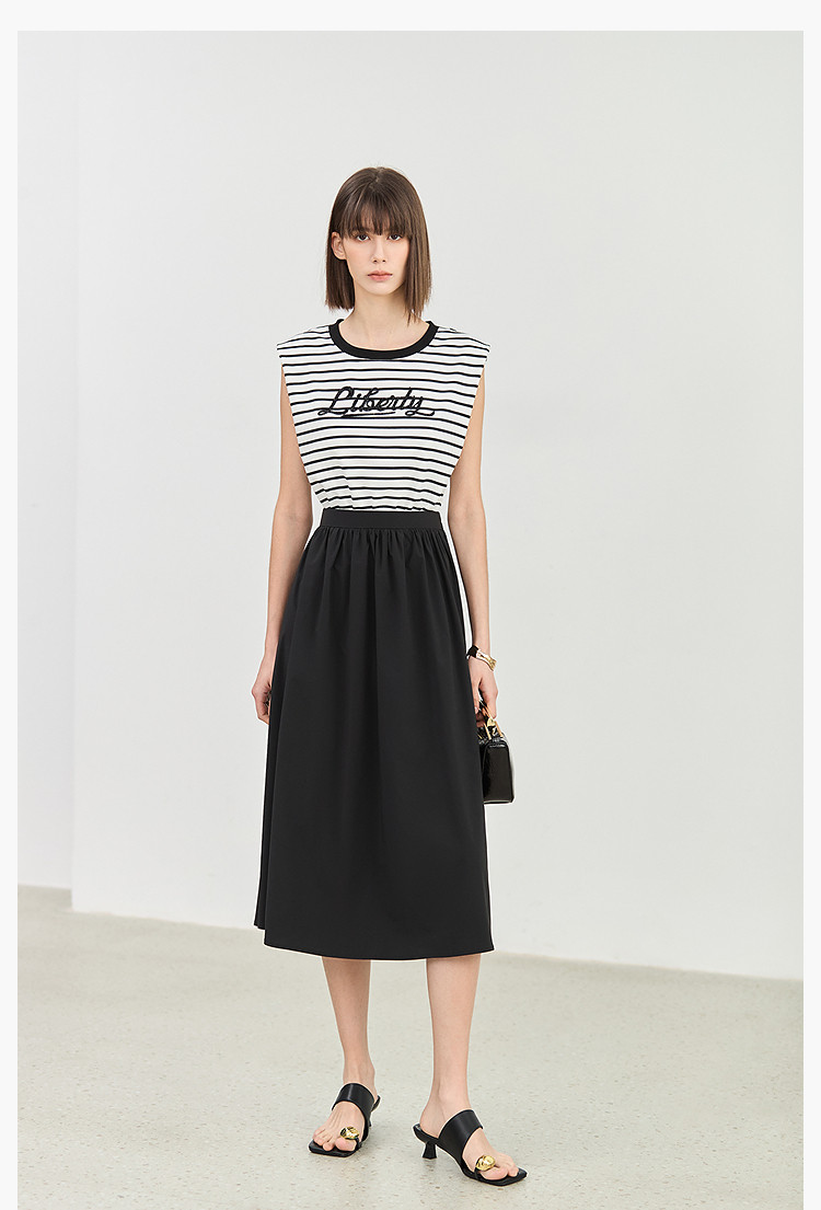 复古条纹设计感宽肩时尚拼接假两件高腰连衣裙 565915