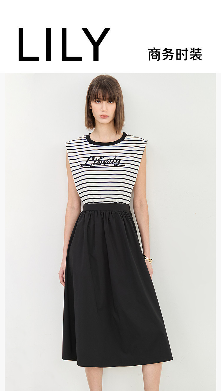 商品名称:复古条纹设计感宽肩时尚拼接假两件高腰连衣裙 565915