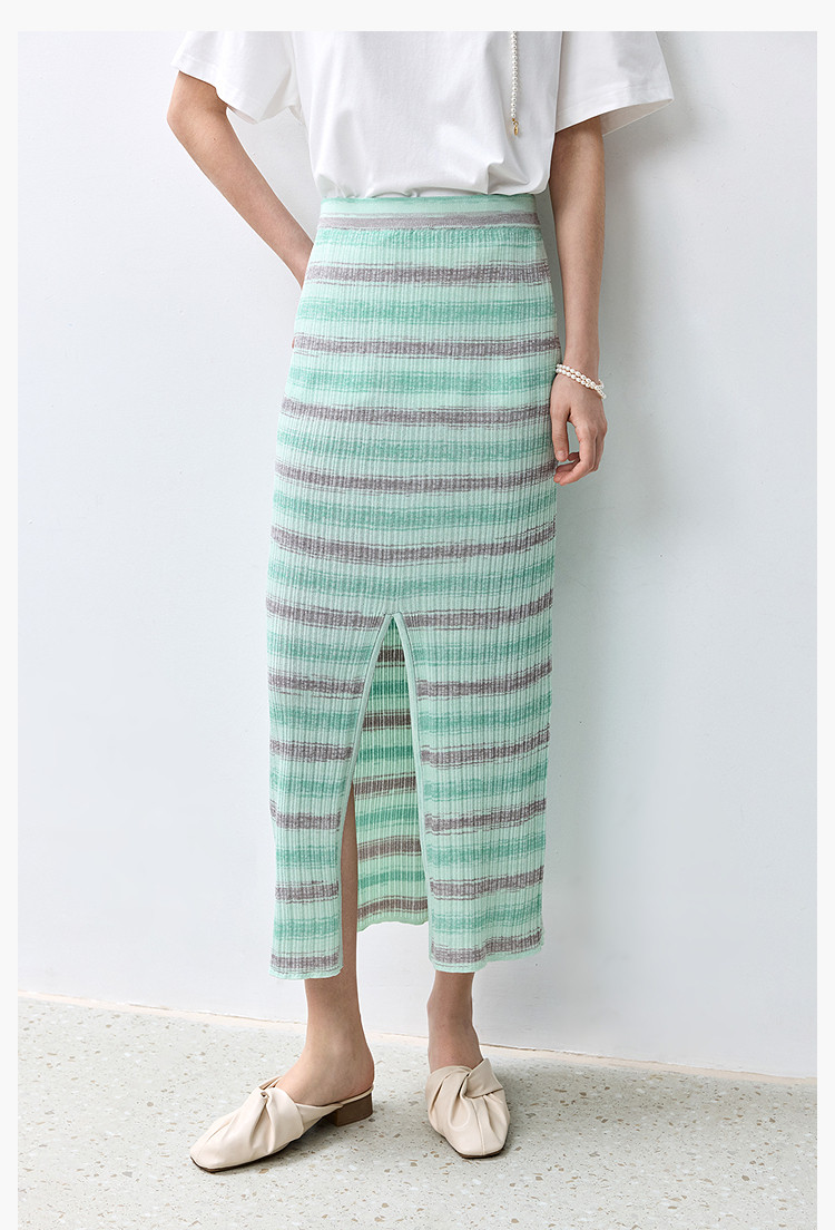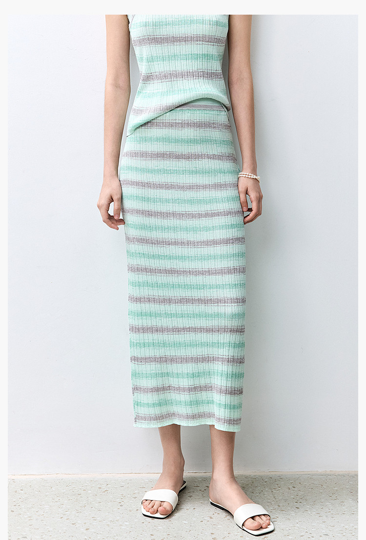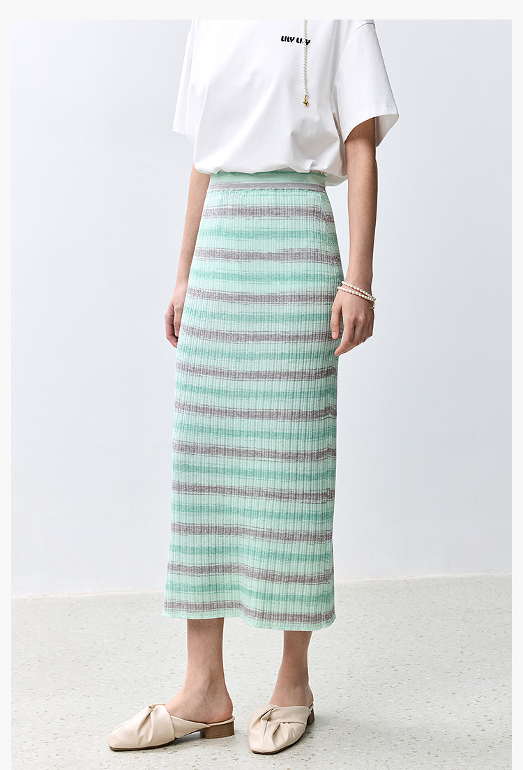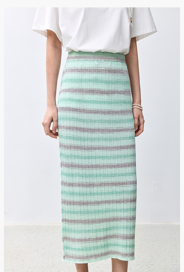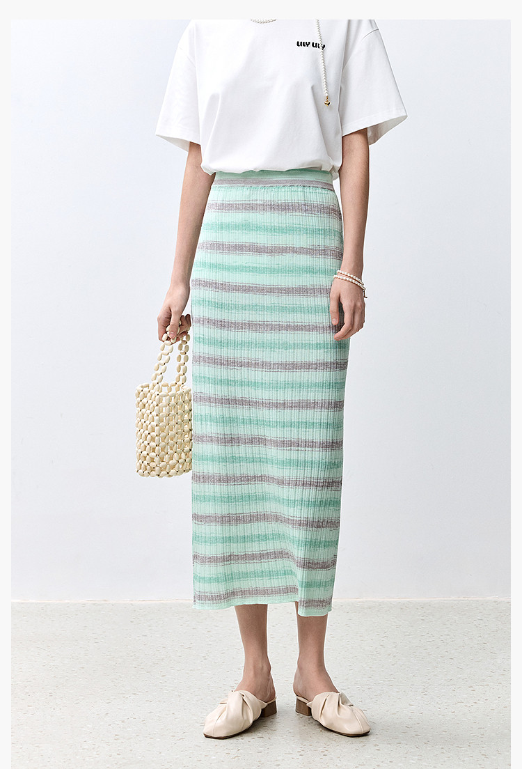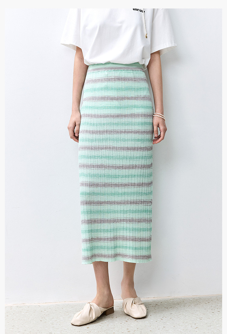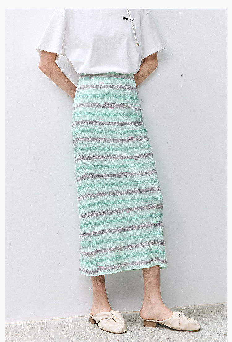 商品名称:夏季多巴胺色彩温柔气质薄荷曼波显瘦条纹半身裙 080283
