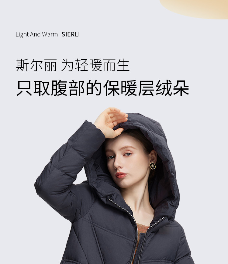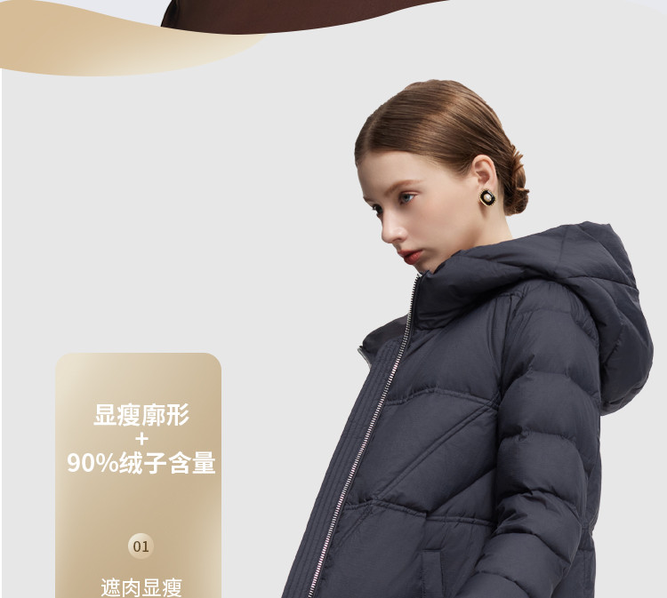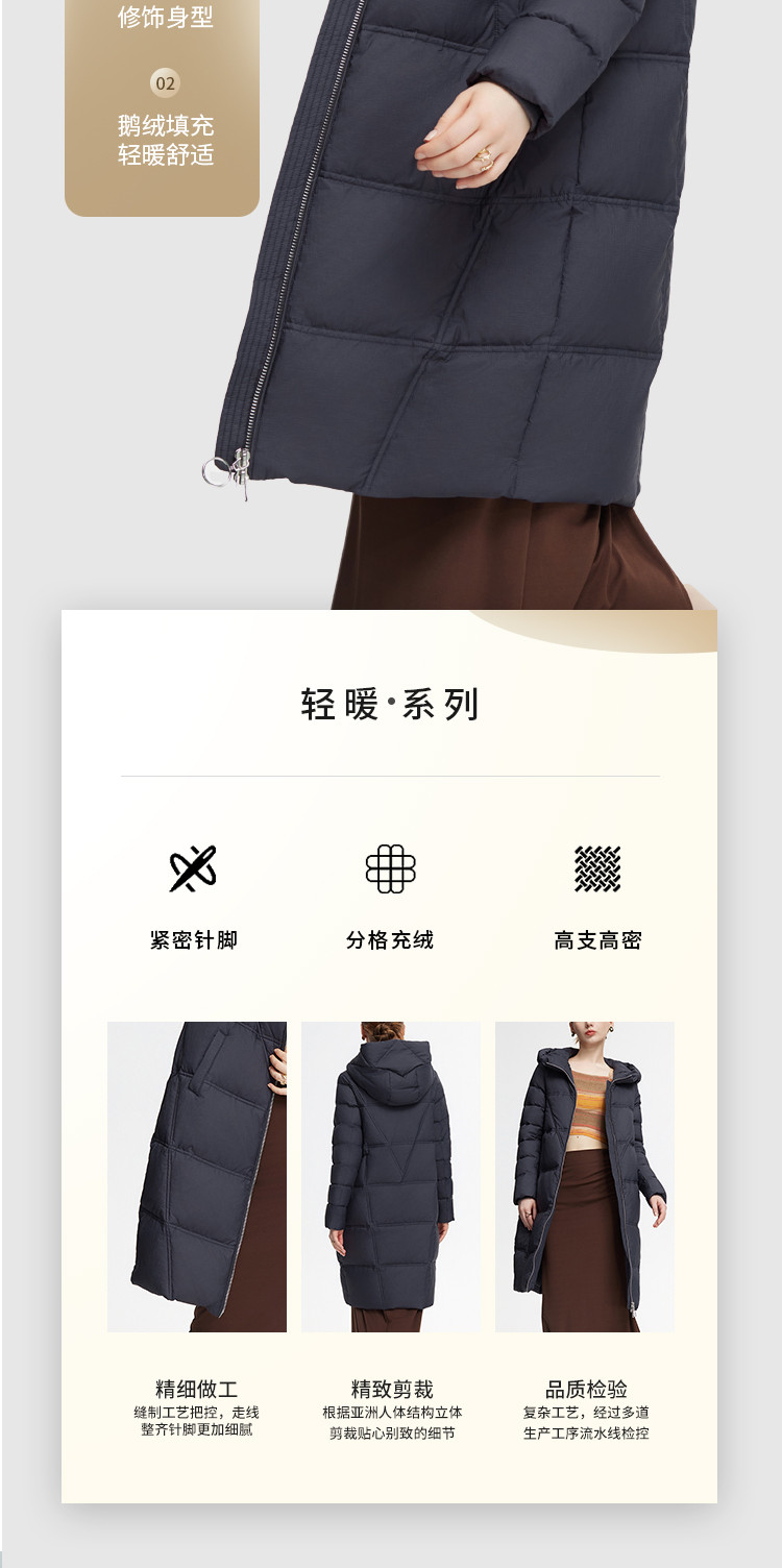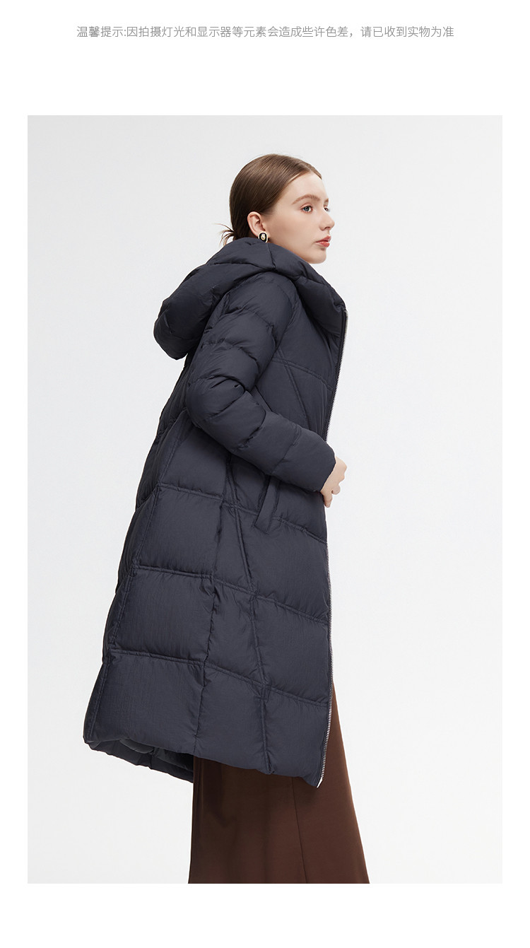 商品名称:【鹅绒】气质风纯色系修身连帽加厚保暖中长款羽绒服 160159