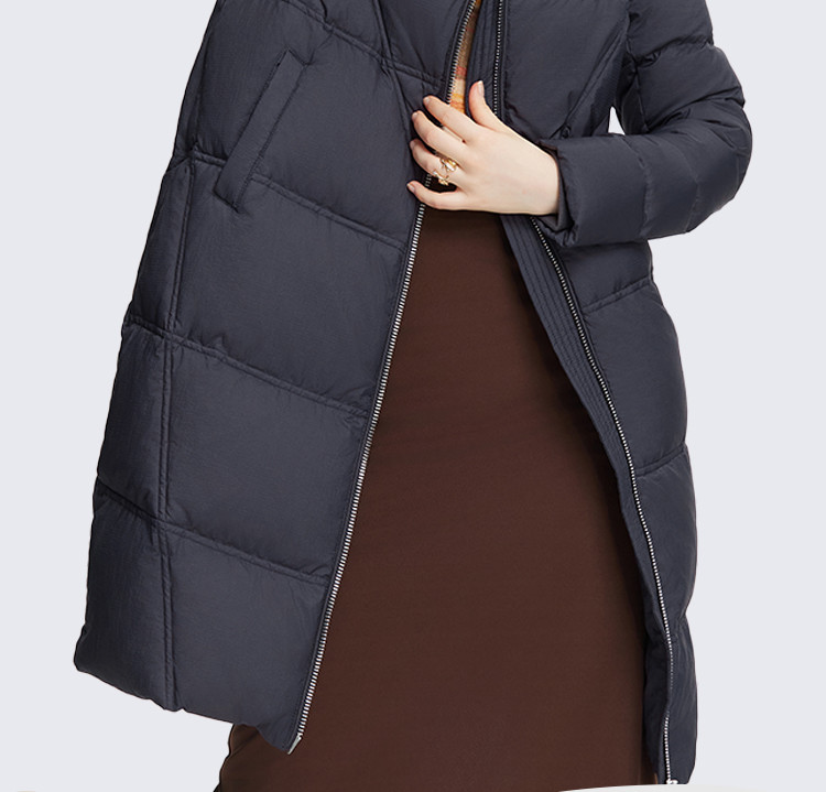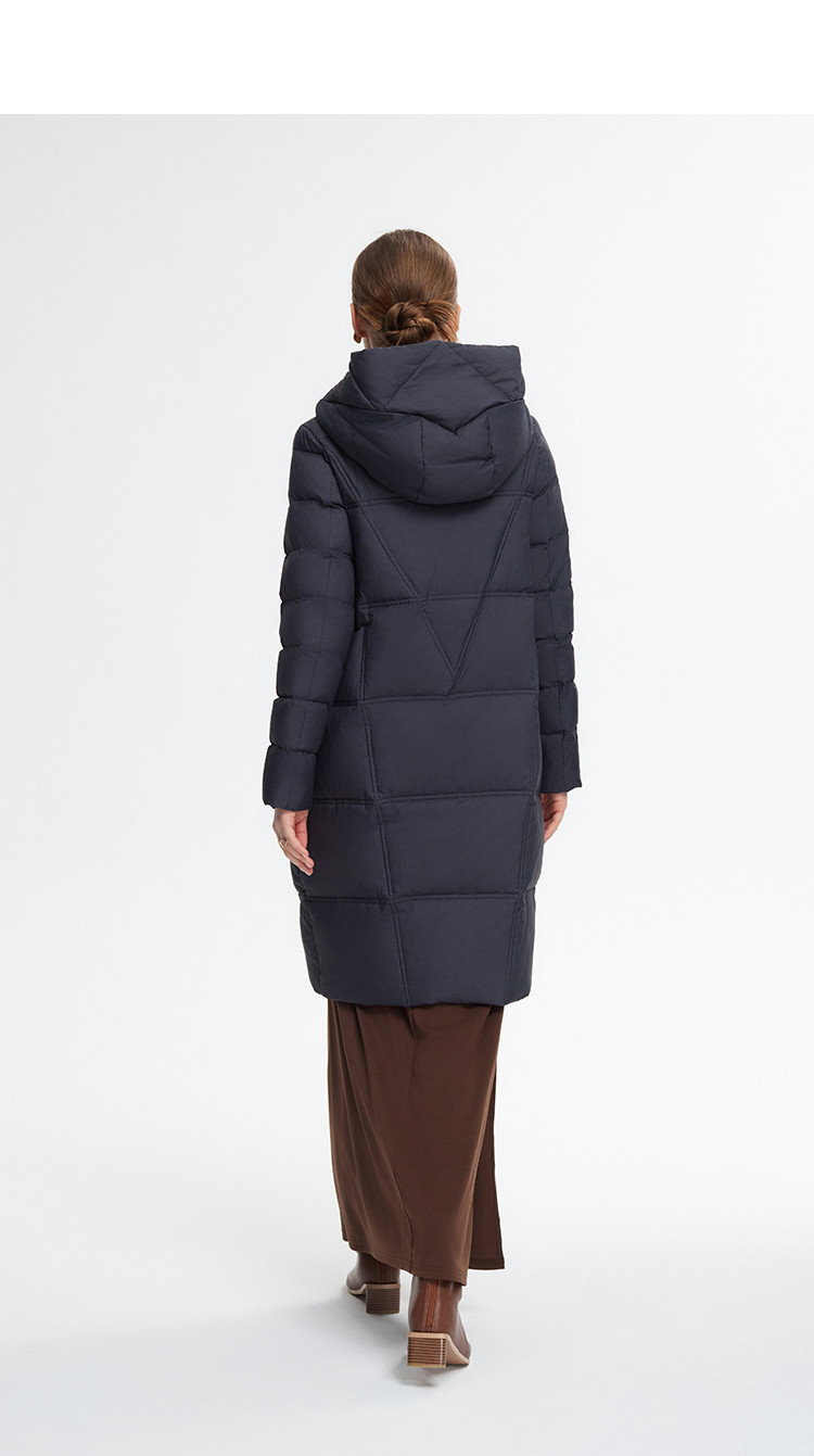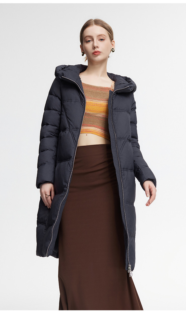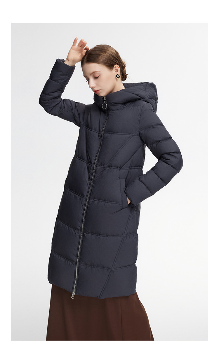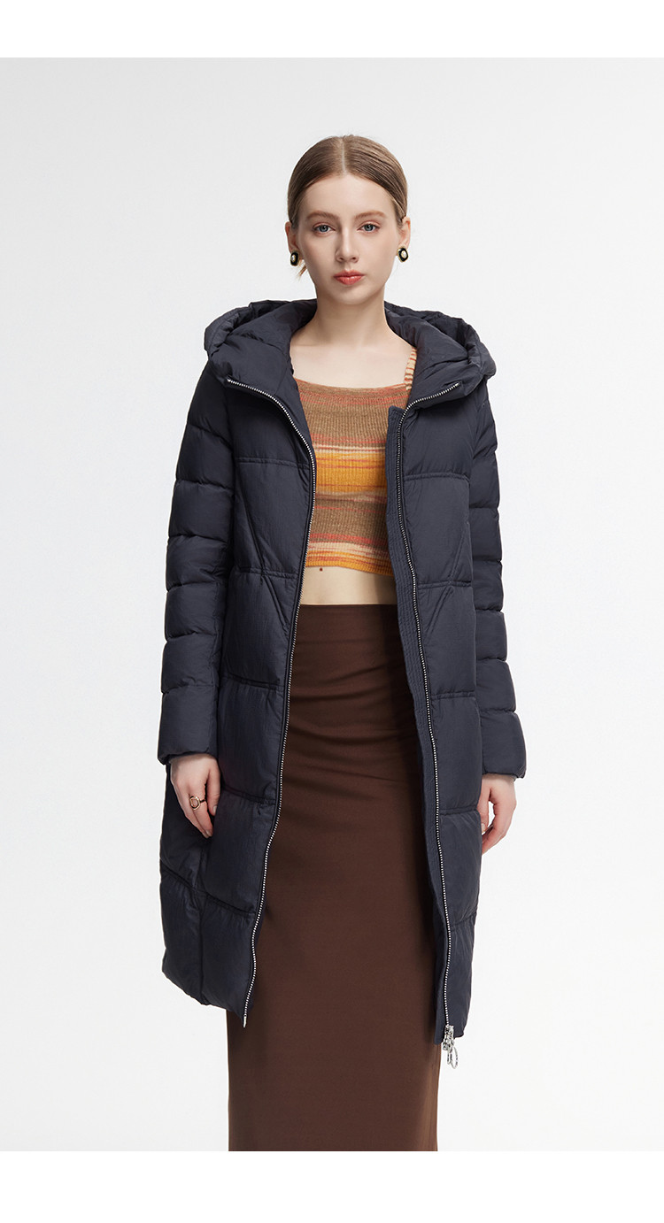 【鹅绒】气质风纯色系修身连帽加厚保暖中长款羽绒服 160159
