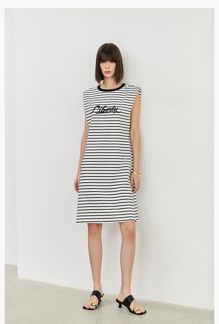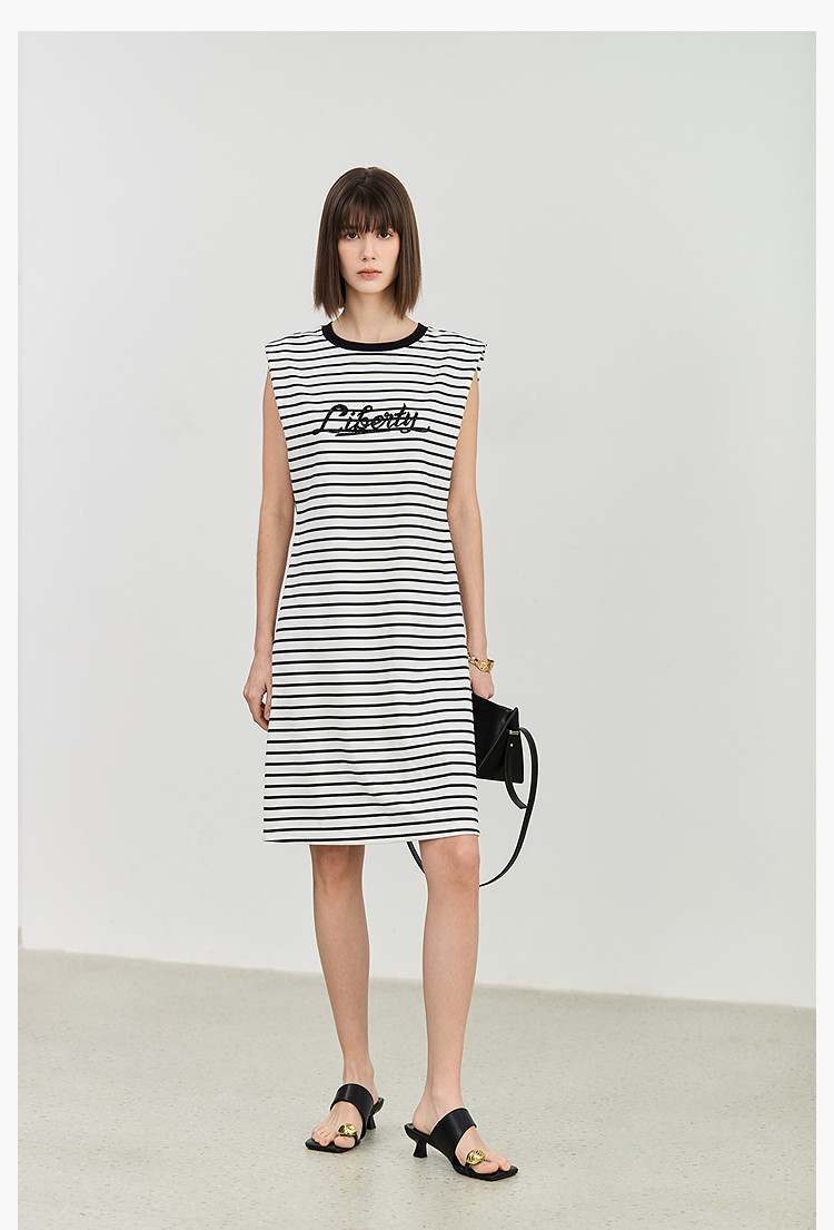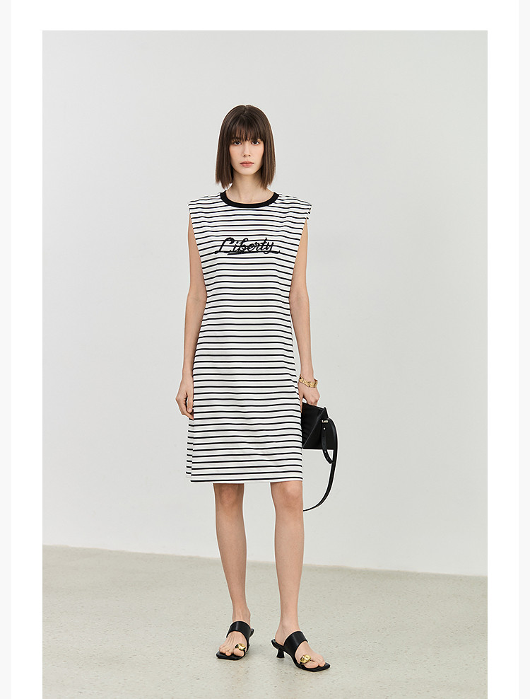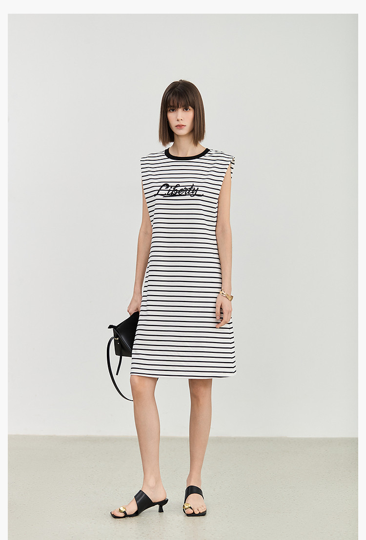 商品名称:夏季复古条纹设计感宽肩休闲通勤中长连衣裙小个子 635547