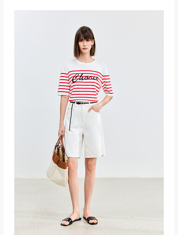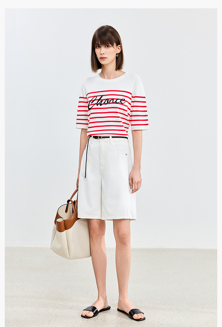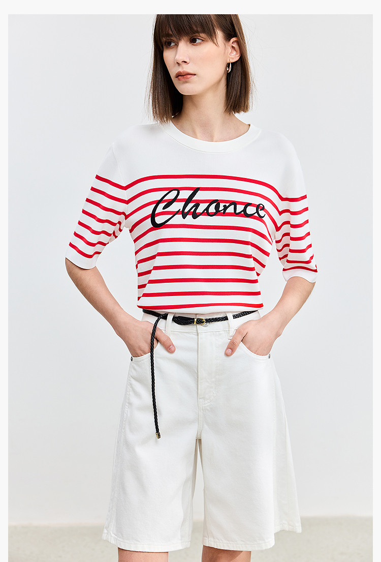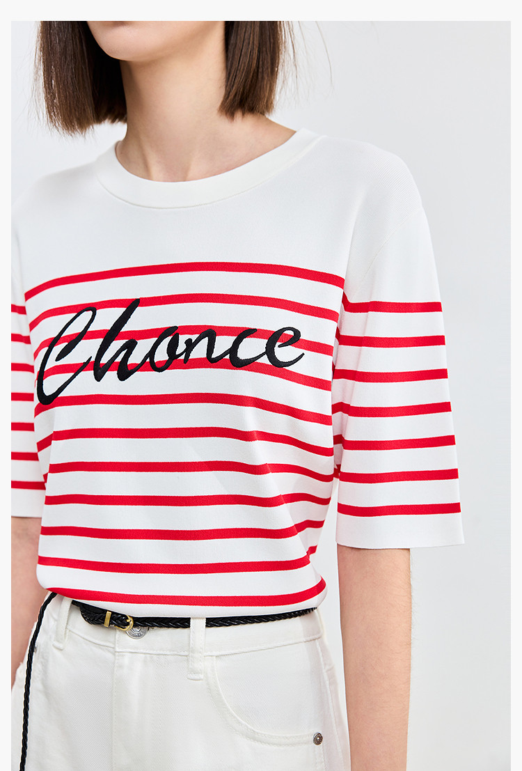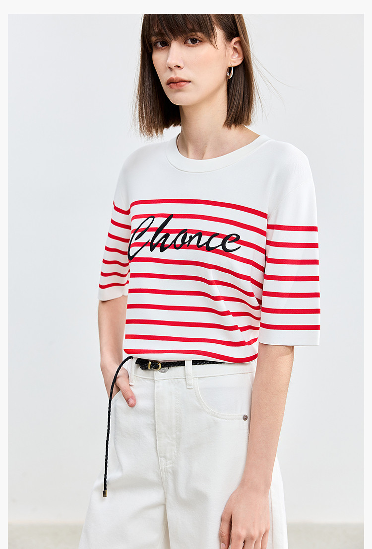 商品名称:【春季】时尚条纹前片艺术花卉字体绣花短袖针织衫 723675