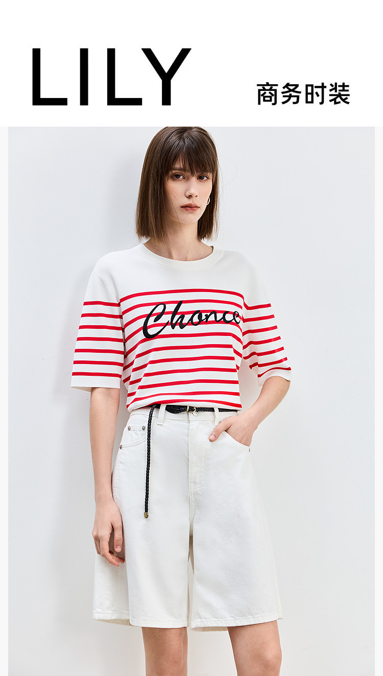 【春季】时尚条纹前片艺术花卉字体绣花短袖针织衫 723675