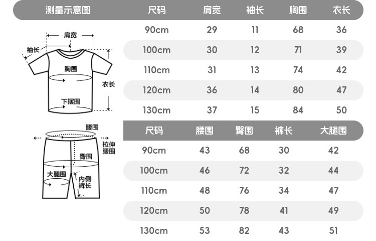 | 尺码 | 肩宽(cm) | 袖长(cm) | 适合年龄 | 衣长(cm) | 腰围(cm) | 裤长(cm) | 臀围(cm) | 胸围(cm) | 号型 |
