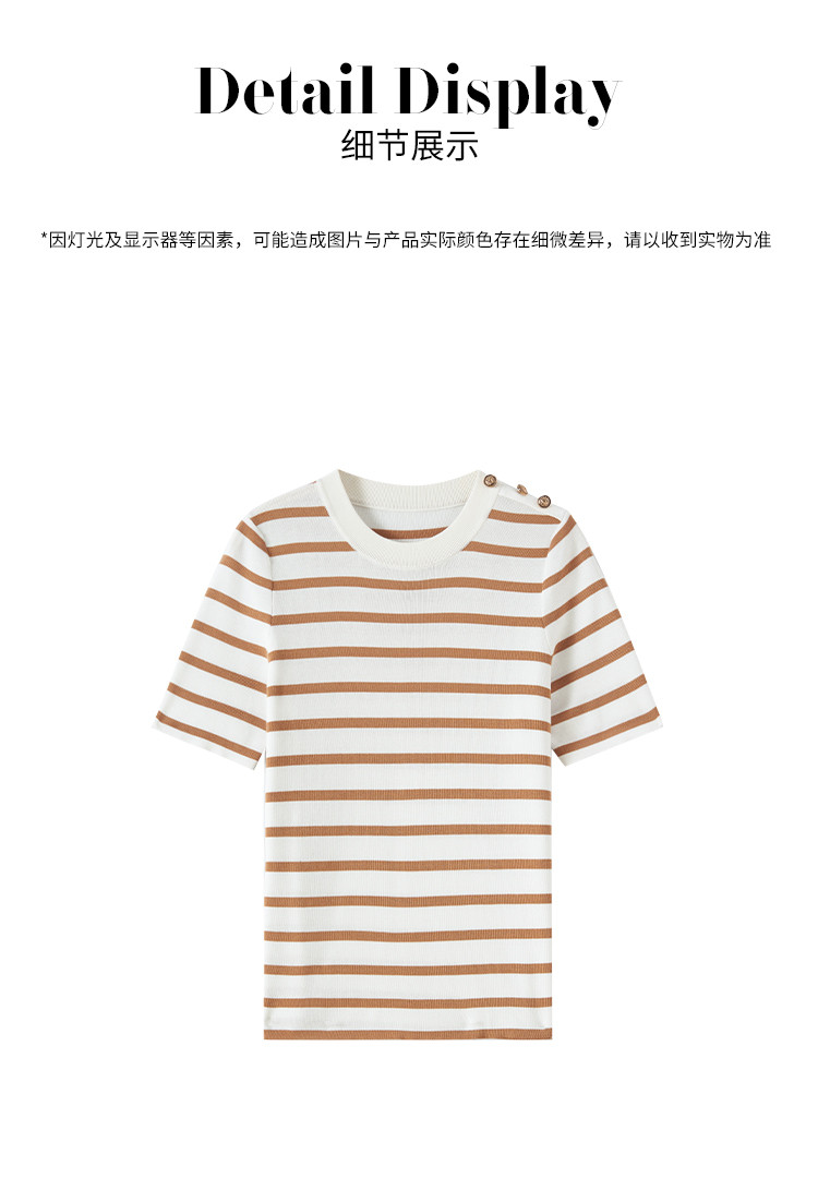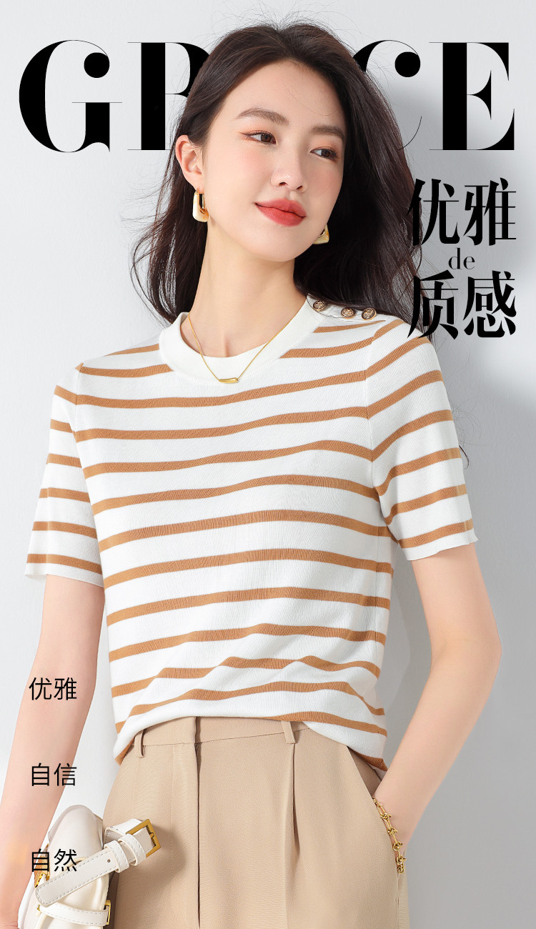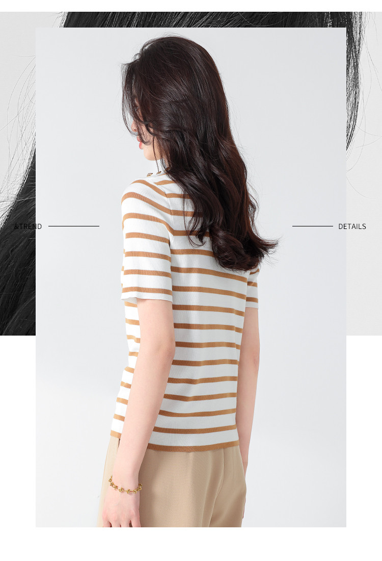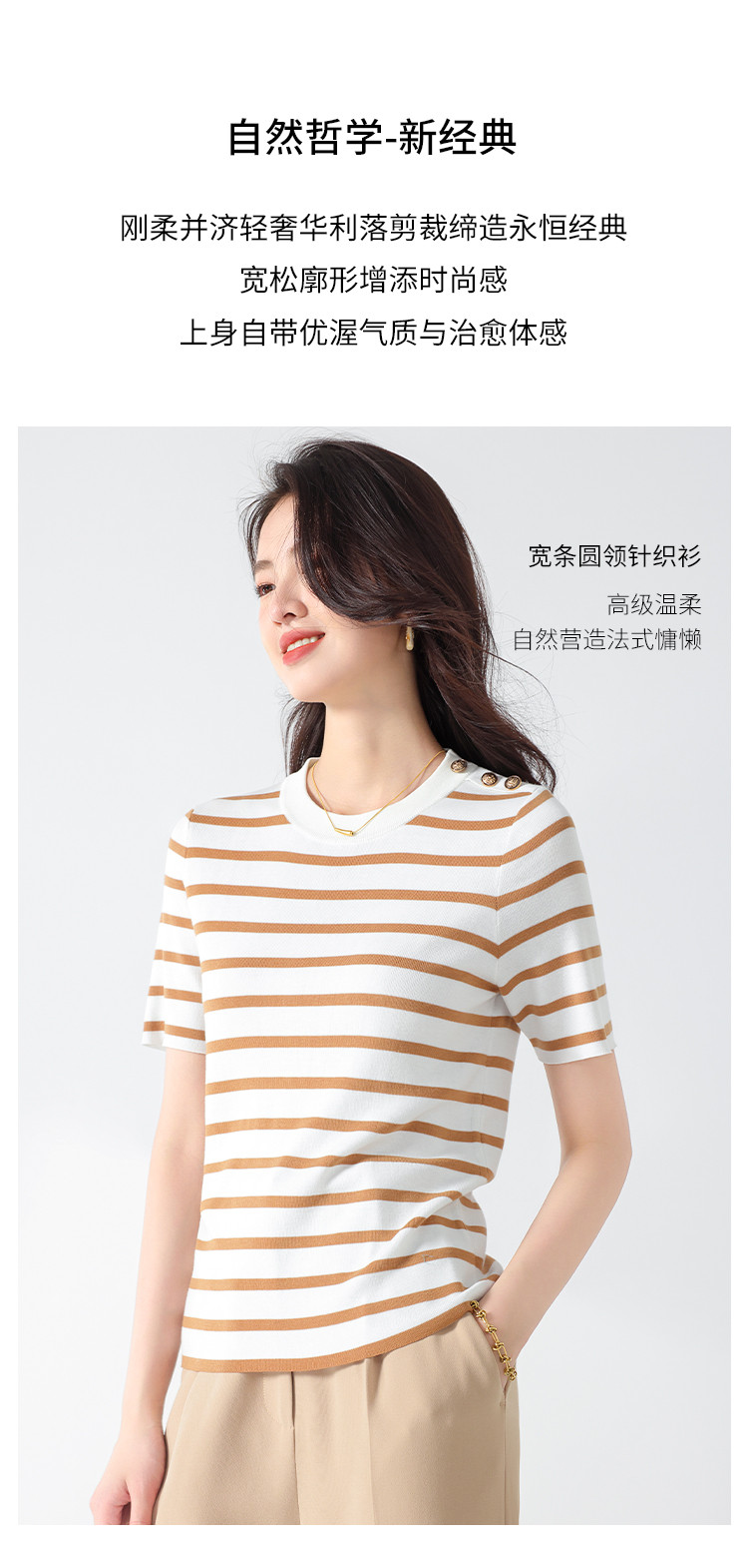 【含桑蚕丝】夏经典条纹撞色圆领短袖T恤女针织打底衫 875347